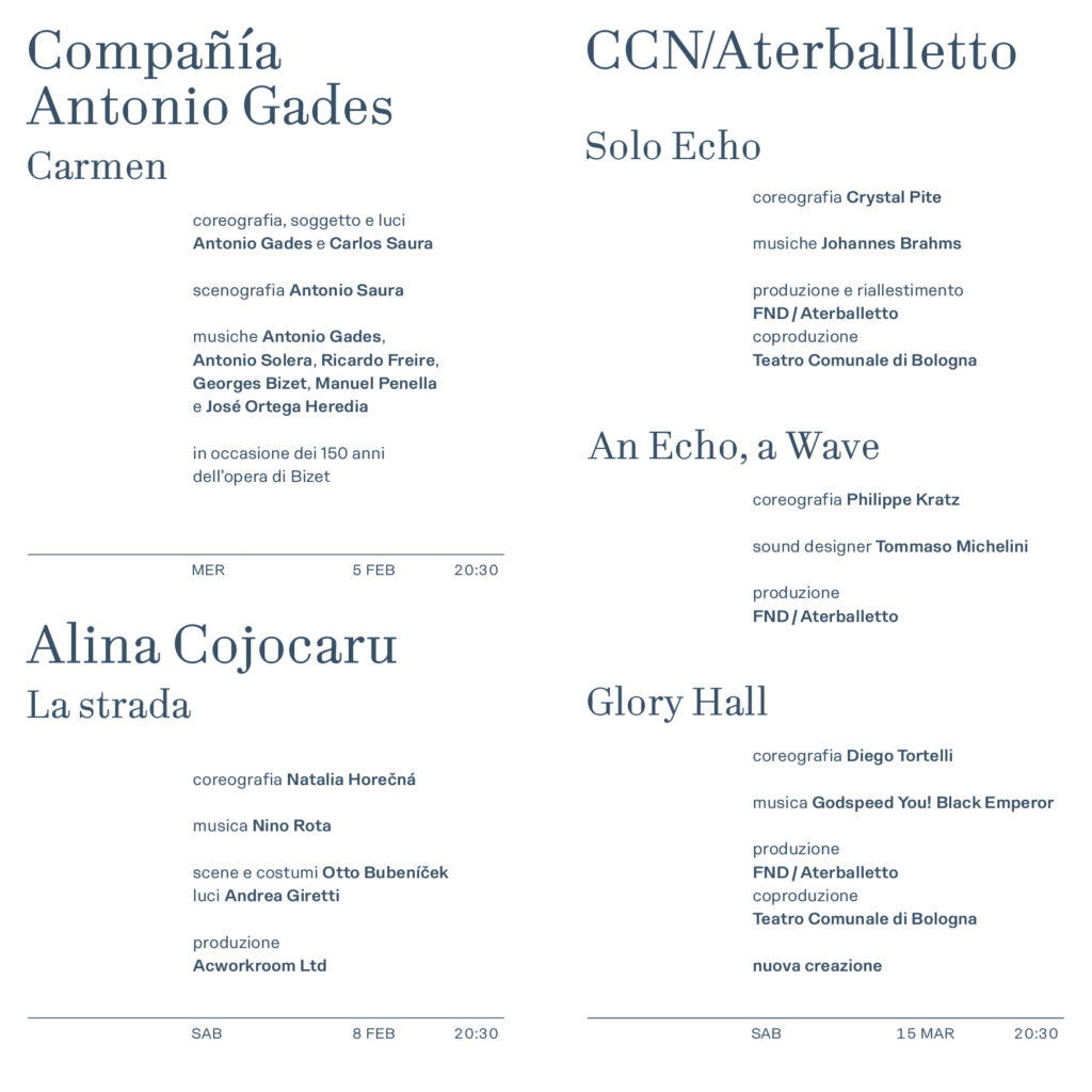 Cinque appuntamenti da febbraio a maggio con Compañia Antonio Gades, Alina Cojocaru, CCN/Aterballetto con la nuova creazione Glory Hall, Balletto di Roma con Otello in prima nazionale,