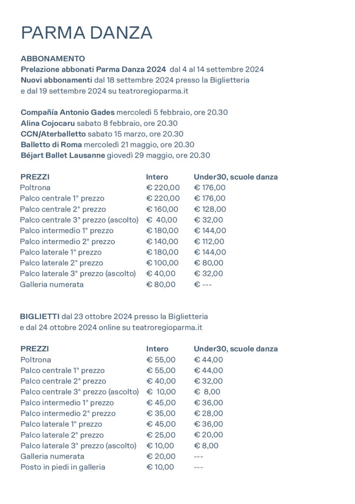 I biglietti per tutti gli spettacoli della Stagione Lirica, della Stagione Concertistica e di Parma Danza saranno in vendita dal 23 ottobre 2024 presso la Biglietteria e dal 24 ottobre 2024 online su teatroregioparma.it