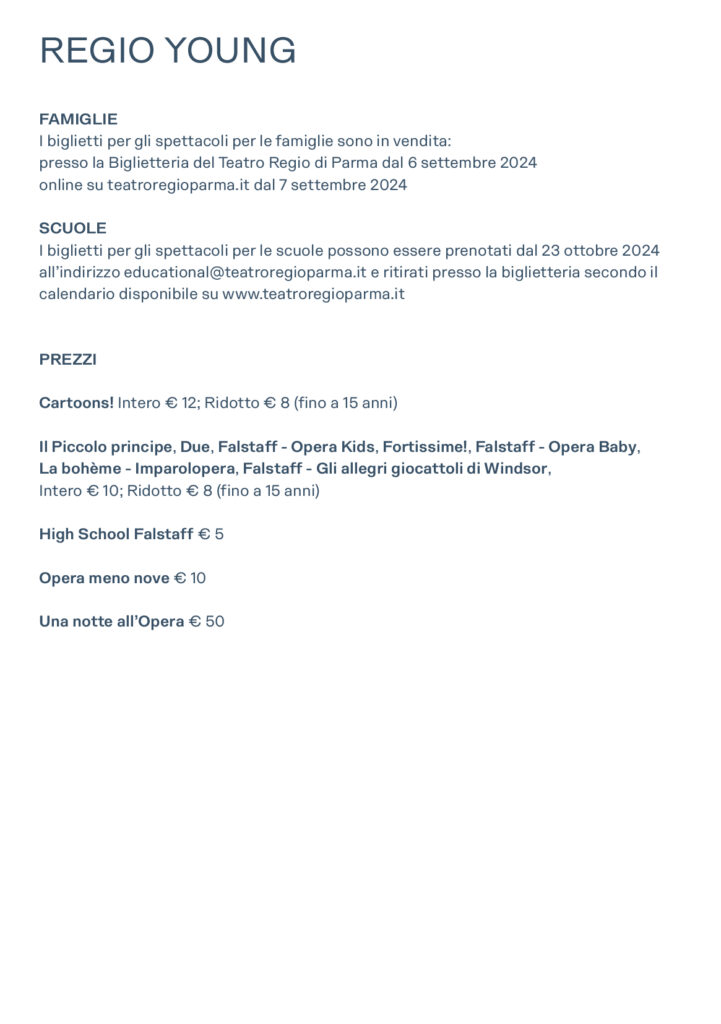 I biglietti di Regio Young per gli spettacoli per le famiglie saranno in vendita dal 6 settembre 2024 presso la Biglietteria e dal 7 settembre 2024 online su teatroregioparma.it. I biglietti per gli spettacoli per le scuole potranno invece essere prenotati a partire dal 23 ottobre 2024 all’indirizzo educational@teatroregioparma.it
