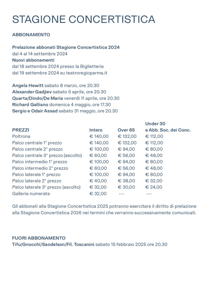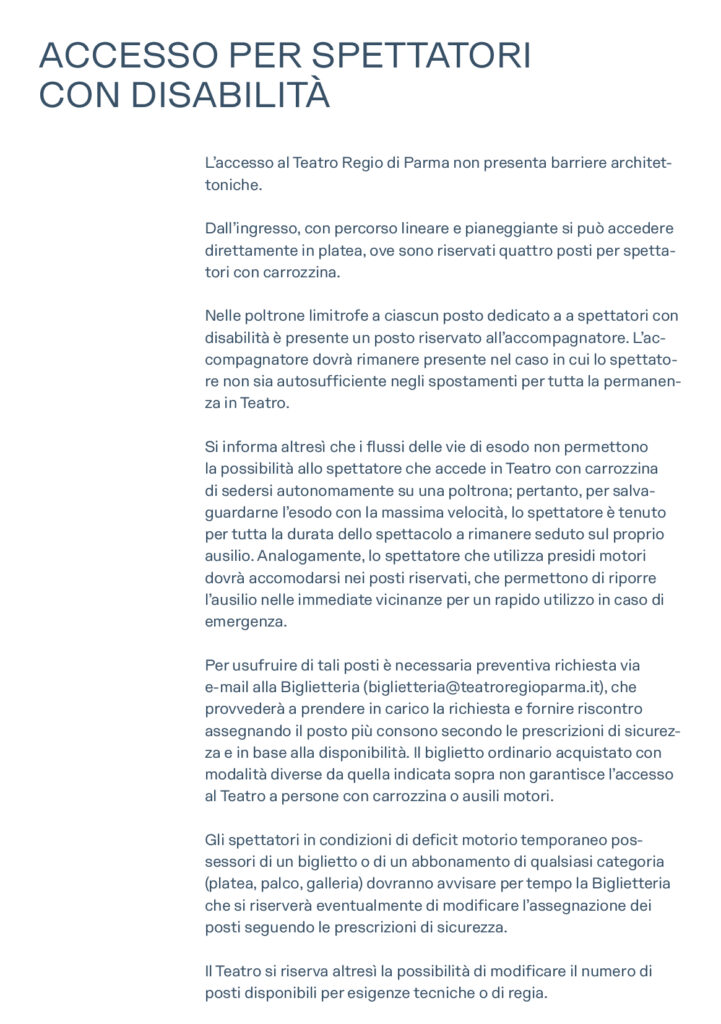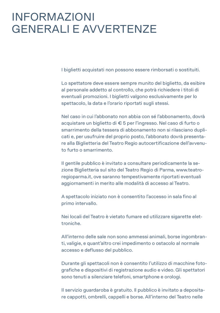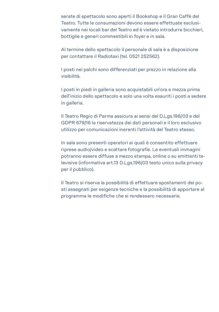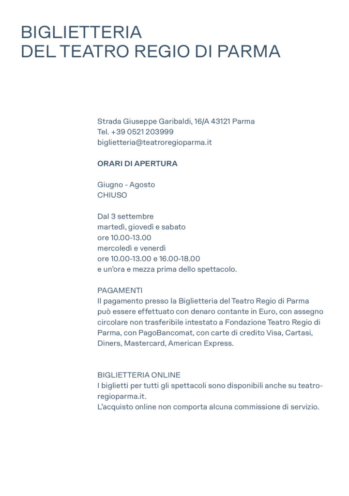Abbonamenti e biglietti per tutti gli spettacoli sono disponibili online su teatroregioparma.it. L’acquisto online non comporta alcuna commissione di servizio.
