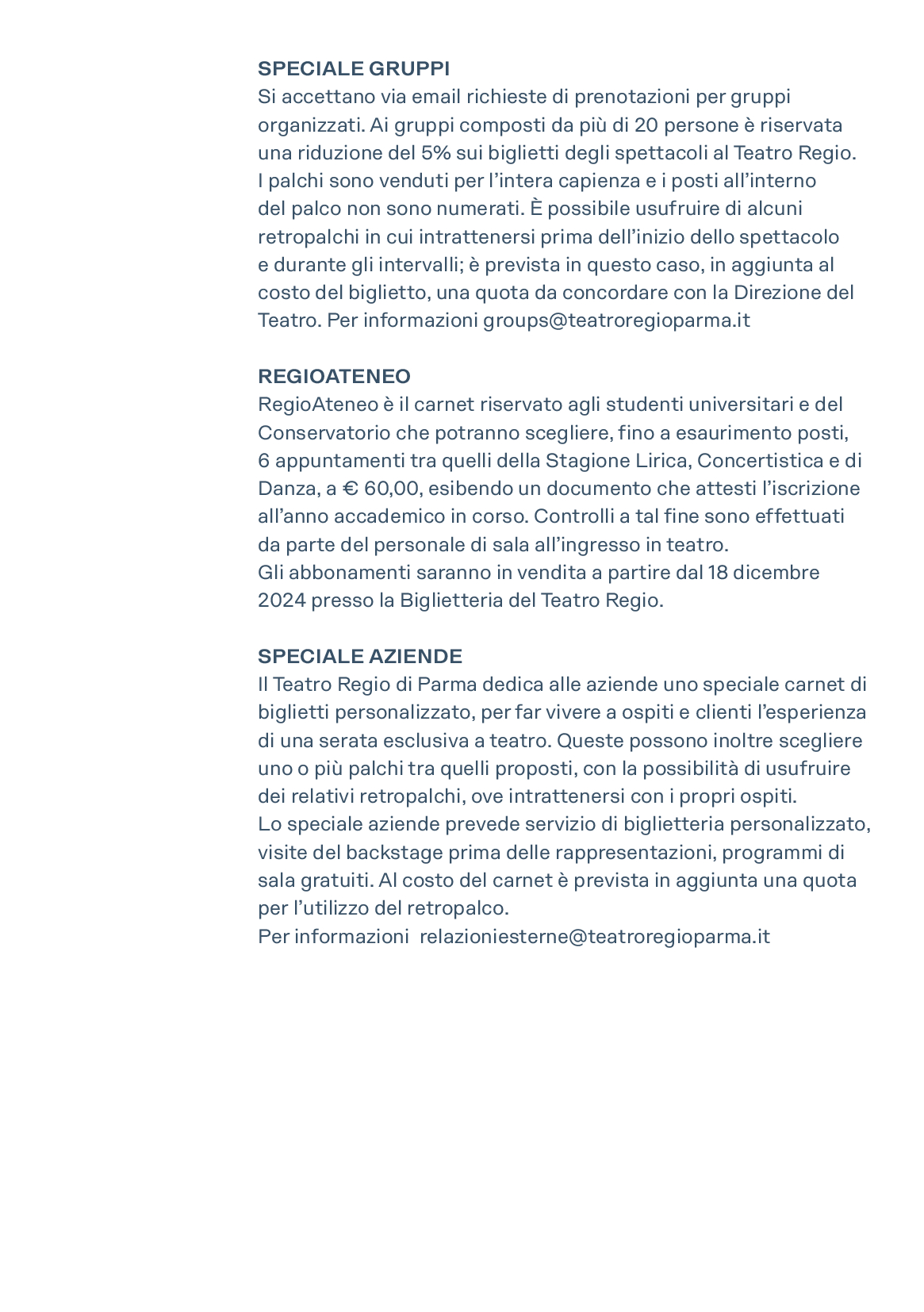 Agevolazioni e riduzioni sono rivolte a Under30, Over65, scuole di danza, famiglie, lavoratori, neomaggiorenni, studenti e docenti, studenti universitari, gruppi, aziende. Ulteriori informazioni su teatroregioparma.it