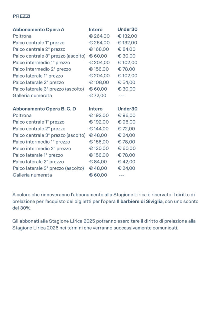 Gli abbonati alla Stagione 2024 (Lirica, Concertistica, Parma Danza) potranno esercitare la prelazione per l’acquisto del nuovo abbonamento dal 4 al 14 settembre 2024. A coloro che rinnoveranno l’abbonamento alla Stagione Lirica è riservato il diritto di prelazione per l’acquisto dei biglietti per l’opera Il barbiere di Siviglia, con una riduzione del 30%.