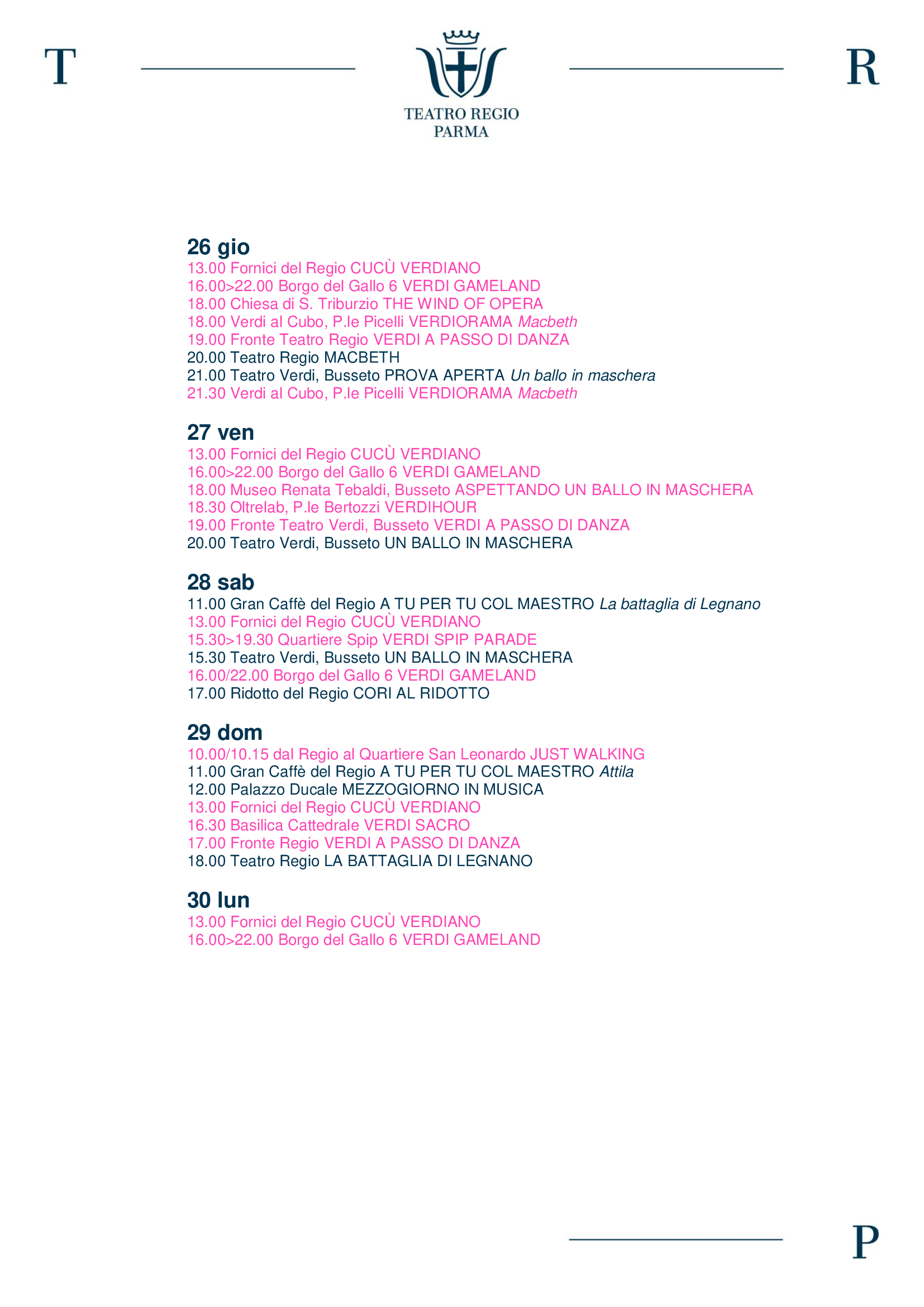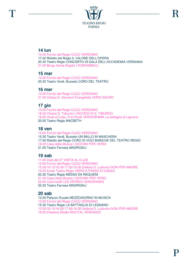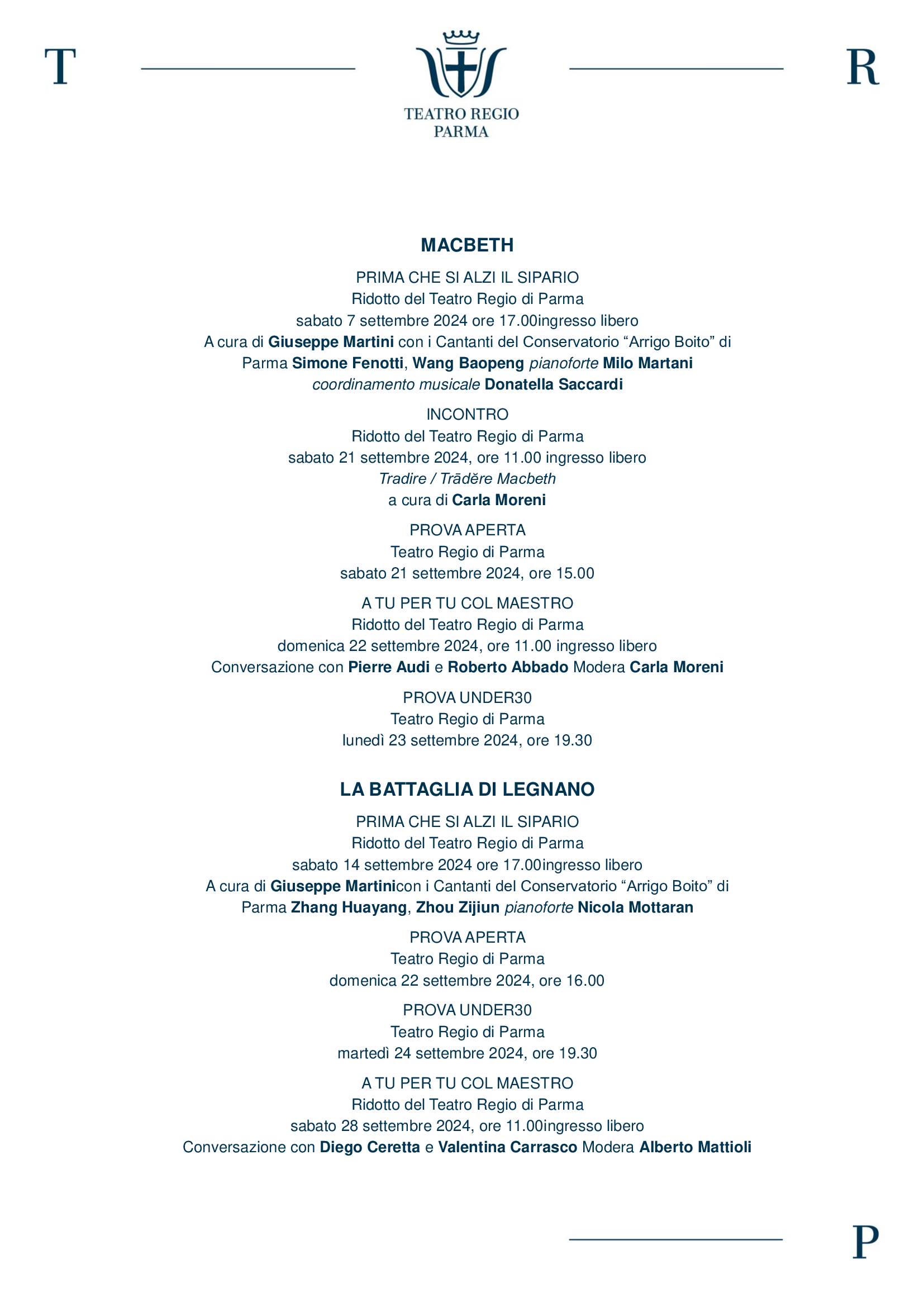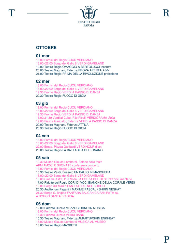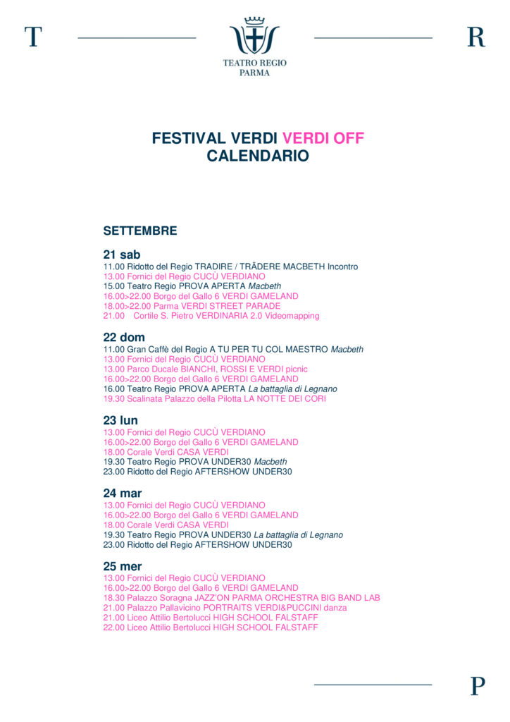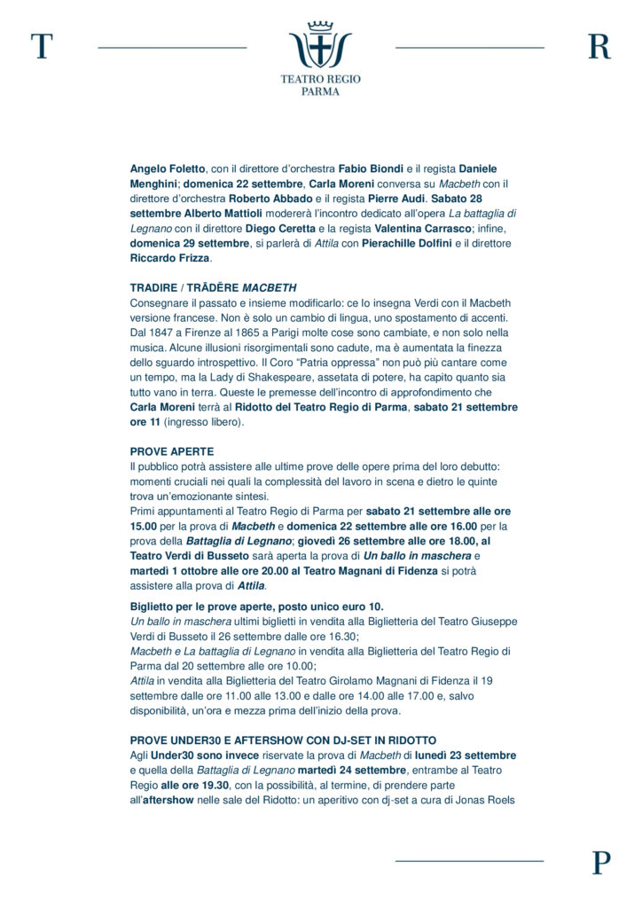 Primi appuntamenti al Teatro Regio di Parma per sabato 21 settembre alle ore 15.00 per la prova di Macbeth e domenica 22 settembre alle ore 16.00 per la prova della Battaglia di Legnano; giovedì 26 settembre alle ore 18.00, al Teatro Verdi di Busseto sarà aperta la prova di Un ballo in maschera e martedì 1° ottobre alle ore 20.00 al Teatro Magnani di Fidenza si potrà assistere alla prova di Attila.