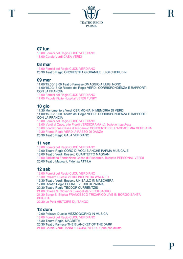 Al Festival Verdi si rinnova e rinsalda la collaborazione del Teatro Regio con La Toscanini, il Coro del Teatro Regio di Parma preparato da Martino Faggiani, e con il Teatro Comunale di Bologna, e s’intensifica la collaborazione scientifica con l’Istituto Nazionale di Studi Verdiani.