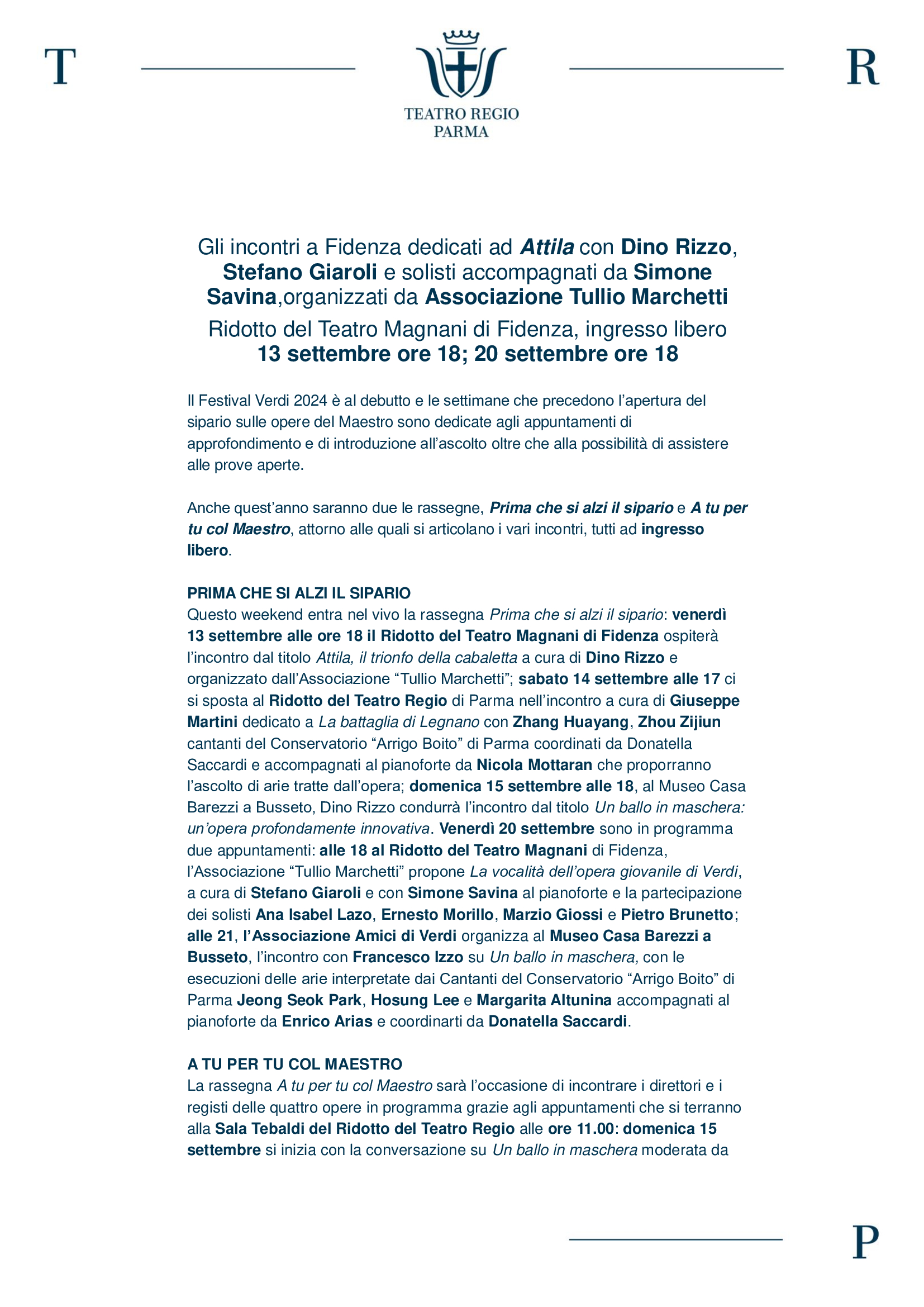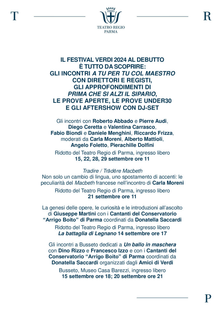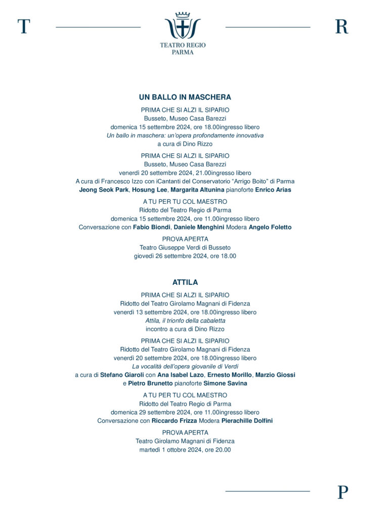 La rassegna Prima che si alzi il sipario, ha preso il viasabato 7 settembre al Ridotto del Teatro Regio con l’appuntamento dedicato a Macbeth a cura di Giuseppe Martini, con la partecipazione degli allievi del Conservatorio di Musica “Arrigo Boito” di Parma che hanno eseguito dal vivo i brani più celebri dell’opera, coordinati da Donatella Saccardi.Si è proseguito venerdì 13 settembre al Ridotto del Teatro Magnani di Fidenza con l’incontro dal titolo Attila, il trionfo della cabaletta a cura di Dino Rizzo e organizzato dall’Associazione “Tullio Marchetti”; sabato 14 settembre alle 17 al Ridotto del Teatro Regio di Parma nell’incontro a cura di Giuseppe Martini dedicato a La battaglia di Legnano con Zhang Huayang e Zhou Zijiun, cantanti del Conservatorio “Arrigo Boito” di Parma, coordinati da Donatella Saccardi e accompagnati al pianoforte da Nicola Mottaran; domenica 15 settembre alle 18, al Museo Casa Barezzi a Busseto, Dino Rizzo ha condotto l’incontro dal titolo Un ballo in maschera: un’opera profondamente innovativa.