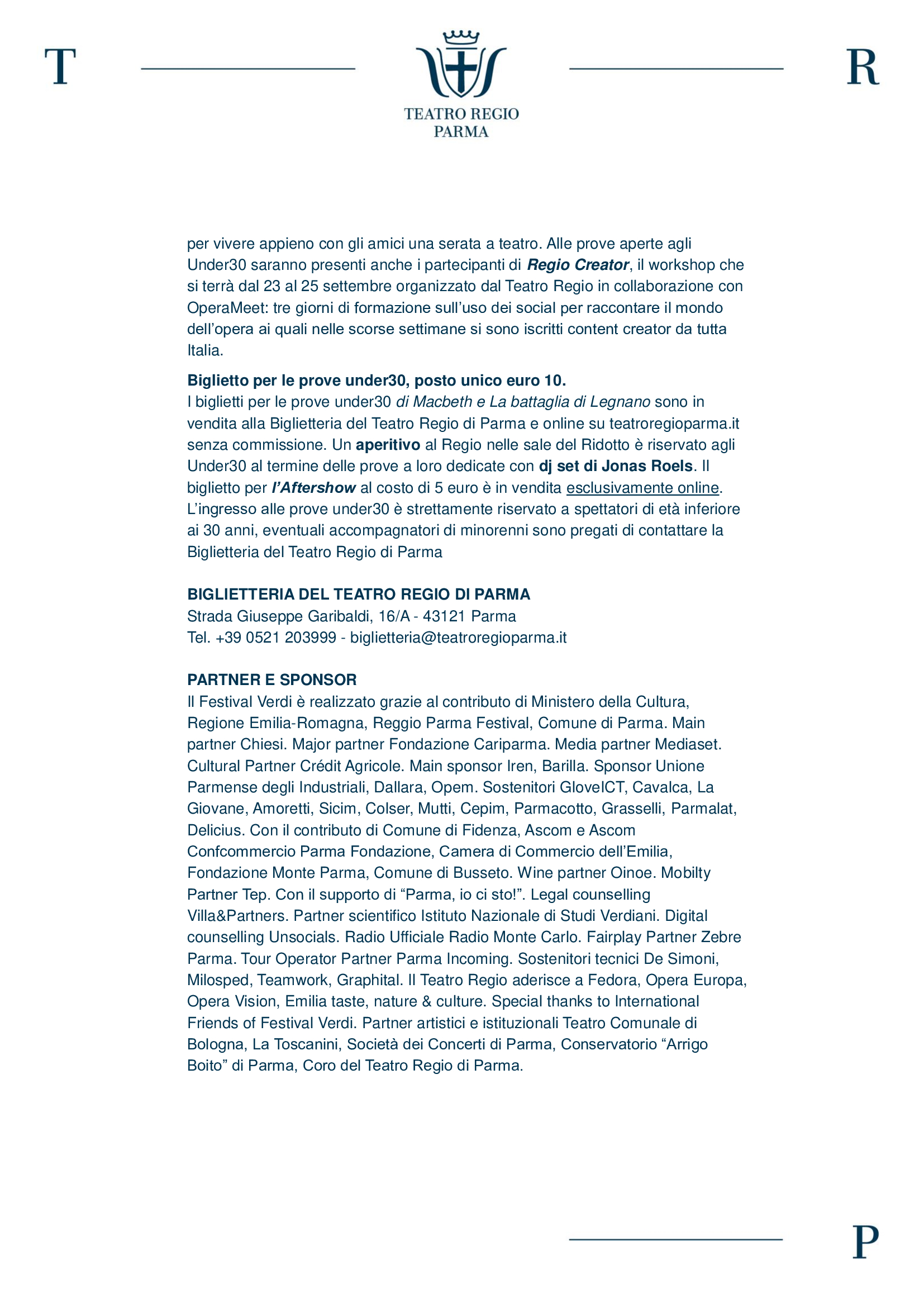 Il Festival Verdi è realizzato grazie al contributo di Ministero della Cultura, Regione Emilia-Romagna, Reggio Parma Festival, Comune di Parma. Main partner Chiesi. Major partner Fondazione Cariparma. Media partner Mediaset. Cultural Partner Crédit Agricole. Main sponsor Iren, Barilla. Sponsor Unione Parmense degli Industriali, Dallara, Opem. Sostenitori GloveICT, Cavalca, La Giovane, Amoretti, Sicim, Colser, Mutti, Cepim, Parmacotto, Grasselli, Parmalat, Delicius. Con il contributo di Comune di Fidenza, Ascom e Ascom Confcommercio Parma Fondazione, Camera di Commercio dell’Emilia, Fondazione Monte Parma, Comune di Busseto. Wine partner Oinoe. Mobilty Partner Tep. Con il supporto di “Parma, io ci sto!”. Legal counselling Villa&Partners. Partner scientifico Istituto Nazionale di Studi Verdiani. Digital counselling Unsocials. Radio Ufficiale Radio Monte Carlo. Fairplay Partner Zebre Parma. Tour Operator Partner Parma Incoming. Sostenitori tecnici De Simoni, Milosped, Teamwork, Graphital. Il Teatro Regio aderisce a Fedora, Opera Europa, Opera Vision, Emilia taste, nature & culture. Special thanks to International Friends of Festival Verdi. Partner artistici e istituzionali Teatro Comunale di Bologna, La Toscanini, Società dei Concerti di Parma, Conservatorio “Arrigo Boito” di Parma, Coro del Teatro Regio di Parma.