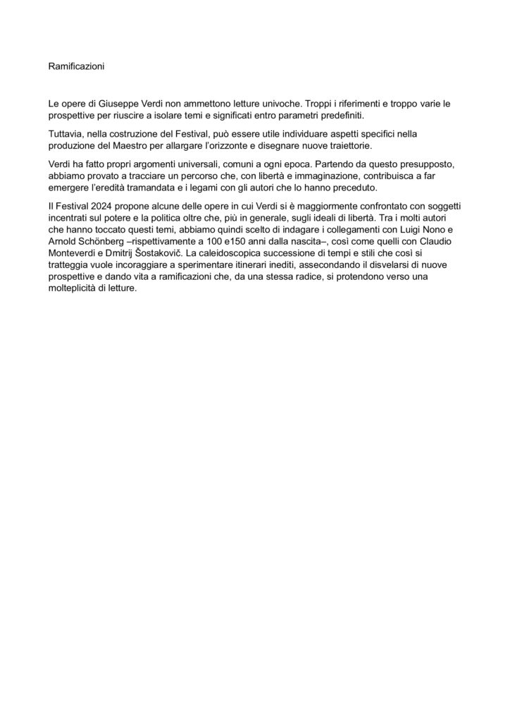 “Le opere di Giuseppe Verdi non ammettono letture univoche – scrive Alessio Vlad, Direttore artistico del Festival Verdi. Troppi i riferimenti e troppo varie le prospettive per riuscire a isolare temi e significati entro parametri univoci. Tuttavia, nella costruzione del Festival, può essere utile individuare aspetti specifici nella produzione del Maestro per allargare l’orizzonte e disegnare nuove traiettorie. Verdi ha fatto propri argomenti universali, comuni a ogni epoca. Partendo da questo presupposto, abbiamo provato a tracciare un percorso che, con libertà e immaginazione, contribuisca a far emergere l’eredità tramandata e i legami con gli autori che lo hanno preceduto. La nuova sezione del Festival che inaugura quest’anno prende proprio spunto dal filo conduttore delle opere in cartellone: potere, politica, libertà. Tra i molti autori che hanno toccato questi temi, abbiamo quindi scelto di indagare i collegamenti con Luigi Nono e Arnold Schönberg, così come quelli con Claudio Monteverdi e Dmitrij Šostakóvič. La caleidoscopica successione di tempi e stili che così si tratteggia vuole incoraggiare a sperimentare itinerari inediti, assecondando il disvelarsi di nuove prospettive e dando vita a ramificazioni che, da una stessa radice, si protendono verso una molteplicità di letture”.
