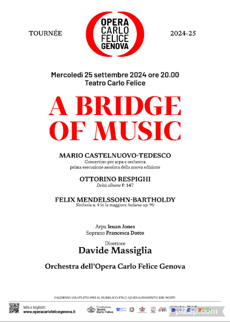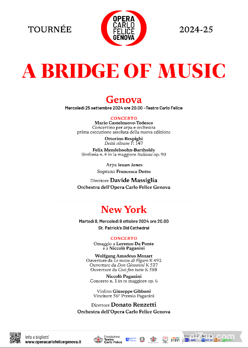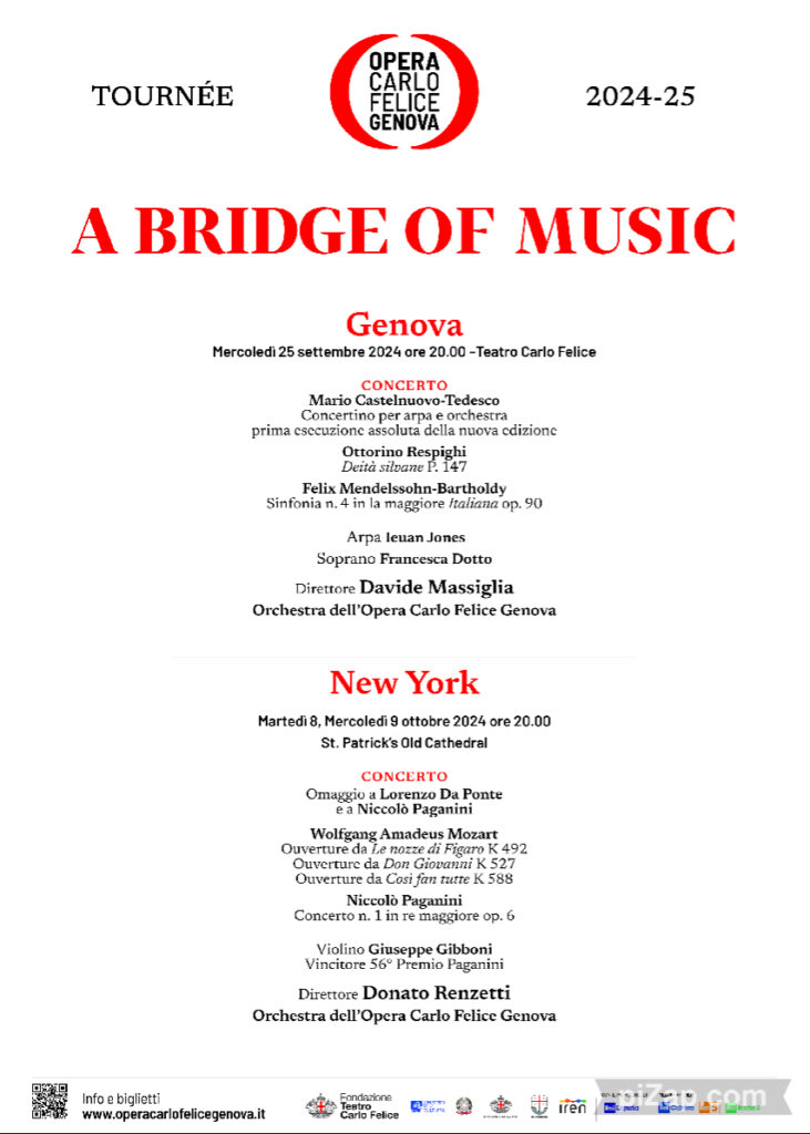 A Bridge of Music è un progetto culturale internazionale ideato dal Sovrintendente Claudio Orazi nel 2016 con lo scopo di valorizzare la musica quale volano della diplomazia culturale tra l’Italia e gli Stati Uniti. Nel 2025 ricorrerà il bicentenario dell’esecuzione della prima opera lirica italiana degli Stati Uniti (Il barbiere di Siviglia, novembre 1825). In vista delle celebrazioni per tale significativo appuntamento e dopo il successo della programmazione dedicata del 2023, l’Opera Carlo Felice propone una tournée 2024 che si inaugura a Genova con il concerto diretto da Davide Massiglia, per proseguire attraverso un ponte ideale fino a New York, dove Donato Renzetti – direttore emerito del Teatro –, l’Orchestra dell’Opera Carlo Felice e il violinista Giuseppe Gibboni (vincitore del 56° Premio Paganini) saranno protagonisti di un concerto in doppia data (martedì 8 e mercoledì 9 ottobre alle ore 20.00 alla Saint Patrick’s Old Cathedral) dedicato a Lorenzo Da Ponte e a Niccolò Paganini con musiche di Mozart e Paganini.