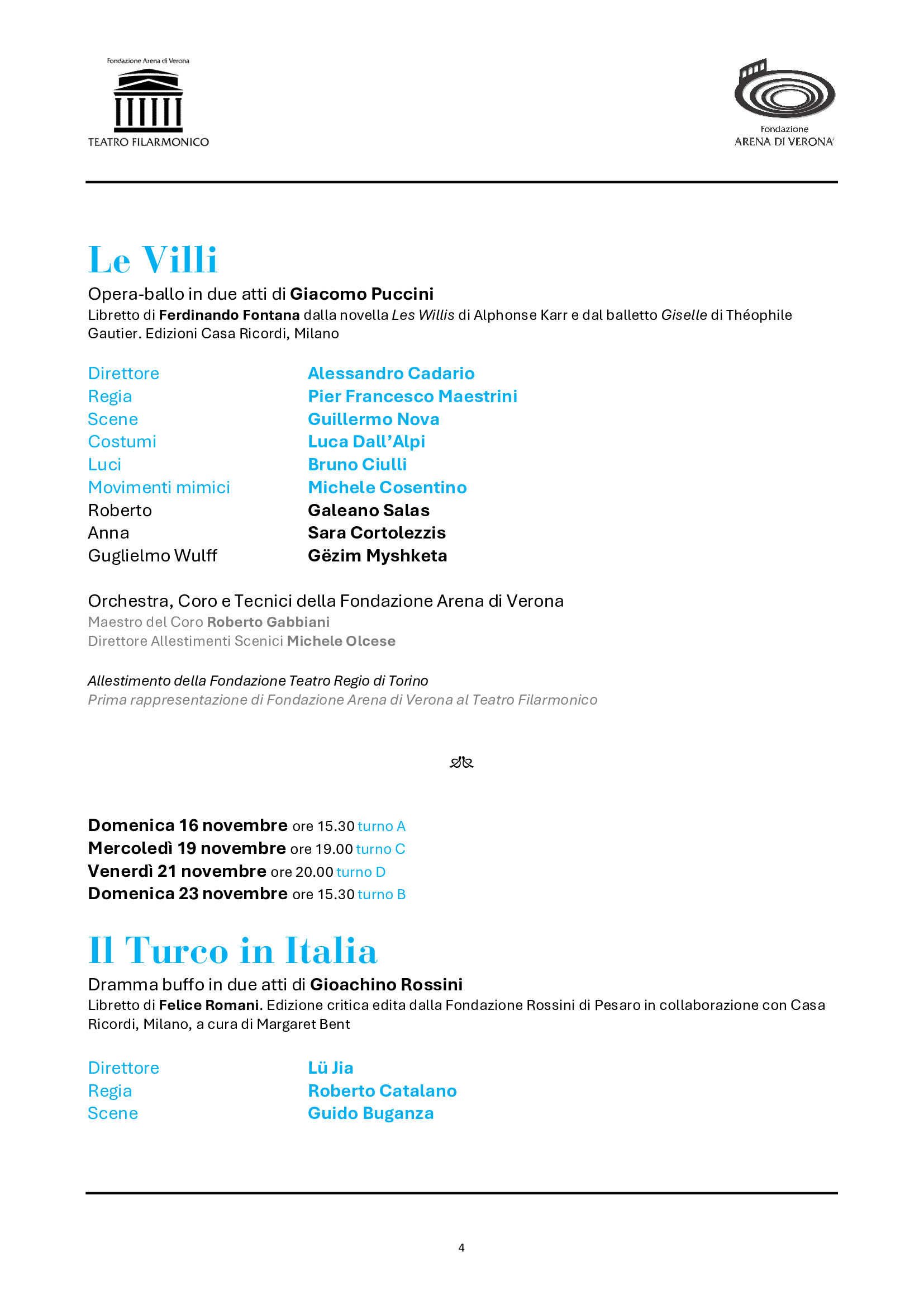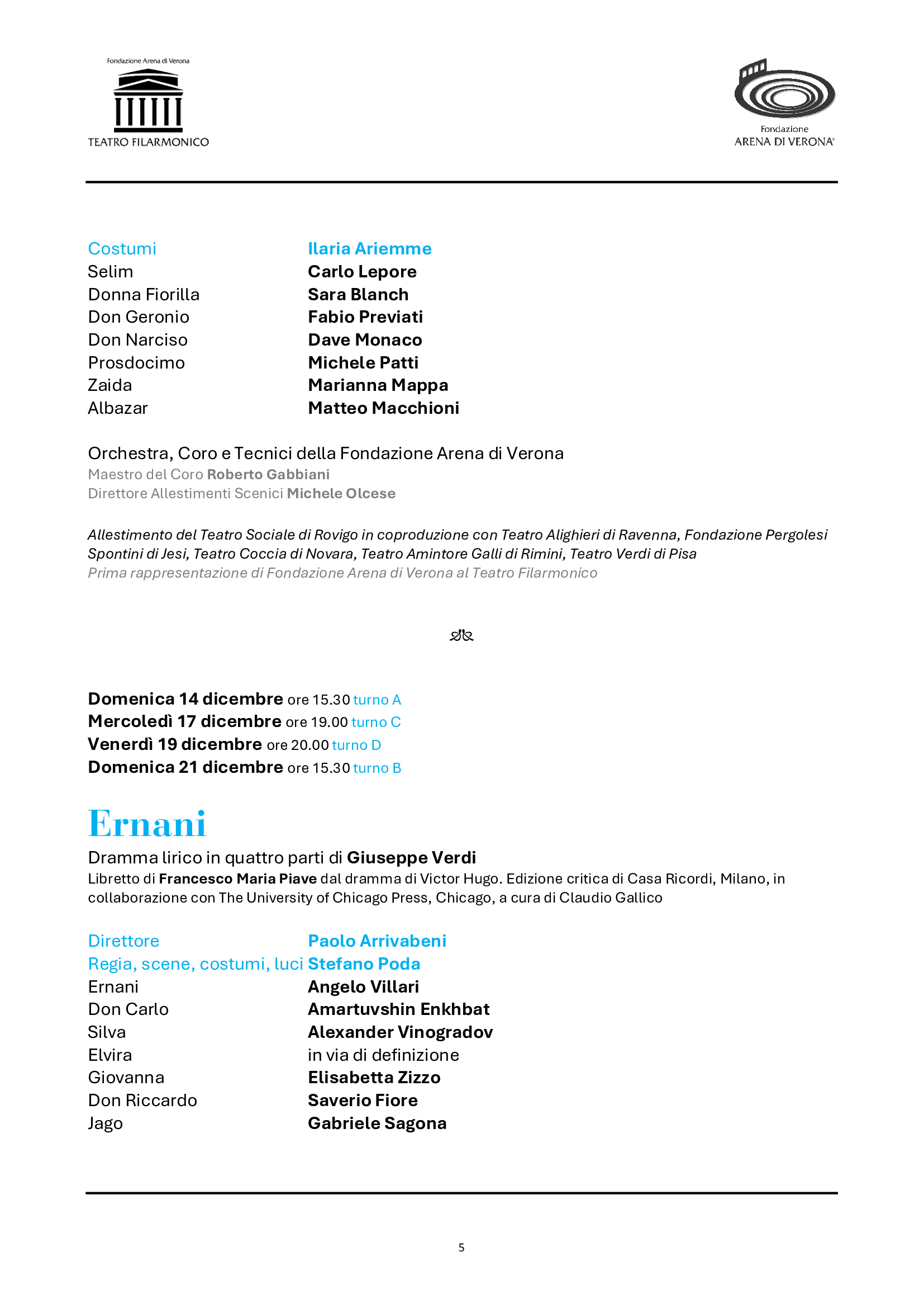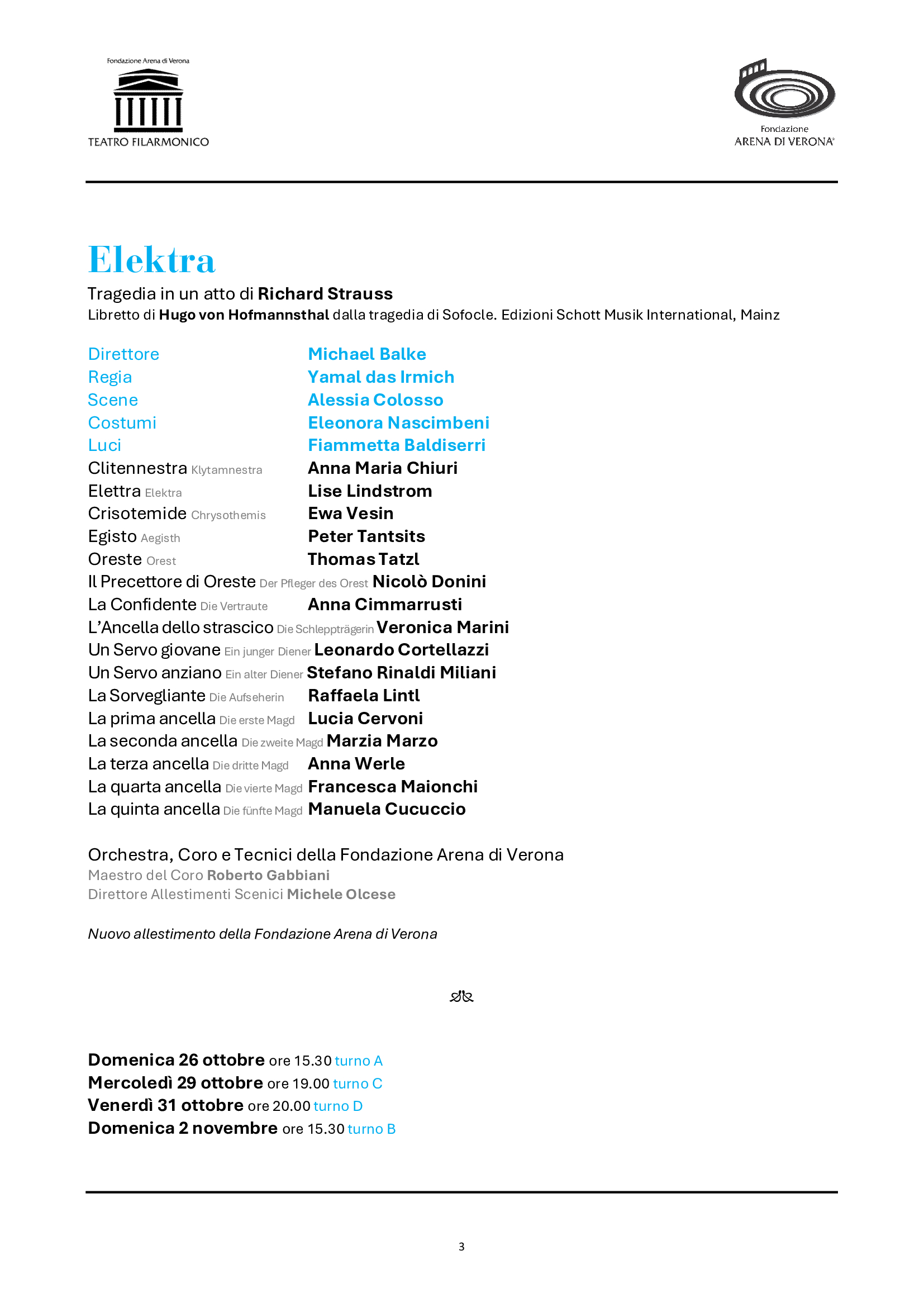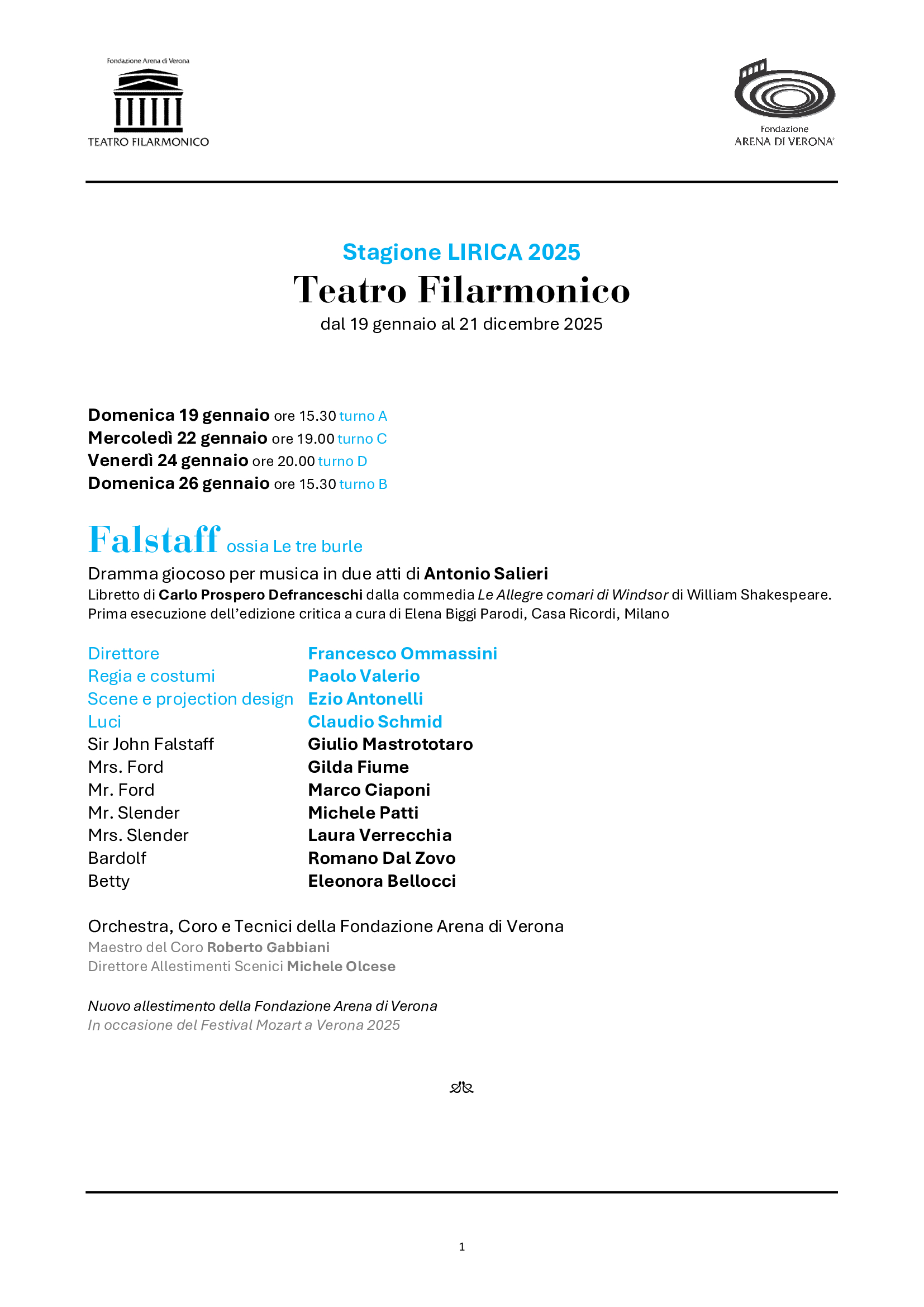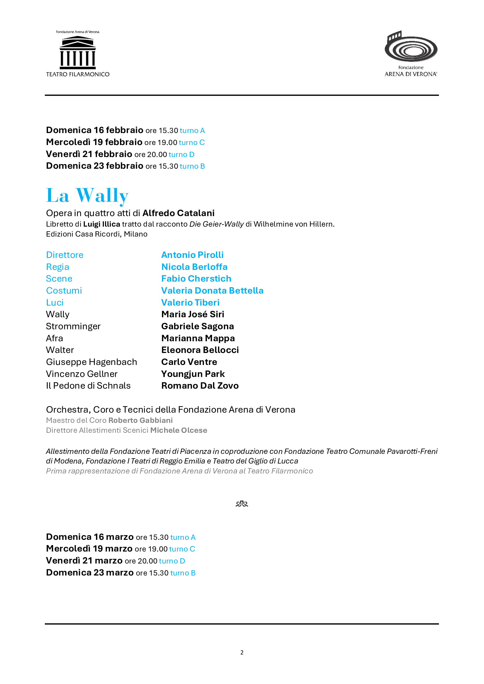 Il cartellone della Stagione Lirica prenderà il via in gennaio (dal 19 al 26), con un allestimento tutto nuovo di Falstaff di Antonio Salieri, l’opera che riaprì il Teatro cinquant’anni fa. Alla guida della nuova produzione, inserita nel Festival Mozart a Verona, sarà Paolo Valerio. Dal 16 al 23 febbraio un grande titolo della “Giovane Scuola” per la prima volta nell’ultimo mezzo secolo di spettacoli al Teatro Filarmonico: La Wally del poco ricordato ma valoroso Alfredo Catalani, nell’allestimento dei teatri lirici emiliani, con interpreti di pregio quali Maria José Siri, Carlo Ventre, Youngjun Park. Dal 16 al 23 marzo tornerà un’opera fondamentale della letteratura e della musica del primissimo ‘900, Elektra di Richard Strauss. Una nuova produzione, a ventitré anni dall’unica programmazione nei cartelloni di Fondazione Arena, firmata da Yamal Das Irmich, con Lise Lindstrom, Ewa Vesin e Anna Maria Chiuri. Dopo la primavera sinfonica e il 102° Festival areniano, dal 26 ottobre al 2 novembre proseguirà la riscoperta dei titoli meno noti di Giacomo Puccini: anche Le Villi sarà una prima volta per le scene di Fondazione Arena, qui nell’allestimento del Regio di Torino. Dal 16 al 23 novembre, altro debutto, il pubblico scoprirà un capolavoro buffo di Rossini, Il Turco in Italia, nell’applaudita coproduzione guidata da Rovigo con Carlo Lepore e Sara Blanch. Infine, dal 14 al 21 dicembre, il Verdi giovanile (anch’esso rappresentato una sola volta al Filarmonico, e una sola in Arena nel ‘72) con Ernani, in una nuova produzione di Stefano Poda con Amartuvshin Enkhbat, Angelo Villari e Alexander Vinogradov. I cast vocali e i team creativi coinvolgeranno il meglio dei giovani e del panorama attuale, offrendo prestigiosi debutti al Filarmonico. Fra i direttori, ritorneranno i maestri Pirolli, Balke, Ommassini, Cadario, Lü Jia, Arrivabeni.