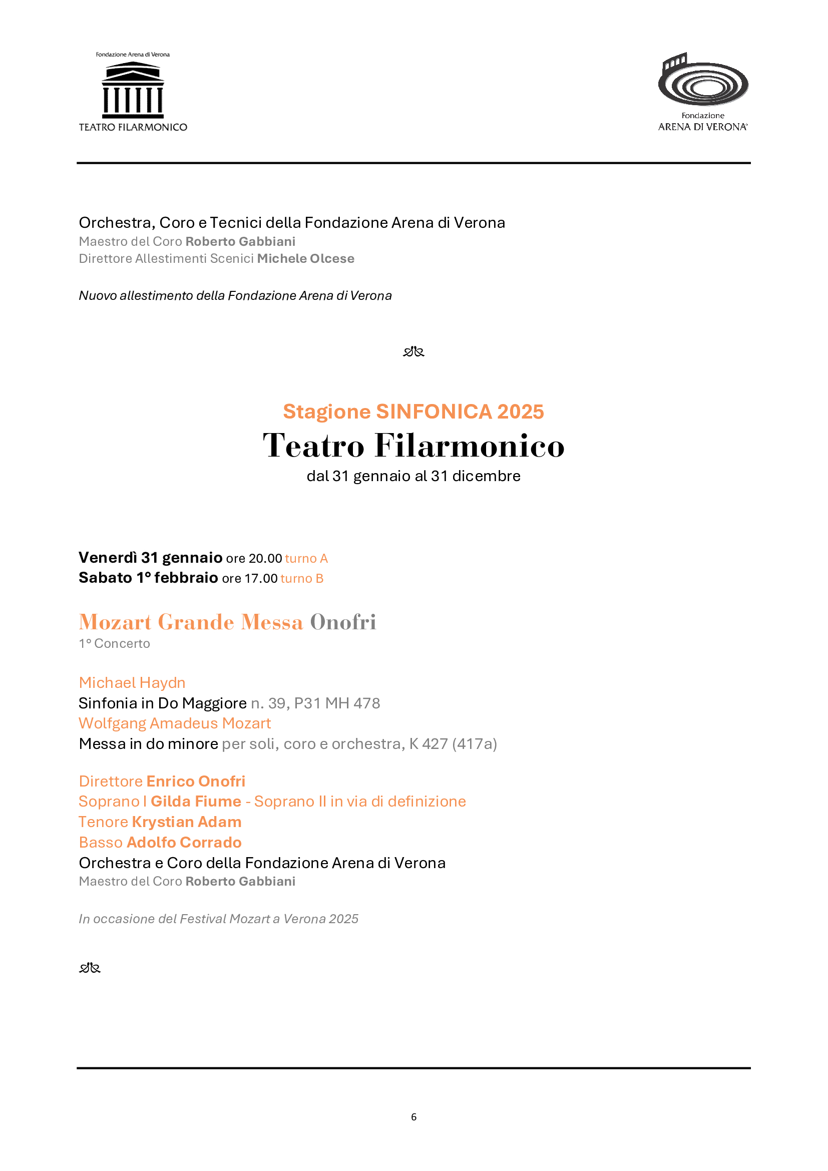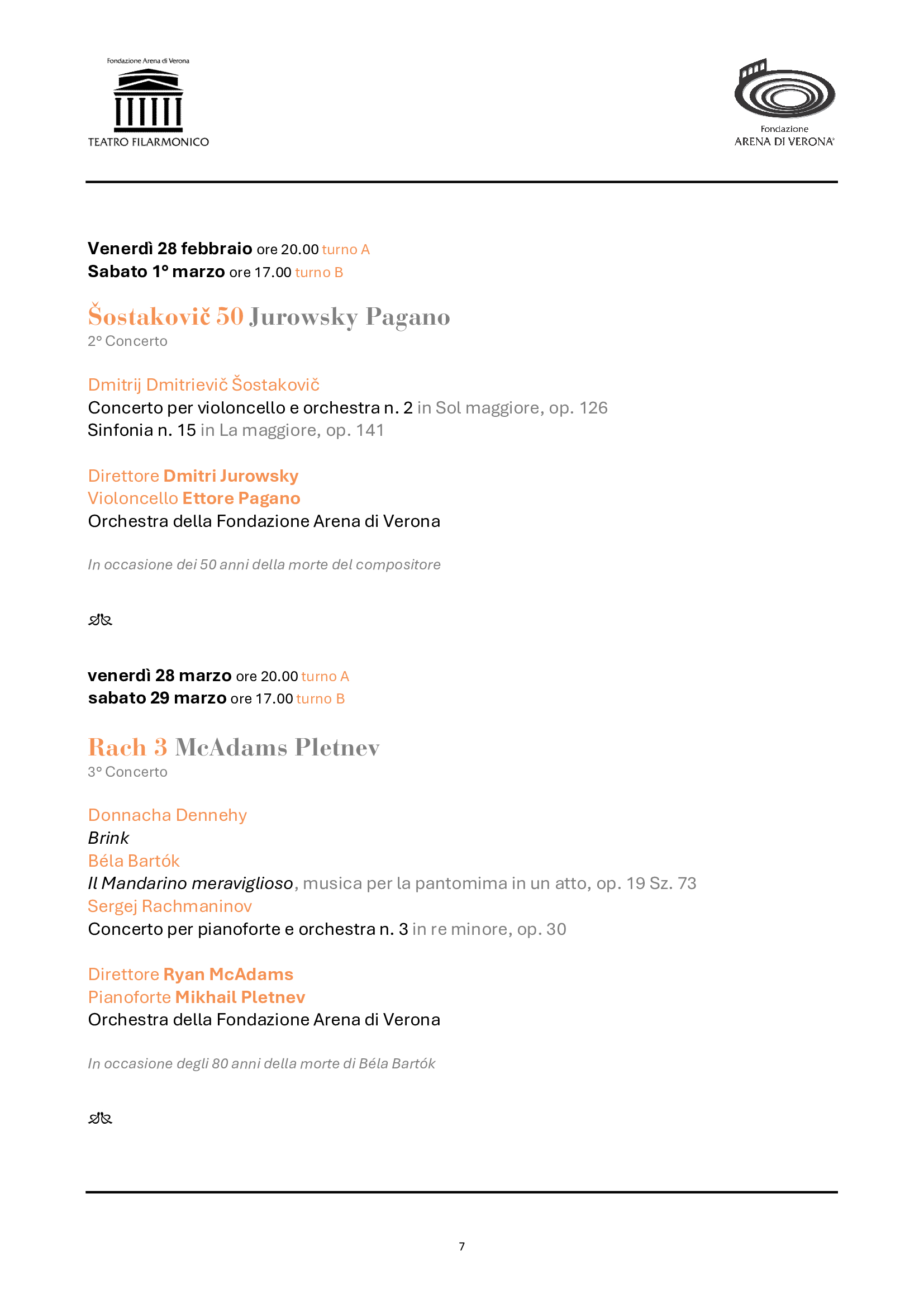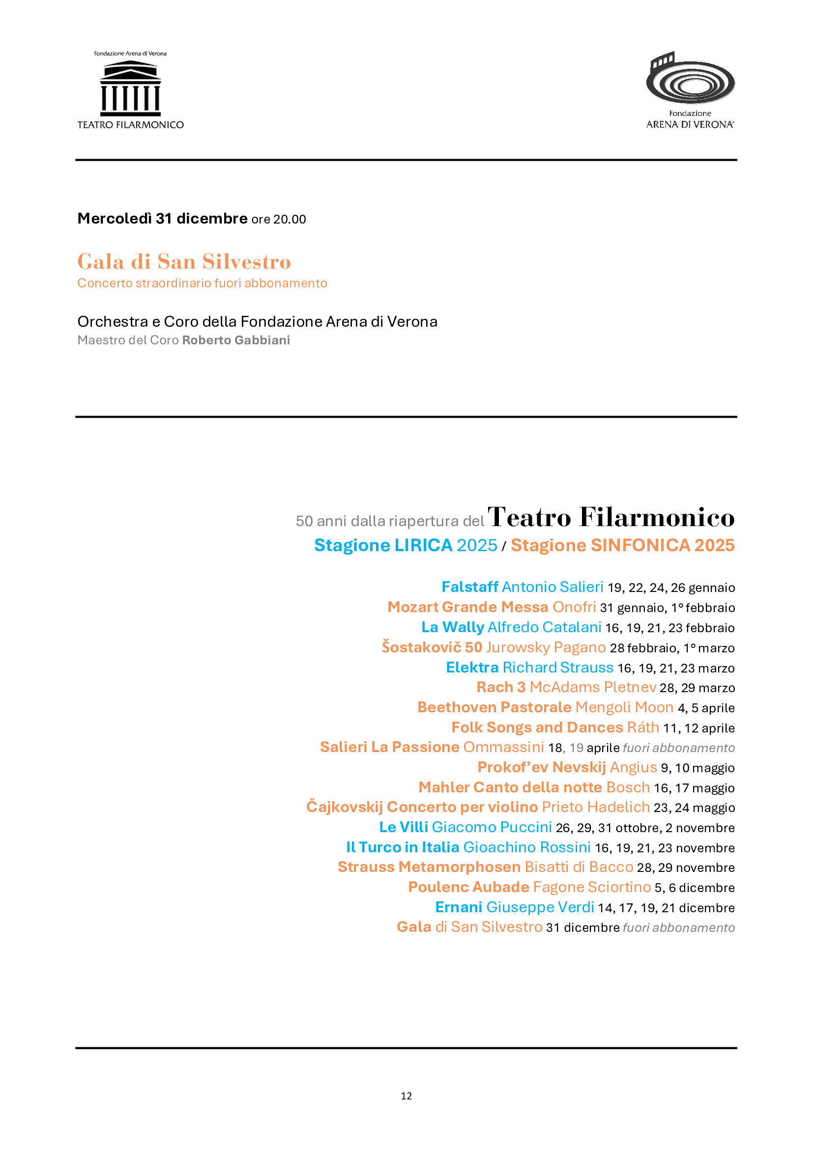 La Stagione sinfonica conferma ben 10 appuntamenti in abbonamento, a cui si aggiungono due concerti straordinari. La programmazione abbraccerà oltre tre secoli di musica, inaugurando il 31 gennaio con la Grande Messa in do minore di Mozart e proseguendo con importanti anniversari di grandi compositori come Šostakovič, Ravel e lo stesso Antonio Salieri, a cui sarà dedicato il concerto straordinario di Pasqua nel 200° della morte, che sarà eccezionalmente replicato anche a Legnago, città natale del maestro. Proseguiranno le integrali intraprese negli ultimi anni da Fondazione Arena: i concerti di Rachmaninov (il leggendario Terzo), le composizioni di Richard Strauss, le sinfonie di Beethoven (la Pastorale) e quelle di Mahler (la Settima, complessa e affascinante, mai eseguita dai complessi veronesi). Brani noti e pietre miliari del repertorio (come le pagine di Bartók e Chopin, il Concerto per violino di Čajkovskij o la colossale cantata Aleksandr Nevskij) saranno affiancati da gemme più rare e altrettanto preziose, alla scoperta di autori dall’Ungheria e dall’America latina. Non mancheranno infine le proposte rivolte alla contemporaneità, inserite in programmi tematici ampi e stimolanti: Poulenc, Berio, Dennehy, e una nuova commissione in prima assoluta al maestro Sciortino, poliedrico artista di oggi. Come nel 2024, il calendario dei concerti si intensificherà in primavera, impegnando maggiormente Orchestra e Coro, mentre i complessi tecnici realizzeranno la nuova produzione del 102° Festival in Arena, per poi riprendere in autunno e chiudere con un eccezionale gala di fine anno. Accanto a giovani di talento, vi saranno solisti e direttori di prestigio internazionale, come Dmitri Jurowsky, Ettore Pagano, Ryan McAdams, Mikhail Pletnev, Marco Angius, Marcus Bosch, Augustin Hadelich, per citarne solo alcuni in ordine di apparizione sul palcoscenico veronese.