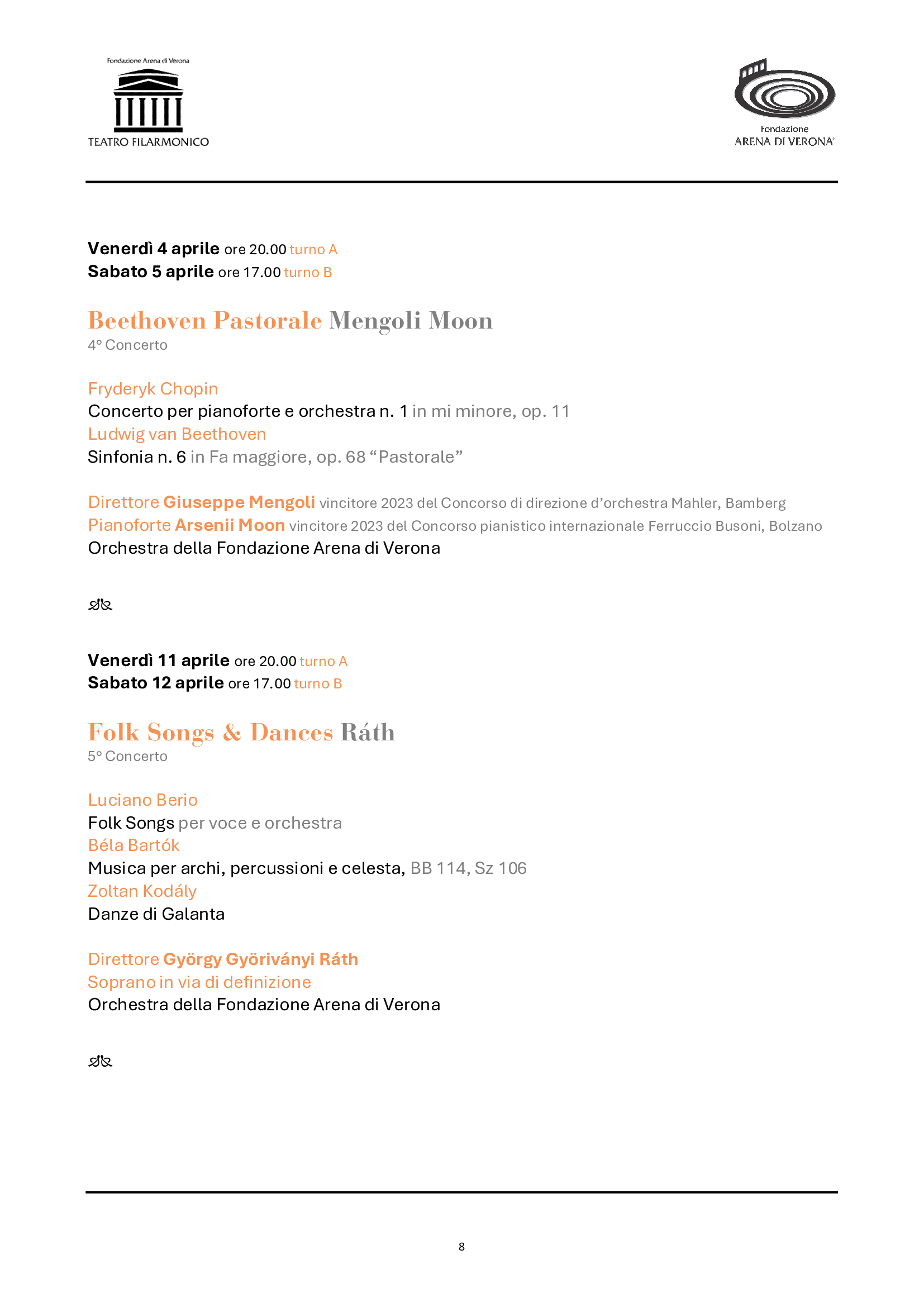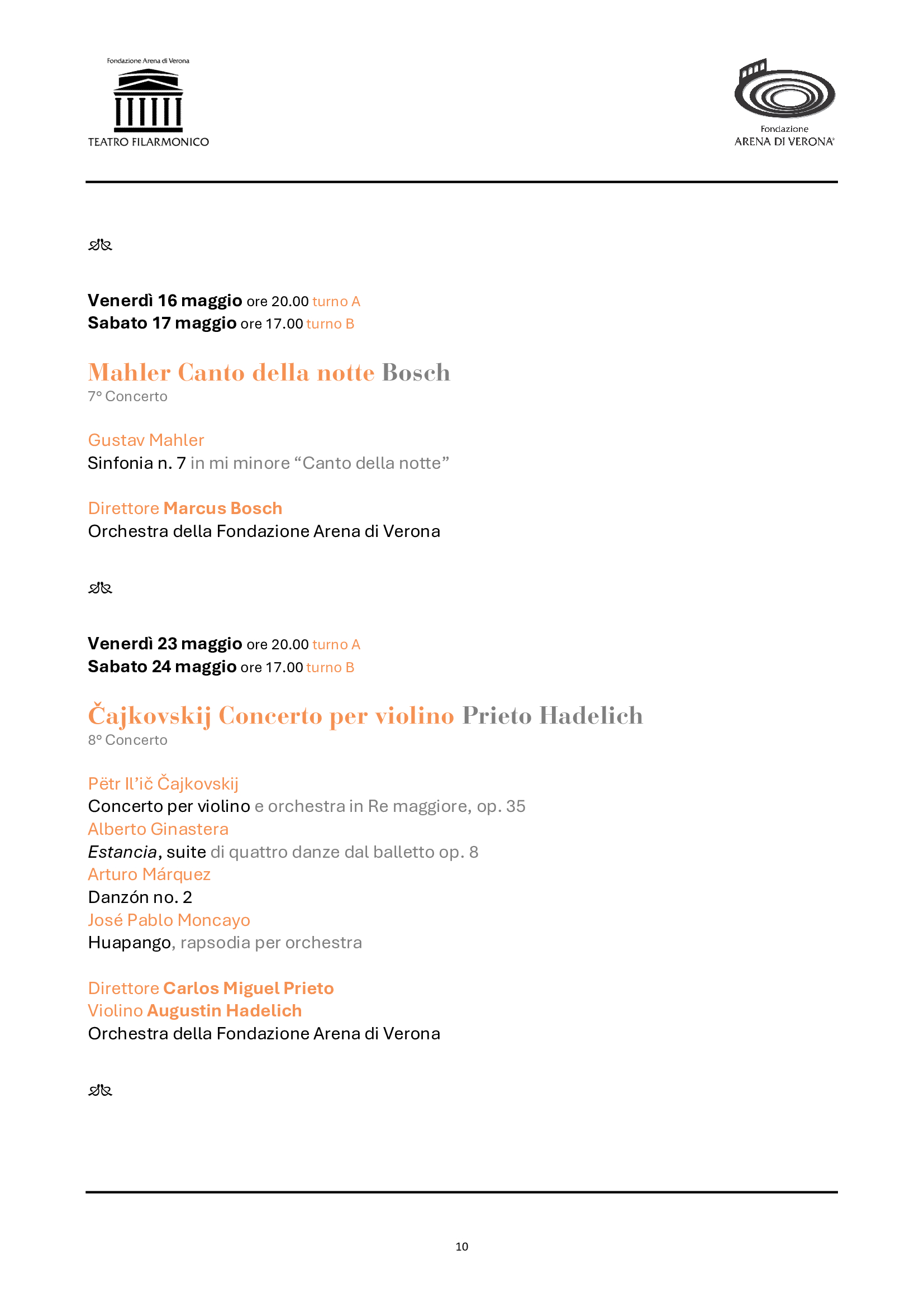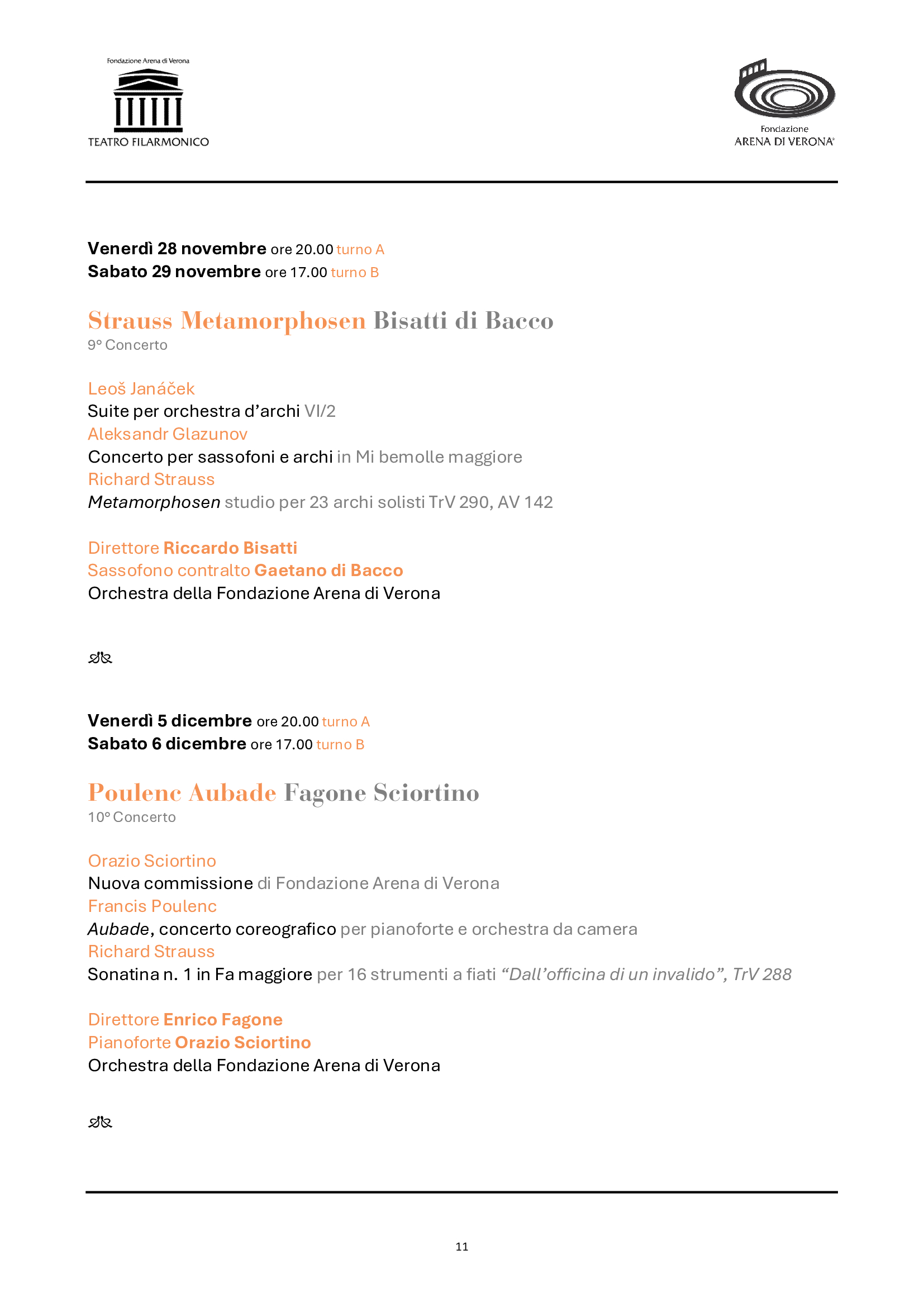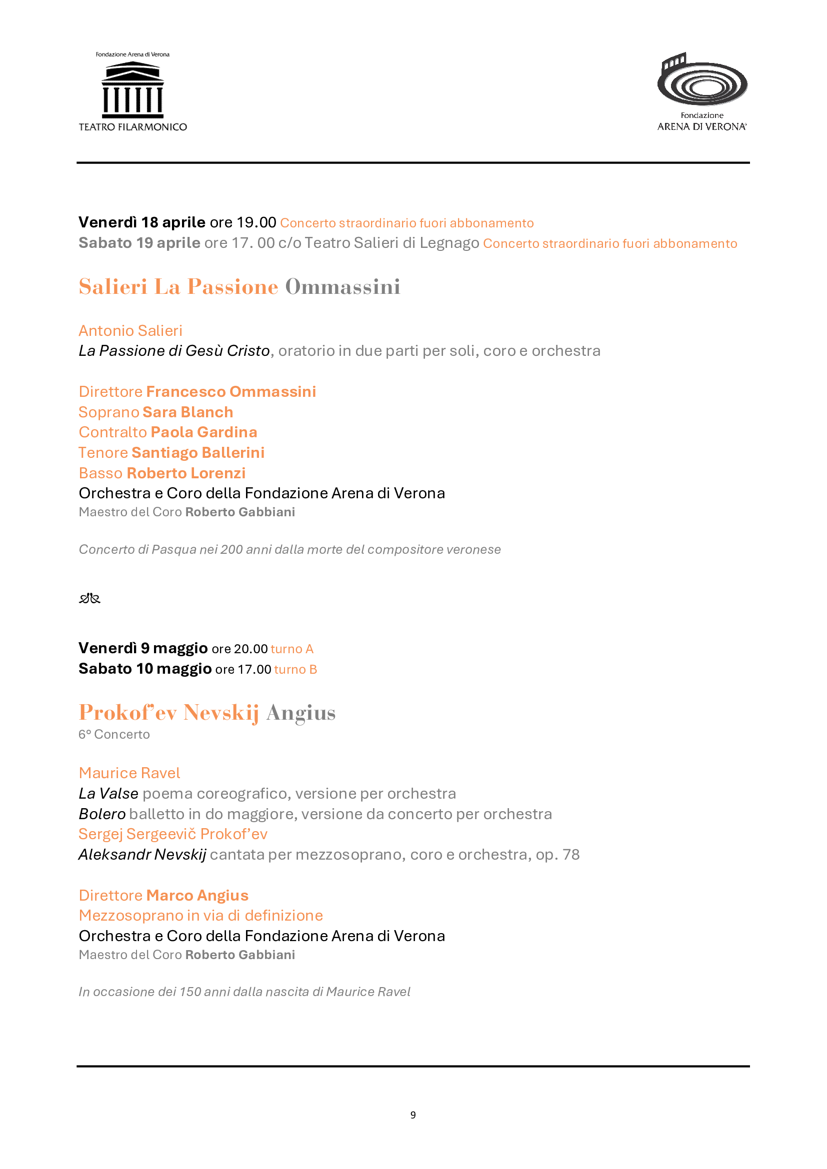 La Stagione sinfonica conferma ben 10 appuntamenti in abbonamento, a cui si aggiungono due concerti straordinari. La programmazione abbraccerà oltre tre secoli di musica, inaugurando il 31 gennaio con la Grande Messa in do minore di Mozart e proseguendo con importanti anniversari di grandi compositori come Šostakovič, Ravel e lo stesso Antonio Salieri, a cui sarà dedicato il concerto straordinario di Pasqua nel 200° della morte, che sarà eccezionalmente replicato anche a Legnago, città natale del maestro. Proseguiranno le integrali intraprese negli ultimi anni da Fondazione Arena: i concerti di Rachmaninov (il leggendario Terzo), le composizioni di Richard Strauss, le sinfonie di Beethoven (la Pastorale) e quelle di Mahler (la Settima, complessa e affascinante, mai eseguita dai complessi veronesi). Brani noti e pietre miliari del repertorio (come le pagine di Bartók e Chopin, il Concerto per violino di Čajkovskij o la colossale cantata Aleksandr Nevskij) saranno affiancati da gemme più rare e altrettanto preziose, alla scoperta di autori dall’Ungheria e dall’America latina. Non mancheranno infine le proposte rivolte alla contemporaneità, inserite in programmi tematici ampi e stimolanti: Poulenc, Berio, Dennehy, e una nuova commissione in prima assoluta al maestro Sciortino, poliedrico artista di oggi. Come nel 2024, il calendario dei concerti si intensificherà in primavera, impegnando maggiormente Orchestra e Coro, mentre i complessi tecnici realizzeranno la nuova produzione del 102° Festival in Arena, per poi riprendere in autunno e chiudere con un eccezionale gala di fine anno. Accanto a giovani di talento, vi saranno solisti e direttori di prestigio internazionale, come Dmitri Jurowsky, Ettore Pagano, Ryan McAdams, Mikhail Pletnev, Marco Angius, Marcus Bosch, Augustin Hadelich, per citarne solo alcuni in ordine di apparizione sul palcoscenico veronese.