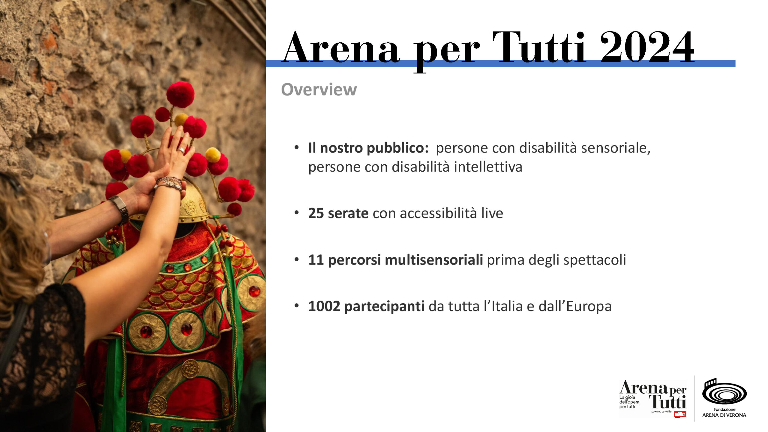 Sono state precisamente 3.521 le persone con disabilità che questa estate hanno potuto vivere la magia dell’Opera. Delle quali 1.002 attraverso tecnologie e percorsi multisensoriali. Il progetto Arena per Tutti, realizzato da Fondazione Arena di Verona con Müller, e giunto alla seconda edizione, cresce di anno in anno. E guarda già al 2025.
