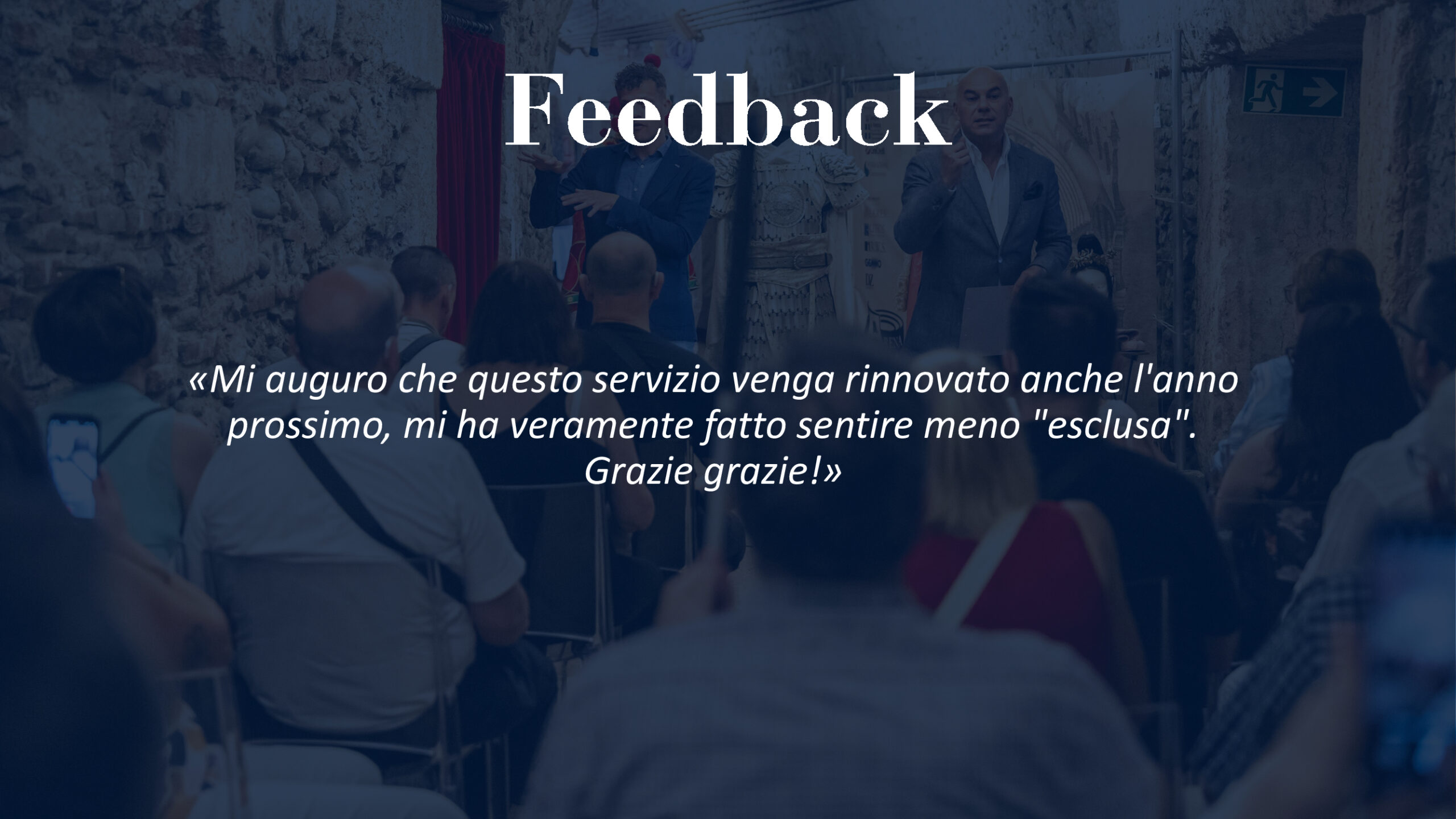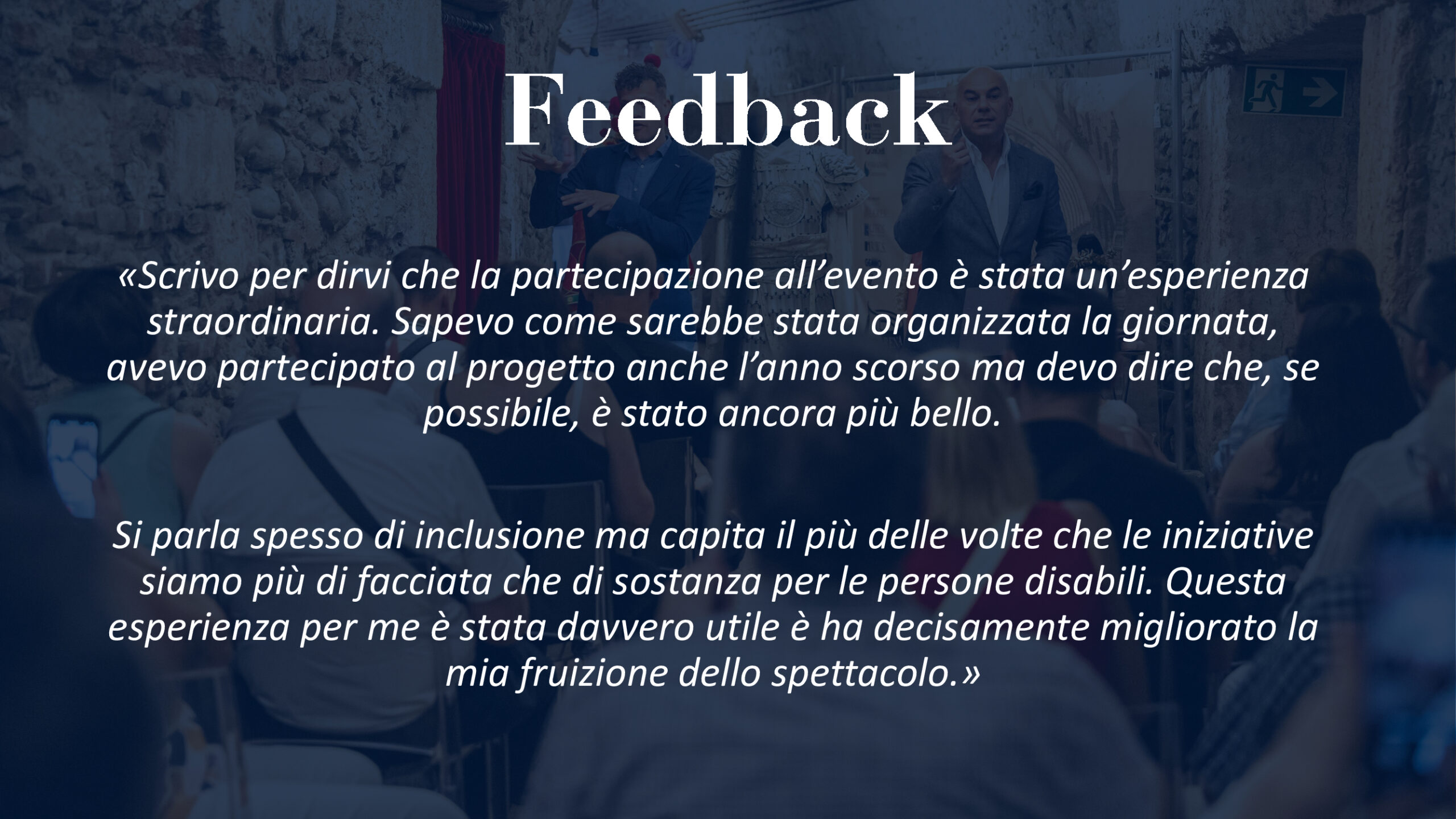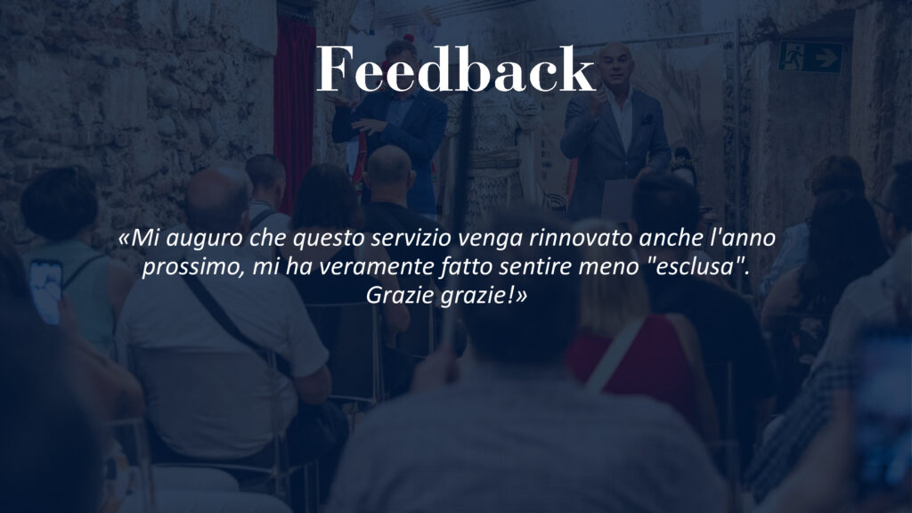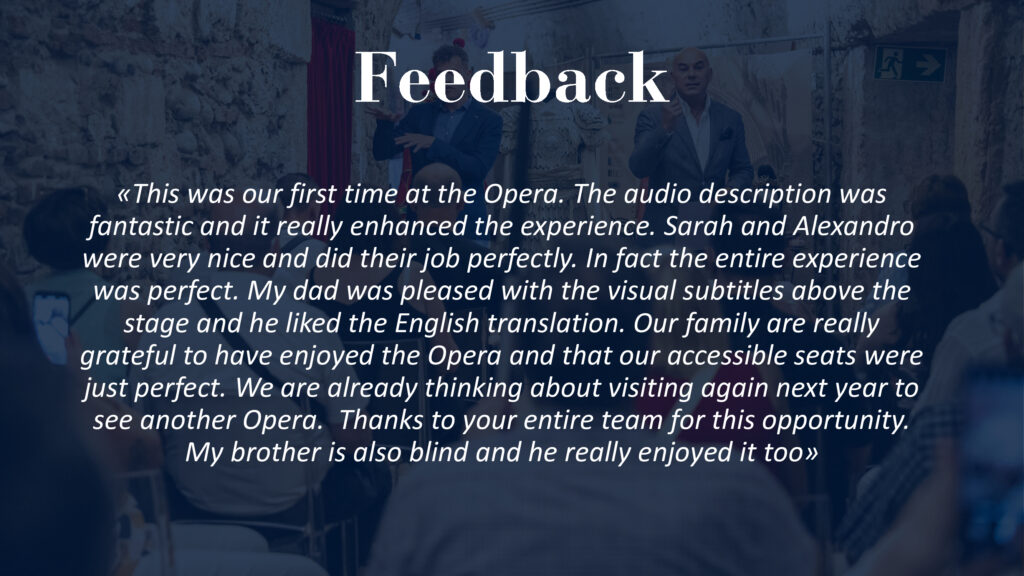 Quest’anno sono state ben 25 le serate di spettacolo dal vivo, da giugno a settembre, all’insegna dell’accessibilità. Tutti i partecipanti hanno avuto l’occasione di seguire l’opera con supporti e percorsi ad hoc tra cui l’audio descrizione per persone cieche e ipovedenti, così come sottotitoli specifici per persone sorde. In tre differenti lingue: italiano, inglese e tedesco.