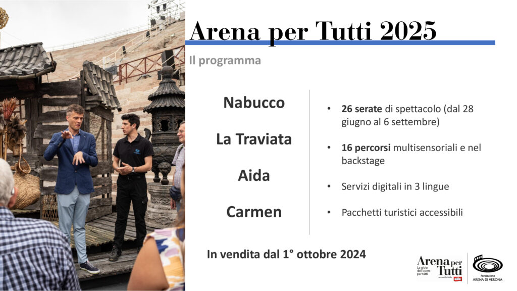 Già a partire dal 1° ottobre sarà possibile prenotare il proprio posto per partecipare ad Arena per Tutti 2025. Per ulteriori informazioni e per conoscere le modalità di adesione, è possibile scrivere all’indirizzo e-mail inclusione@arenadiverona.it e consultare il sito www.arenapertutti.it.