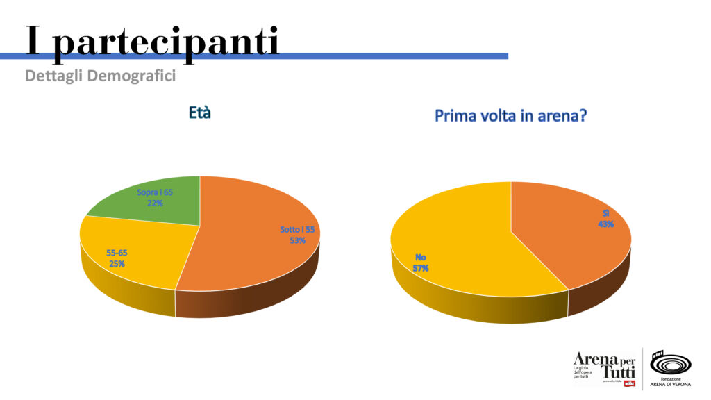 Arena per tutti ha coinvolto spettatori provenienti da 16 regioni diverse dell’Italia e, per la prima volta, anche da Germania, Austria, Francia, Regno Unito e Stati Uniti, di cui il 43% non era mai stato prima in Arena, avvicinandosi al mondo dell’opera per la prima volta in assoluto. Oltre il 91% di coloro che hanno utilizzato gli strumenti ha dichiarato con entusiasmo di aver apprezzato l’efficacia e l’immersività della propria serata all’opera. Grazie anche