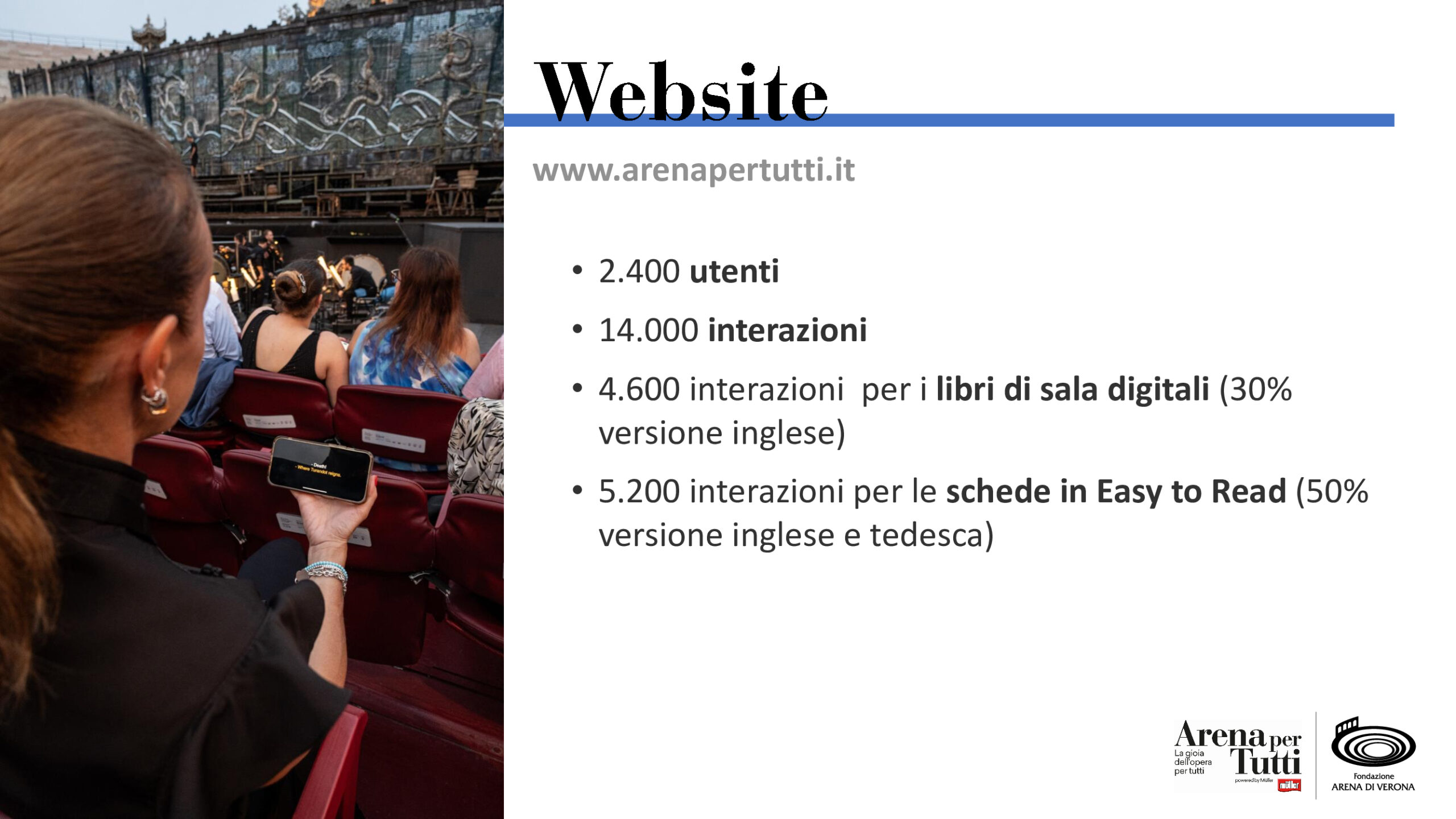 Un’iniziativa che è diventata virale. Sono stati oltre 14 milioni gli utenti raggiunti sui canali social di Fondazione Arena, Müller e degli influencer coinvolti: Elisabetta Rossi, Daniele Cassioli, Giovanni e Andrea Cerullo, Anna Vernillo, Marco Andriano. Volti noti di Instagram e Facebook che, proprio per le loro disabilità, sono diventati testimonial di come a Verona è possibile vivere un’esperienza unica al mondo. Il sito www.arenapertutti.it ha registrato 14 mila interazioni e circa 2.400 singoli utenti che hanno cercato informazioni, con un grande incremento della fruizione da parte di utenti stranieri, grazie alla traduzione dei contenuti. 4.600 i libri di sala digitali consultati (il 30% in inglese), e 5.200 le interazioni per le schede informative Esay To Read (la metà delle quali in inglese e tedesco).