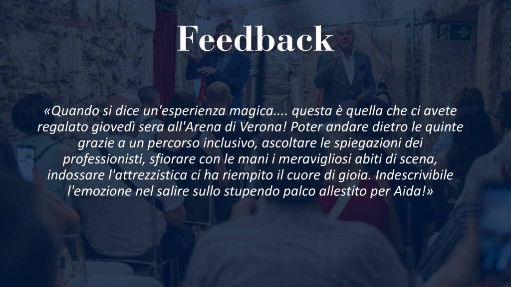 Sono state ben 1.002 le persone che hanno sfruttato i supporti e le tecnologie durante gli spettacoli, mentre 354 hanno partecipato ai percorsi multisensoriali pre-opera, con un incremento del 39% rispetto al 2023. Dodici appuntamenti che hanno registrato il sold-out e hanno visto la partecipazione di numerose associazioni, tra cui l’Unione Italiana Ciechi con il presidente nazionale Mario Barbuto, e l’attenzione dei media. La7, Rai e Corriere della Sera, oltre alle testate locali e regionali, hanno parlato del progetto areniano come il più importante d’Europa, per numero di spettatori coinvolti.