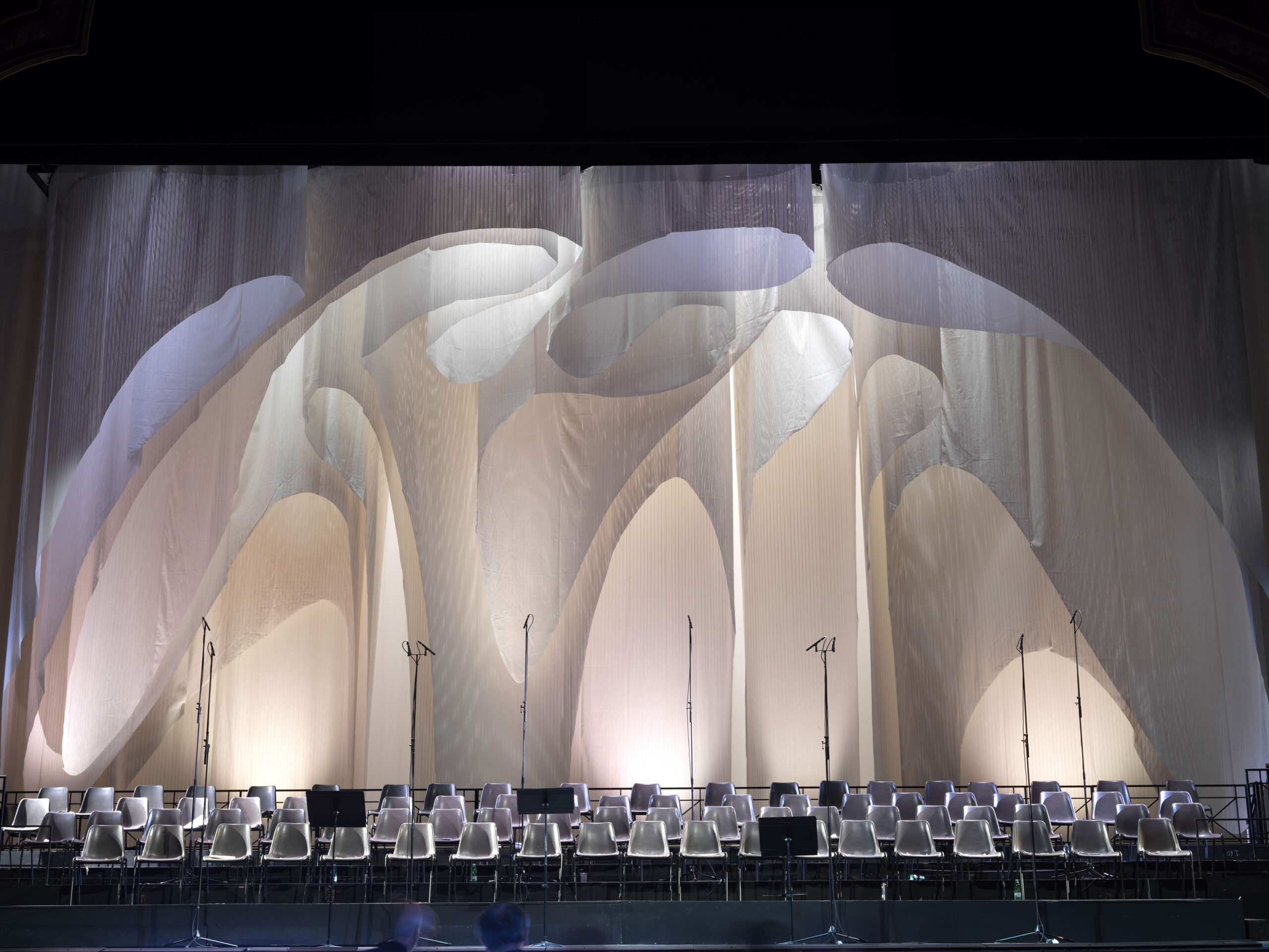 “Shiwa Shiwa” è il titolo scelto da Kuma, che significa piega-solco e indica un concetto giapponese riferito all’andamento curvilineo della natura, alla sua inafferrabilità, al suo essere mobile, sguisciante, in perenne trasformazione. A identificare questa idea è una superficie di Alcantara traforata, di circa settecento metri quadrati, che si avviluppa sul palcoscenico del teatro, abitandolo come protagonista assoluta, in dialogo con le voci del coro e con l’orchestra. La scena fissa non ha però nulla di statico: le onde materiche volteggiano nell’aria e soprattutto sono potentemente animate dalla regia luminosa. Questa segue cromaticamente l’intensità della musica, creando una vera sinestesia visivo-sonora nello spettatore.