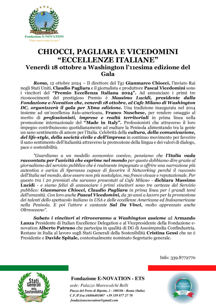 CHIOCCI, PAGLIARA E VICEDOMINI “ECCELLENZE ITALIANE” – Venerdì 18 ottobre a Washington l’11esima edizione del Gala