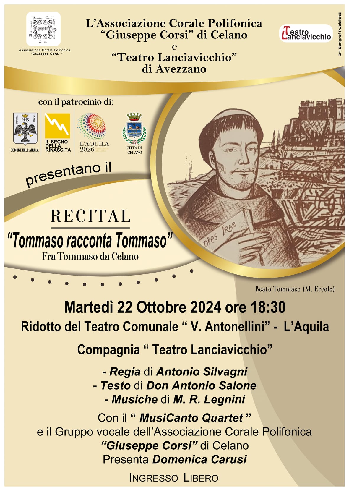 Si ringraziano: il Comune dell’Aquila, Sindaco Pierluigi Biondi, il Comune di Celano, Sindaco Settimio Santilli, tutti i sostenitori che hanno consentito la realizzazione dello spettacolo, il Nunzio Apostolico S.E. Orlando Antonini e collaboratori tutti. Il Recital “ Tommaso racconta Tommaso “ rientra nelle attività condotte fin dal 2014 dall’Associazione “ Giuseppe Corsi “ di Celano iniziate con lo studio e la rielaborazione del “Dies Irae” e proseguite nel corso di 10 anni con studi, concerti, animazione liturgiche di cerimonie religiose nell’ambito del “Cammino Misericordioso : Tommaso e Francesco nella terra dei Marsi”. Il recital dunque nasce dalla volontà di far conoscere la figura di Tommaso da Celano e di porre attenzione anche alla ricostruzione storica musicale e teatrale. La rappresentazione del Recital “ Tommaso racconta Tommaso” al Teatro Comunale Ridotto dell’Aquila prosegue il lavoro incessante, svolto da dieci anni, teso alla conoscenza, all’approfondimento e alla comprensione della figura di Tommaso da Celano.