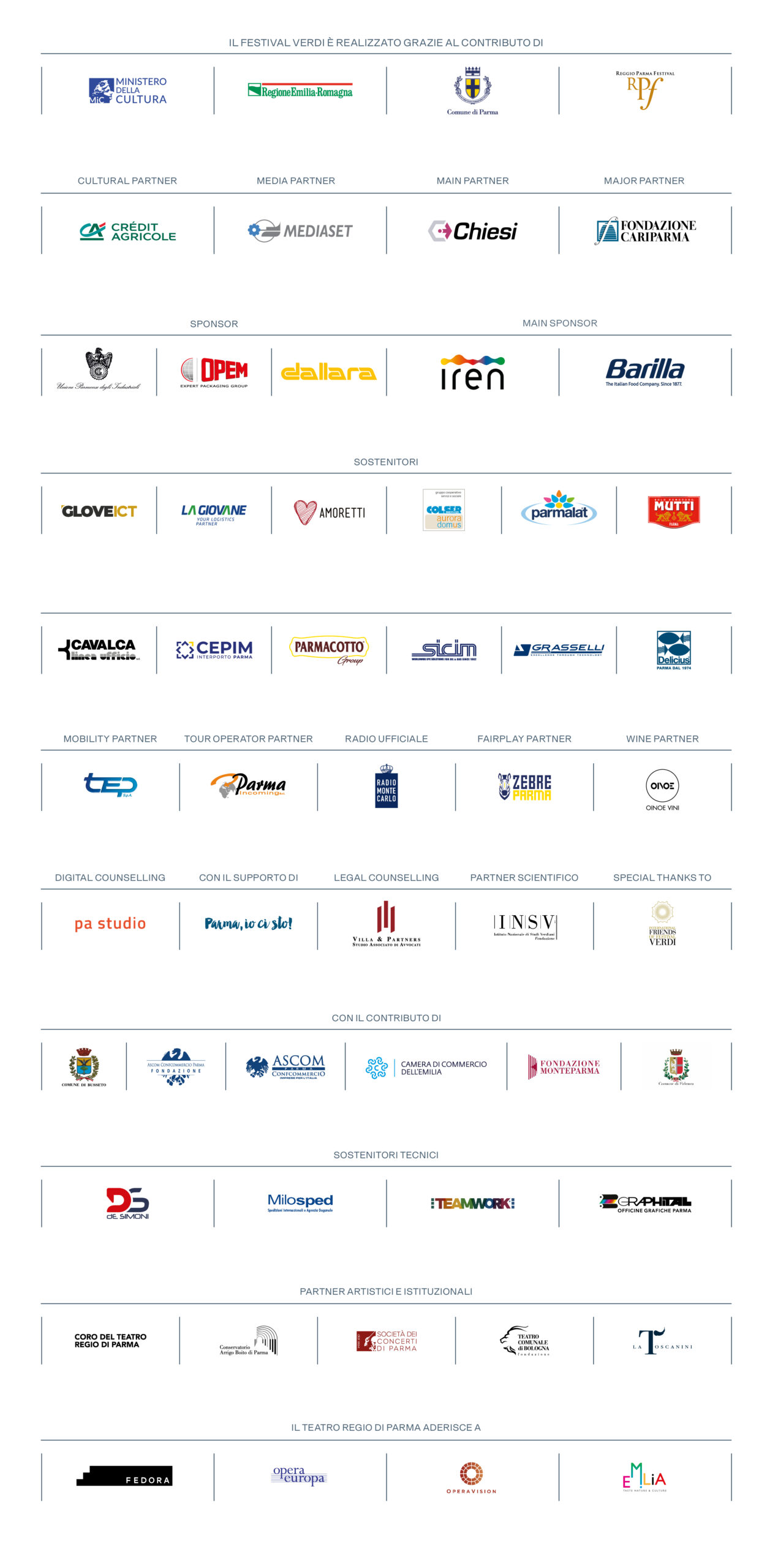Il Festival Verdi è realizzato grazie al contributo di Ministero della Cultura, Regione Emilia-Romagna, Reggio Parma Festival, Comune di Parma. Main partner Chiesi. Major partner Fondazione Cariparma. Media partner Mediaset. Cultural Partner Crédit Agricole.Main sponsor Iren, Barilla. Sponsor Unione Parmense degli Industriali, Dallara, Opem. Sostenitori GloveICT, Cavalca, La Giovane, Amoretti, Sicim, Colser, Mutti, Cepim, Parmacotto, Grasselli, Parmalat, Delicius. Con il contributo di Comune di Fidenza, Ascom e Ascom Confcommercio Parma Fondazione, Camera di Commercio dell’Emilia, Fondazione Monte Parma, Comune di Busseto. Wine partner Oinoe. MobiltyPartner Tep. Con il supporto di “Parma, io ci sto!”. Legal counselling Villa&Partners. Partner scientifico Istituto Nazionale di Studi Verdiani. Digital counselling Unsocials. Radio Ufficiale Radio Monte Carlo. Fairplay Partner Zebre Parma. Tour Operator Partner Parma Incoming. Sostenitori tecnici De Simoni, Milosped, Teamwork, Graphital. Il Teatro Regio aderisce a Fedora, Opera Europa, Opera Vision, Emilia taste, nature & culture. Special thanks to International Friends of Festival Verdi. Partner artistici e istituzionali Teatro Comunale di Bologna, La Toscanini, Società dei Concerti di Parma, Conservatorio “Arrigo Boito” di Parma, Coro del Teatro Regio di Parma.