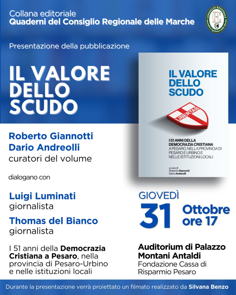 31 ottobre, alle ore 17, presso l’auditorium di Palazzo Antaldi in via Passeri, Pesaro, avrà luogo la presentazione del volume «Il valore dello Scudo» curato da Roberto Giannotti e Dario Andreolli. Ove sussista la possibilità, è gradita la presenza.Cordialmente Giorgio Girelli