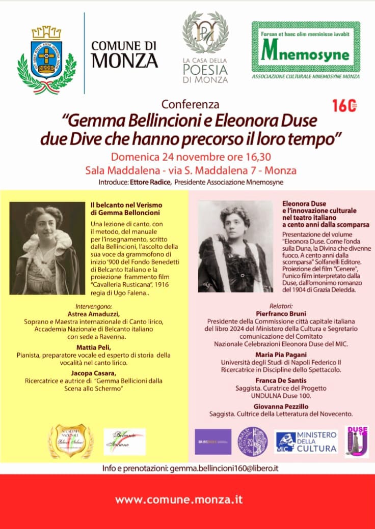 La conferenza si concentrerà sulle figure di due grandi artiste italiane, Gemma Bellincioni ed Eleonora Duse, pionieristiche nel loro approccio e fondamentali nella storia del teatro e della musica italiana. L’incontro, quindi, rappresenta un’occasione unica per riscoprire e approfondire il contributo artistico di queste due donne straordinarie, capaci di innovare e di lasciare un’impronta indelebile nel panorama culturale italiano e internazionale.