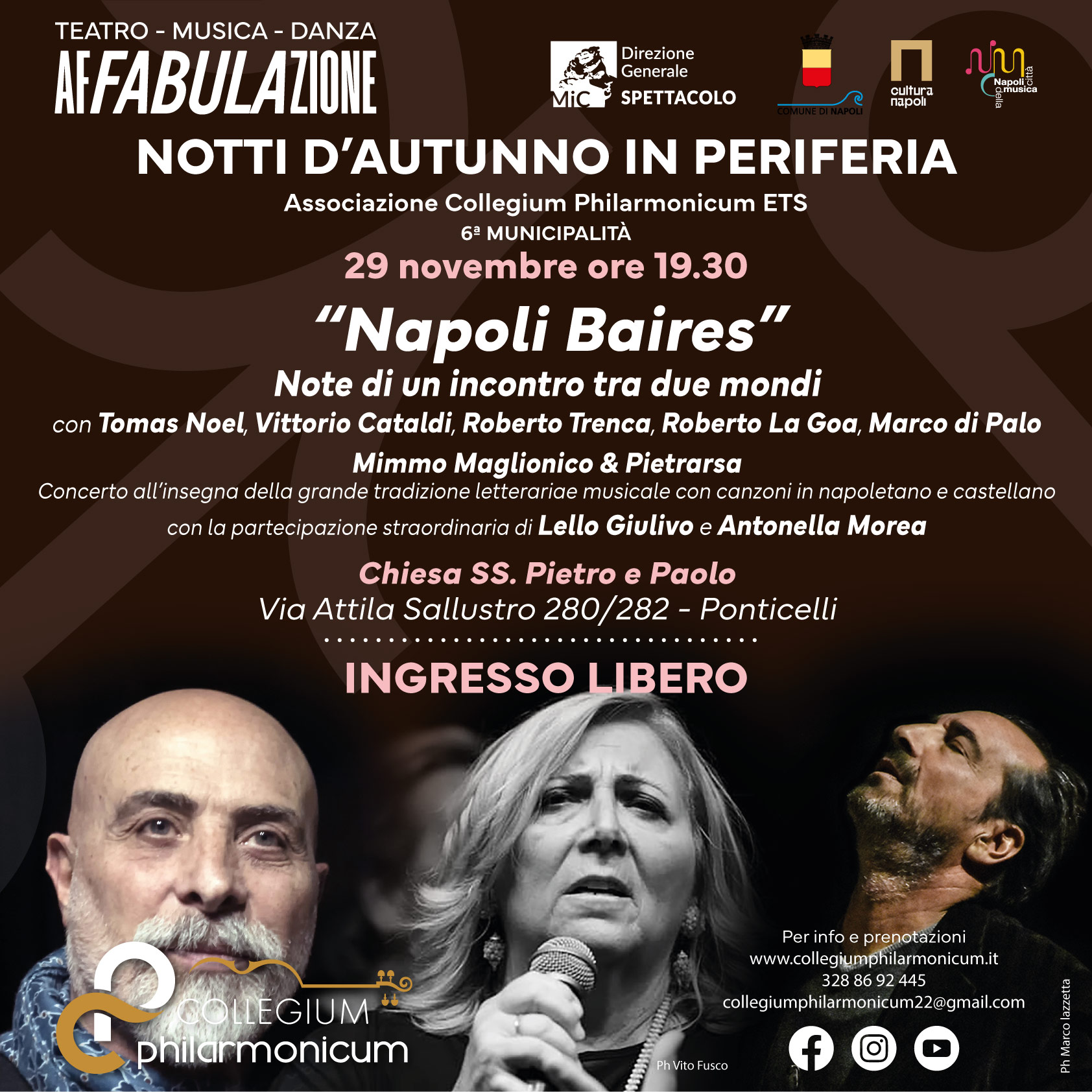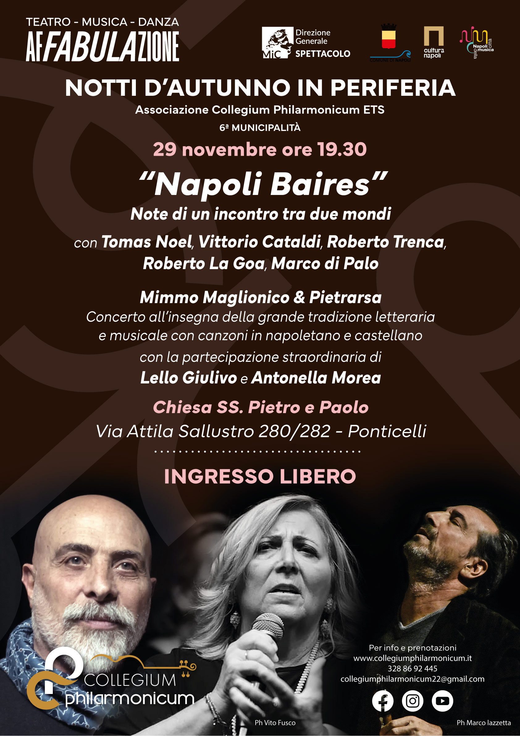 Venerdì 29 novembre alle 19.30 presso la Chiesa dei Ss. Pietro e Paolo (via Attila Sallustro 280/282 a Ponticelli) in scena lo spettacolo«Napoli Baires – Note di un incontro tra due mondi»,ideato e diretto da Mimmo Maglionico.