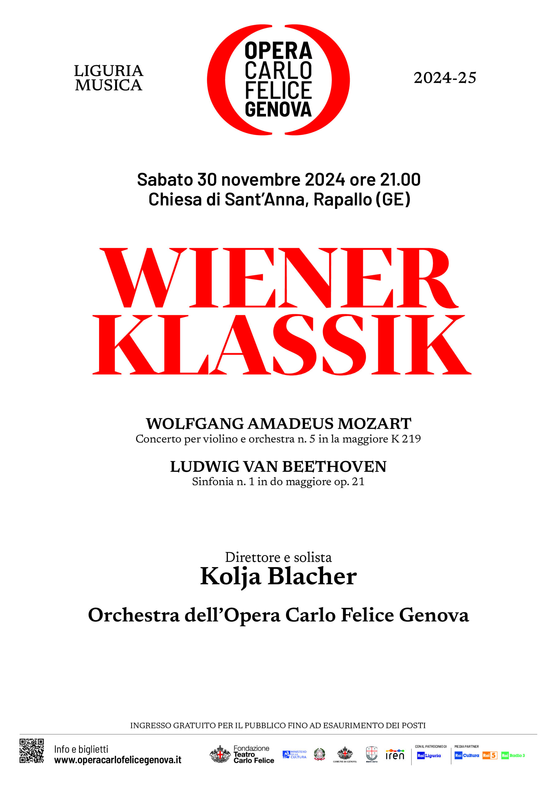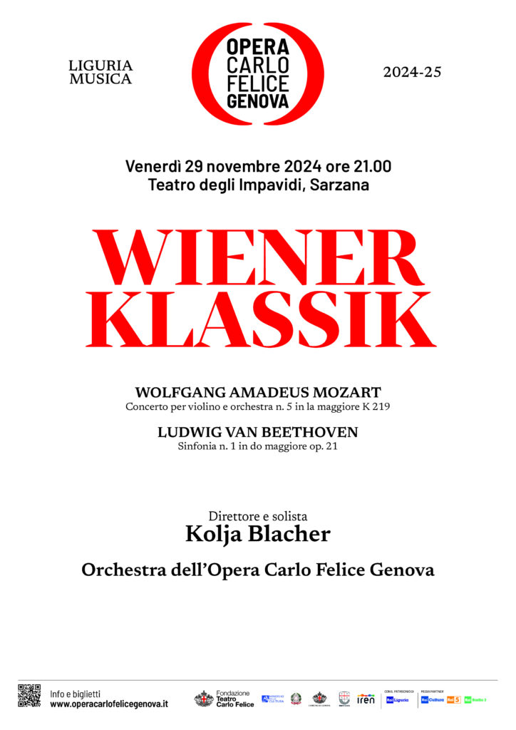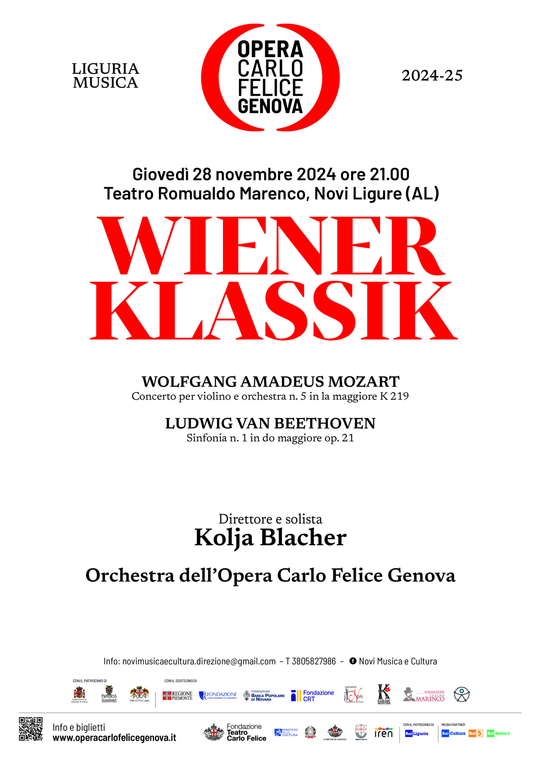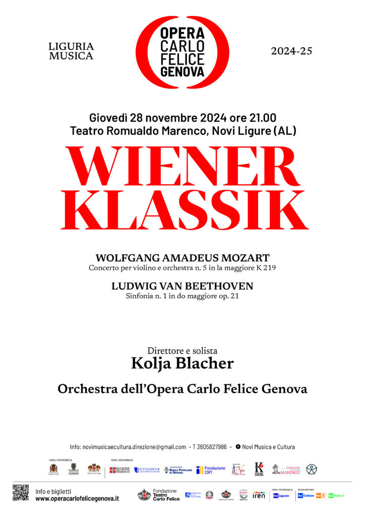 Dopo il successo del concerto del 3 luglio 2024 per il Paganini Genova Festival, Kolja Blacher tornerà a dirigere l’Orchestra dell’Opera Carlo Felice con Wiener Klassik nell’ambito della rassegna Liguria Musica. Il concerto si terrà giovedì 28 novembre alle ore 21.00 al Teatro Romualdo Marenco di Novi Ligure; venerdì 29 novembre alle ore 21.00 al Teatro degli Impavidi di Sarzana; e sabato 30 novembre alle ore 21.00 alla Chiesa di Sant’Anna di Rapallo.