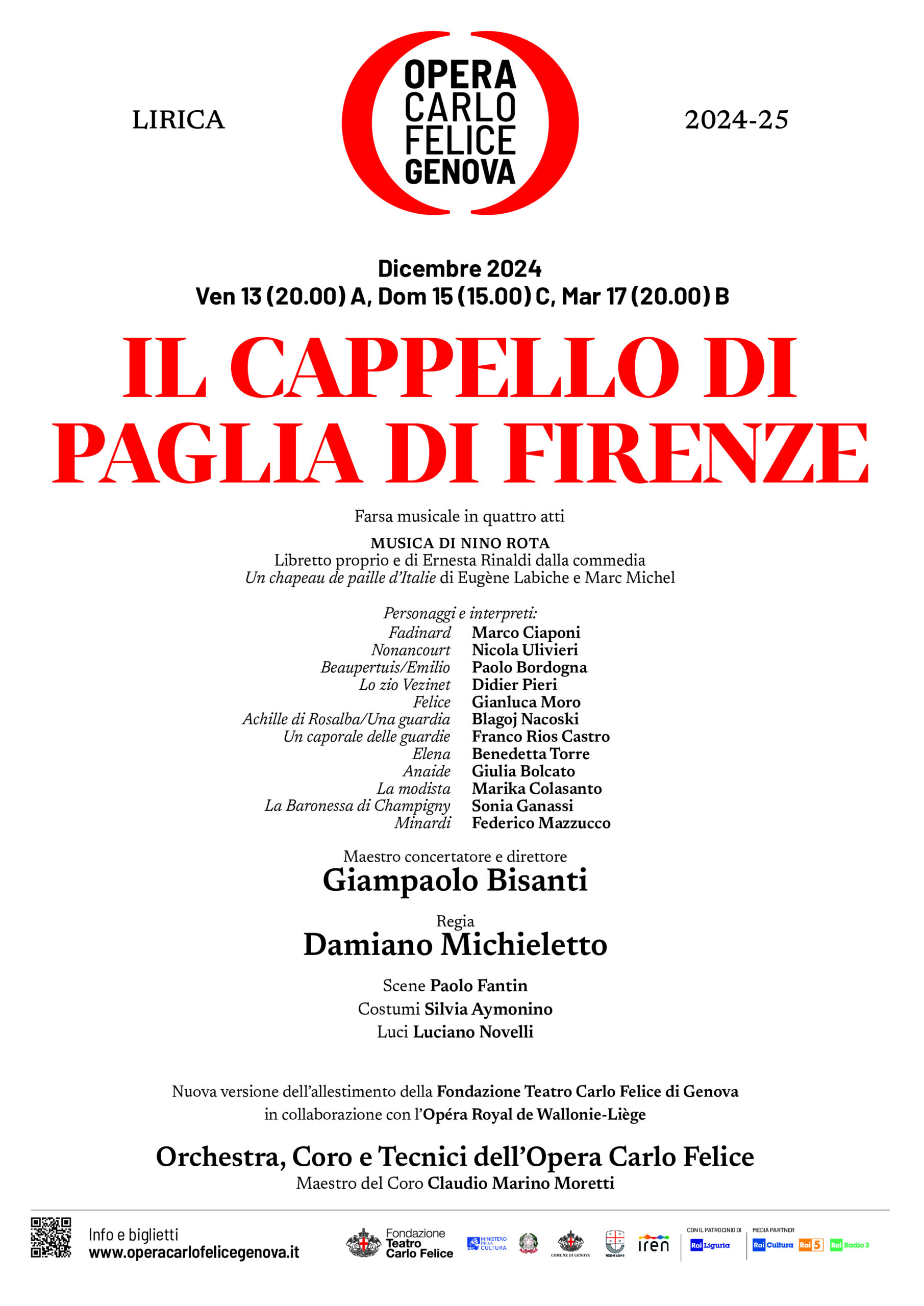 La Stagione Lirica 24-25 dell’Opera Carlo Felice prosegue con il terzo titolo in cartellone: Il cappello di paglia di Firenze – farsa musicale in quattro atti di Nino Rota su libretto proprio e di Ernesta Rinaldi dalla commedia Un chapeau de paille d’Italie di Eugène Labiche e Marc Michel – sarà in scena venerdì 13 dicembre alle ore 20.00. Repliche domenica 15 dicembre alle ore 15.00 e martedì 17 dicembre alle ore 20.00.