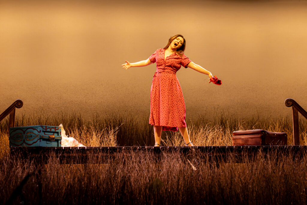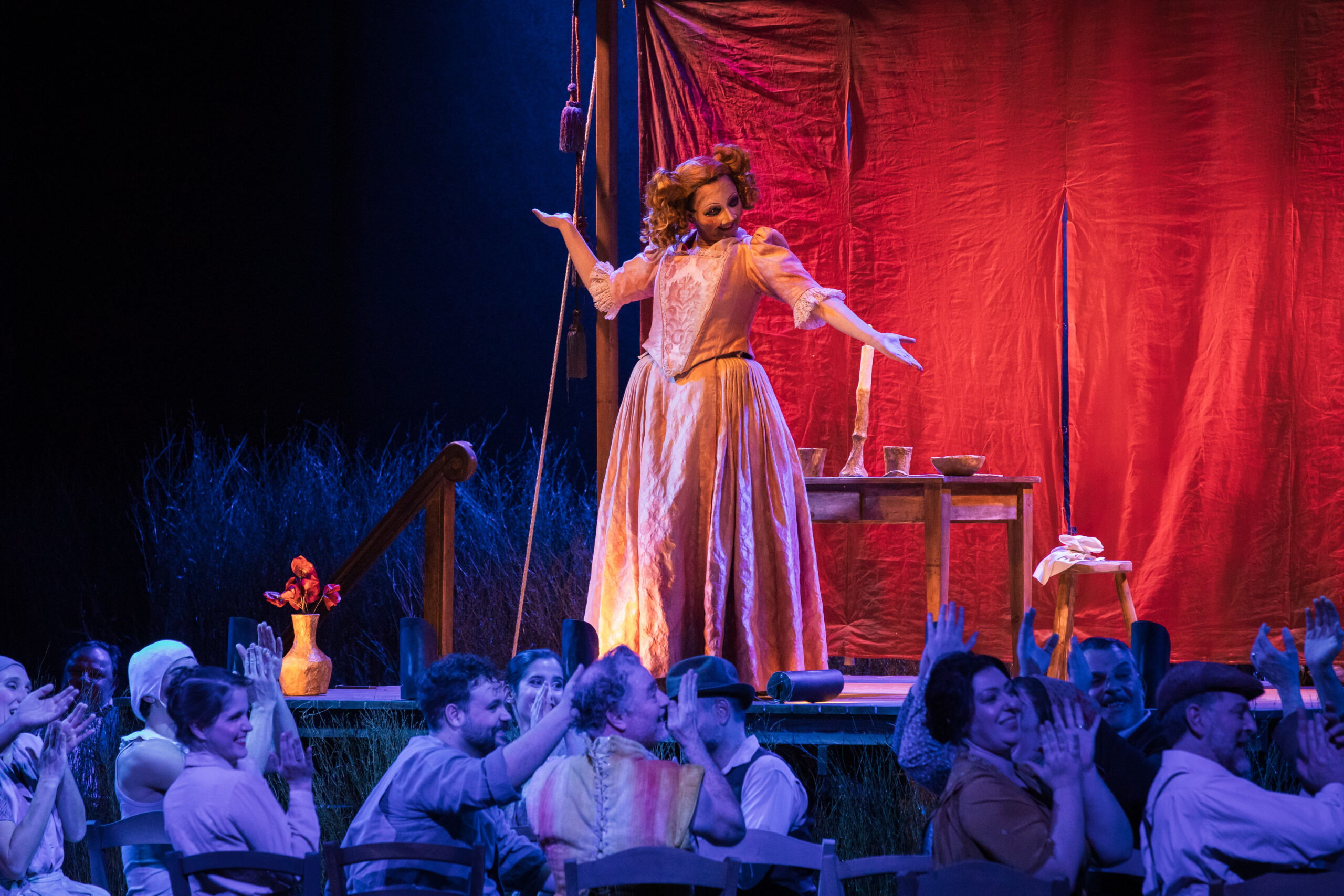 Sinigaglia ha immerso Pagliacci a metà tra realtà e finzione da commedia, nell’atmosfera del cinema neorealista degli anni Quaranta e Cinquanta; una dimensione metateatrale dove la regia svela i suoi trucchi davanti al pubblico, creando una visione in progress della costruzione degli ambienti. Sul palcoscenico è presente un palchetto da commedia dell’arte e intorno una sorta di prato secco e arido, montato in diretta dai mimi, dai macchinisti e dai cantanti stessi, così da creare una forte connessione fra la scena e il dietro le quinte, svelandone il meccanismo. «Un prato arso dal sole – dice la regista – che appartiene a quelle periferie che possono rimandarci a Pasolini ma anche ai prati intorno alla città calabrese da cui partiva la storia».