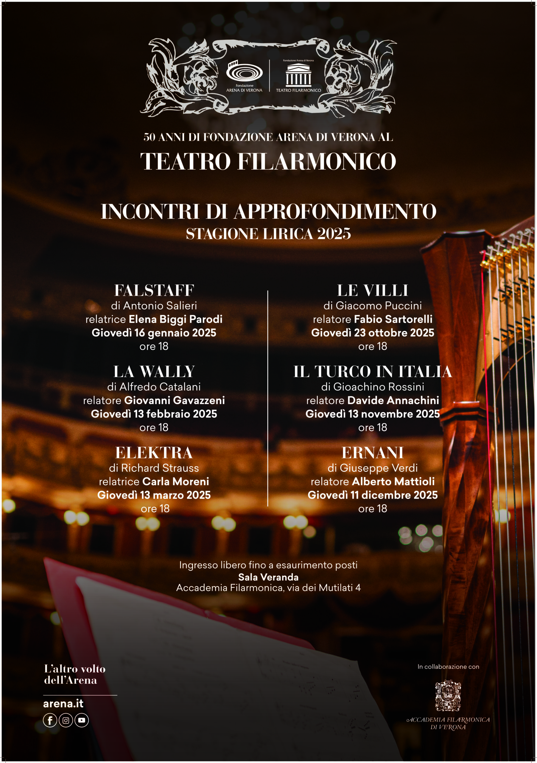 Nuova stagione e nuova sede per gli incontri gratuiti di approfondimento, in collaborazione con Accademia Filarmonica di Verona: Falstaff sarà presentato al pubblico giovedì 16 gennaio alle 18 nella prestigiosa Sala Veranda dell’Accademia Filarmonica (via Mutilati 4) dalla curatrice dell’edizione critica Elena Biggi Parodi. Ingresso libero fino ad esaurimento posti.