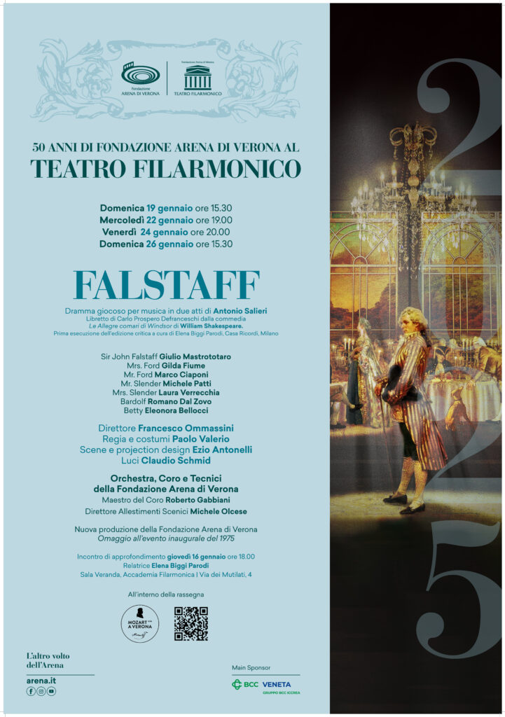 Dopo i bombardamenti della Seconda guerra mondiale, Verona dovette attendere la ricostruzione del Teatro, per mano dell’Accademia Filarmonica, prima di rivedere l’opera sul principale palcoscenico al coperto della città. Era il 1975 e, per i 150 anni dalla morte di Salieri, andò in scena Falstaff: inaugurazione lirica del Teatro e vera e propria riscoperta, che fece circolare l’allestimento in numerose città, prima di tornare a Verona nel 1981. Da allora molti passi avanti si sono fatti nella rivalutazione di Salieri e della sua arte, liberi dalla leggendaria rivalità col coevo Mozart, immortalata in prosa da Puškin e al cinema da Amadeus. Cinquant’anni dopo, per il bicentenario salieriano, Falstaff va in scena per la prima volta in edizione critica, prodotta da Fondazione Arena, edita da Casa Ricordi e a cura di Elena Biggi Parodi, musicologa, titolare della cattedra di Storia e storiografia della musica al Conservatorio di Parma e critico musicale cui si deve la riscoperta di numerosi scritti del compositore, del quale ha già pubblicato il catalogo completo delle opere.