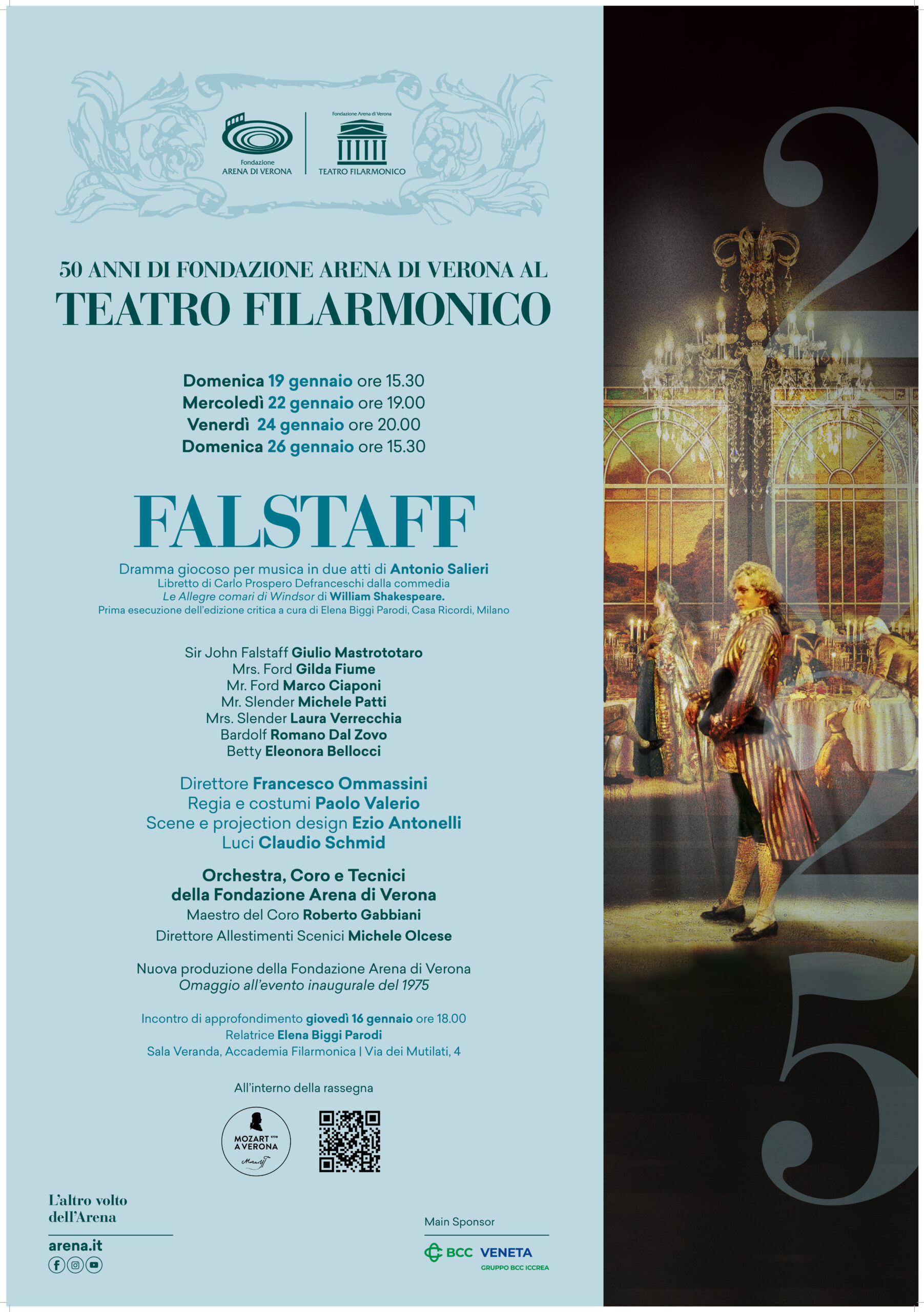 Fondazione Arena di Verona celebra 50 anni d’opera al Teatro Filarmonico riproponendo, a distanza di mezzo secolo, il titolo che inaugurò la prima Stagione artistica nel 1975, ma con uno spettacolo tutto nuovo e in edizione critica. Domenica 19 gennaio alle 15.30 si alza il sipario su Falstaff ossia Le tre burle, opera comica di Antonio Salieri,nato a Legnago e divenuto compositore alla corte imperiale di Vienna. Una gemma del teatro musicale da riscoprire, grazie alla regia dell’esperto shakespeariano Paolo Valerio, con scene di Ezio Antonelli e luci di Claudio Schmid, in una lettura settecentesca e frizzante, con un cast di giovani talentuosi e i complessi artistici di Fondazione Arena diretti da Francesco Ommassini. Repliche mercoledì 22 gennaio alle 19, venerdì 24 alle 20, domenica 26 alle 15.30.