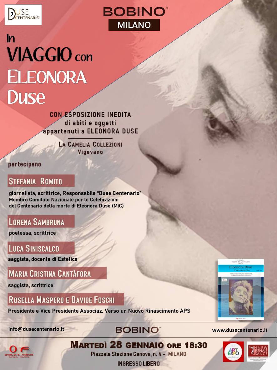 Partecipano all’incontro: Stefania Romito, Responsabile “Duse Centenario”, Lorena Silvia Sambruna, poetessa e scrittrice, Luca Siniscalco, saggista e docente di Estetica, Maria Cristina Cantàfora, scrittrice e saggista, Rosella Maspero e Davide Foschi, Presidente e Vice Presidente Associaz. “Verso un Nuovo Rinascimento”.