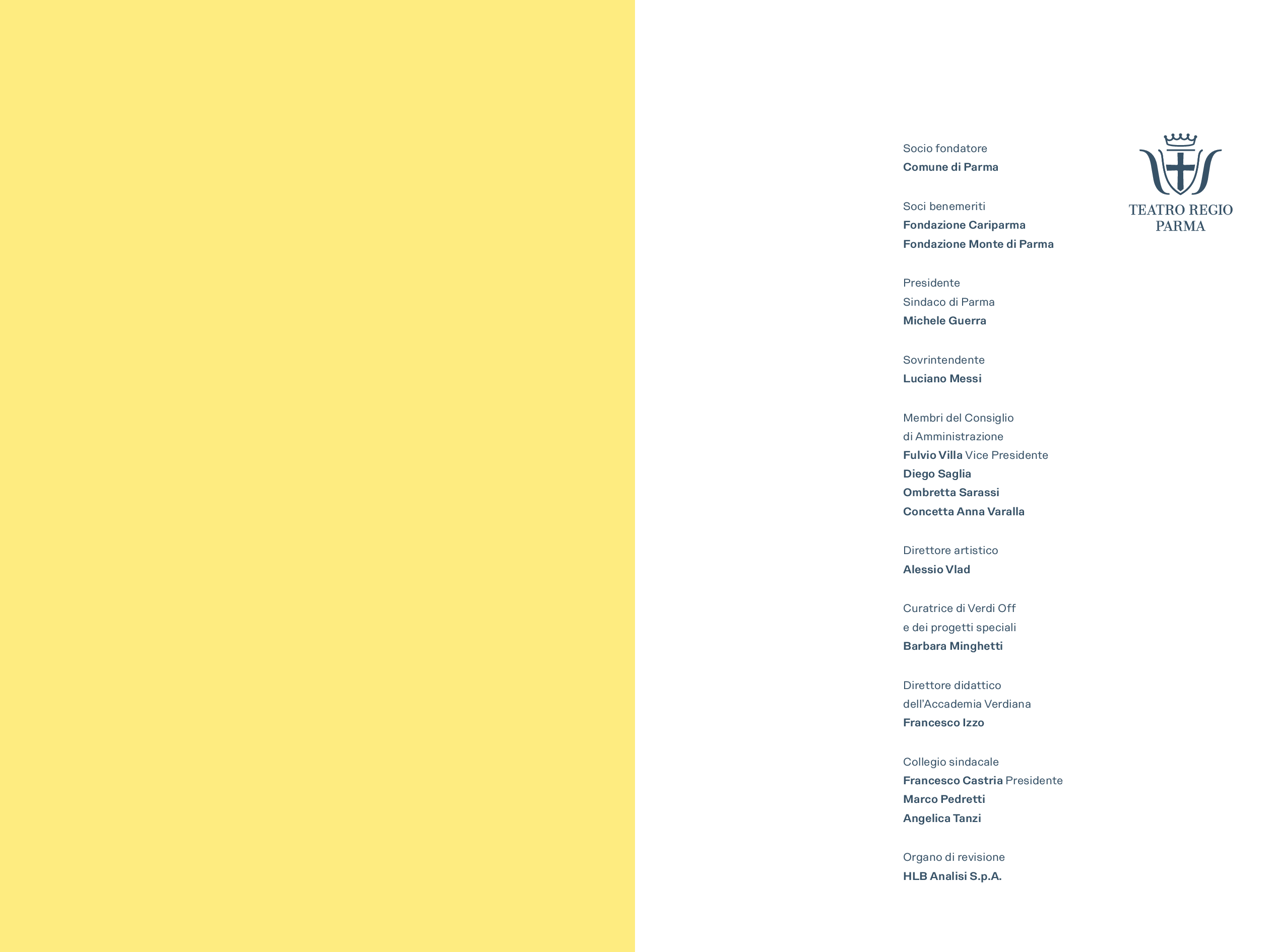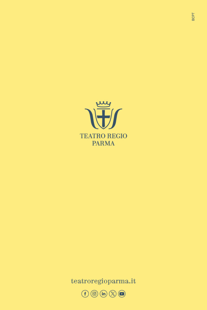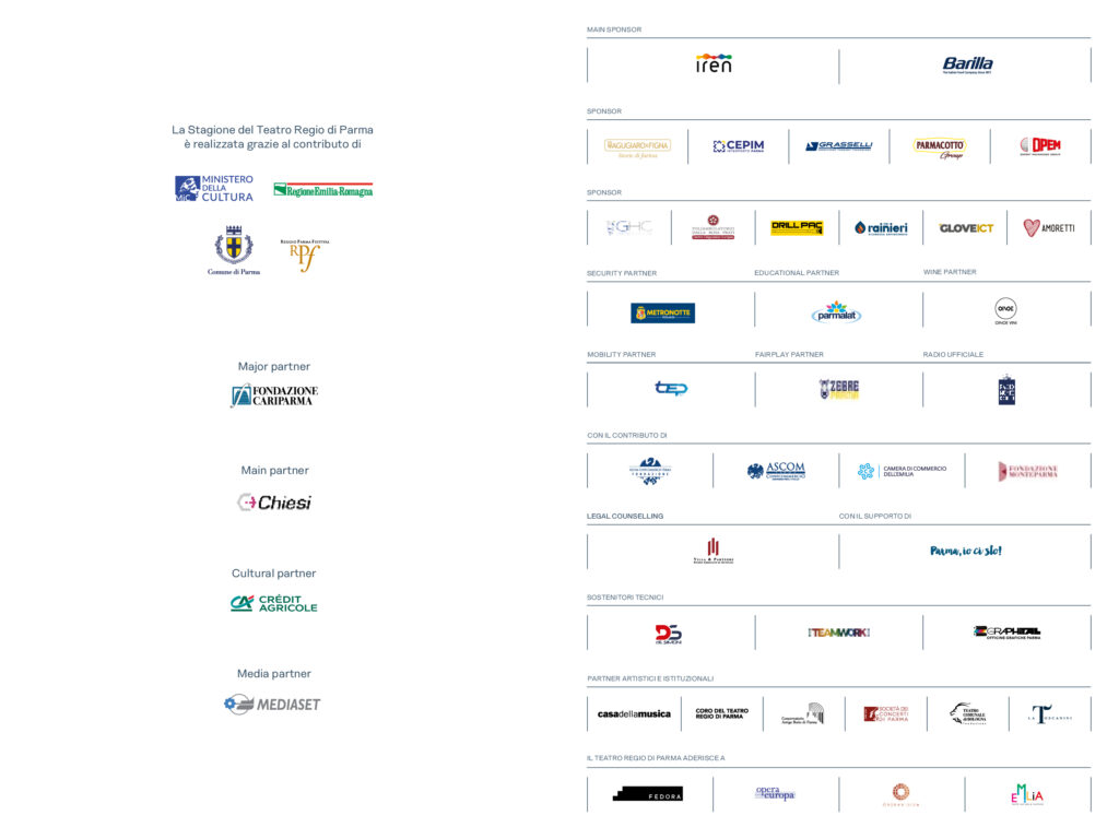 La Stagione del Teatro Regio di Parma è realizzata grazie al contributo di Comune di Parma, Ministero della Cultura, Reggio Parma Festival, Regione Emilia-Romagna. Major partner Fondazione Cariparma. Main partner Chiesi. Cultural partner Crédit Agricole. Media partner Mediaset. Main sponsor Iren, Barilla. Sponsor Agugiaro e Figna, CePIM, Grasselli, Parmacotto, Opem, GHC, Poliambulatorio Dalla Rosa Prati, Drill Pac, Rainieri, GloveICT, Amoretti. Security partner Metronotte. Educational partner Parmalat. Wine partner Oinoe. Mobility partner Tep. Radio Ufficiale Radio Monte Carlo. Fair Play partner Zebre. Con il contributo di Ascom Confcommercio Parma Fondazione, Ascom Parma Confcommercio, Camera di Commercio dell’Emilia, Fondazione Monteparma. Legal counselling Villa&Partners. Con il supporto di “Parma, io ci sto!”. Sostenitori tecnici De Simoni, Teamwork, Graphital. Partner artistici e istituzionali Casa della Musica, Coro del Teatro Regio di Parma, Conservatorio “Arrigo Boito”, Società dei Concerti di Parma, Fondazione Teatro Comunale di Bologna, La Toscanini. Il Teatro Regio di Parma aderisce a Fedora, Opera Europa, Operavision, Emilia taste, nature, culture.