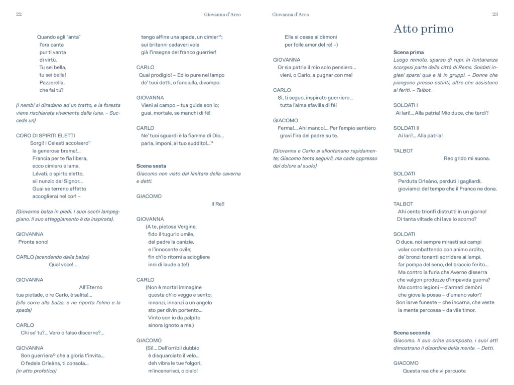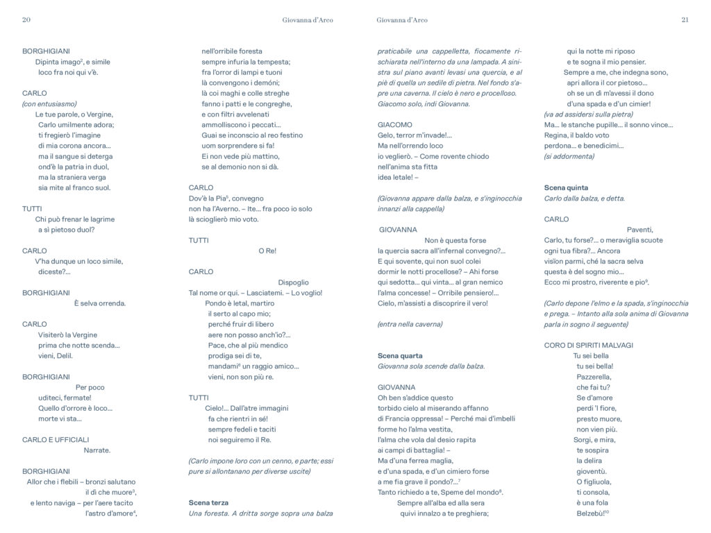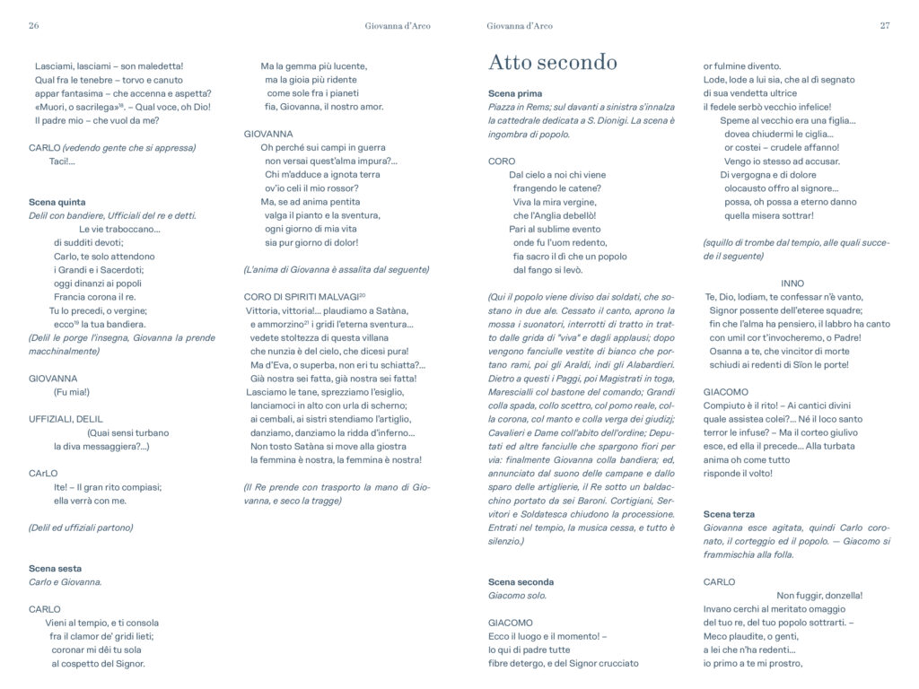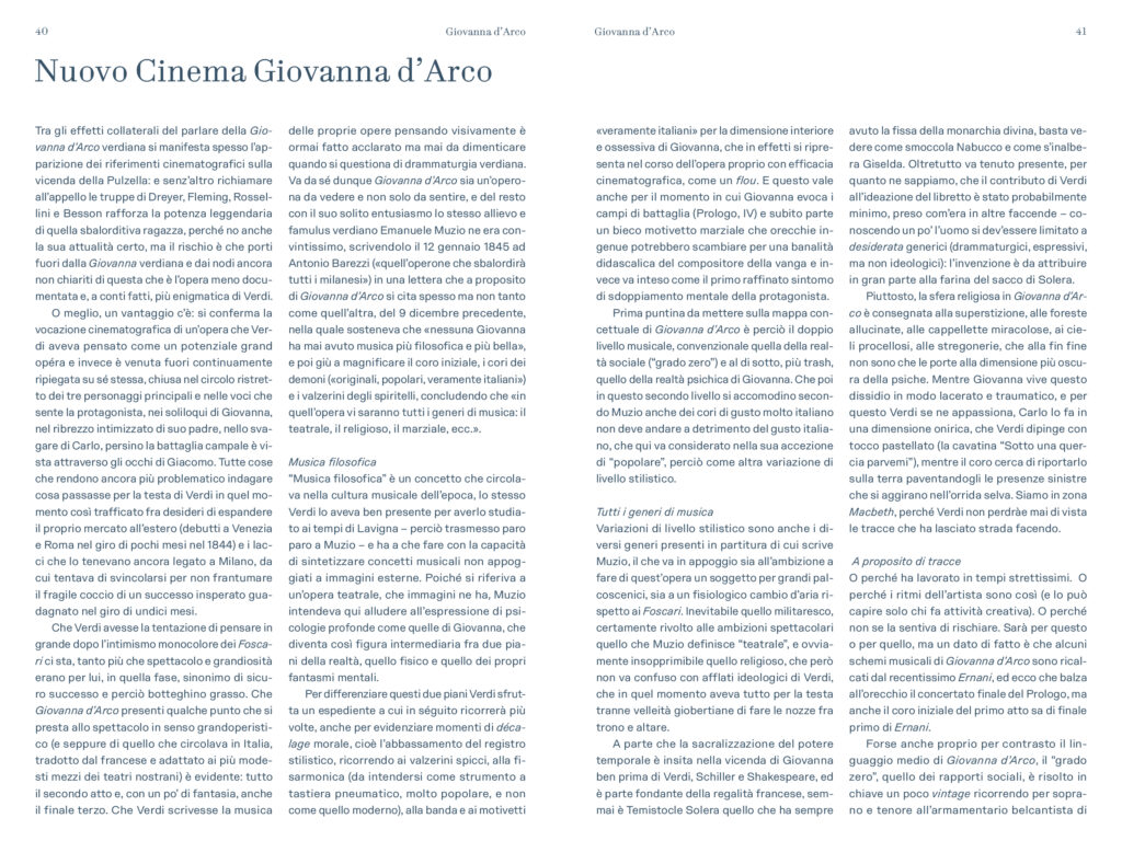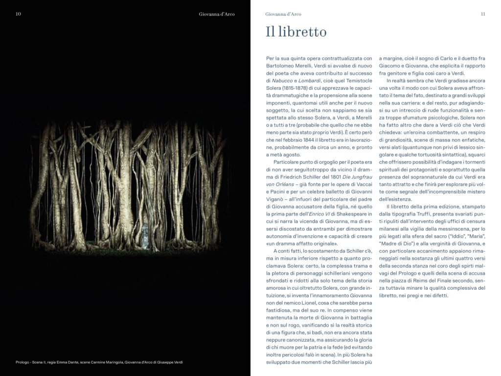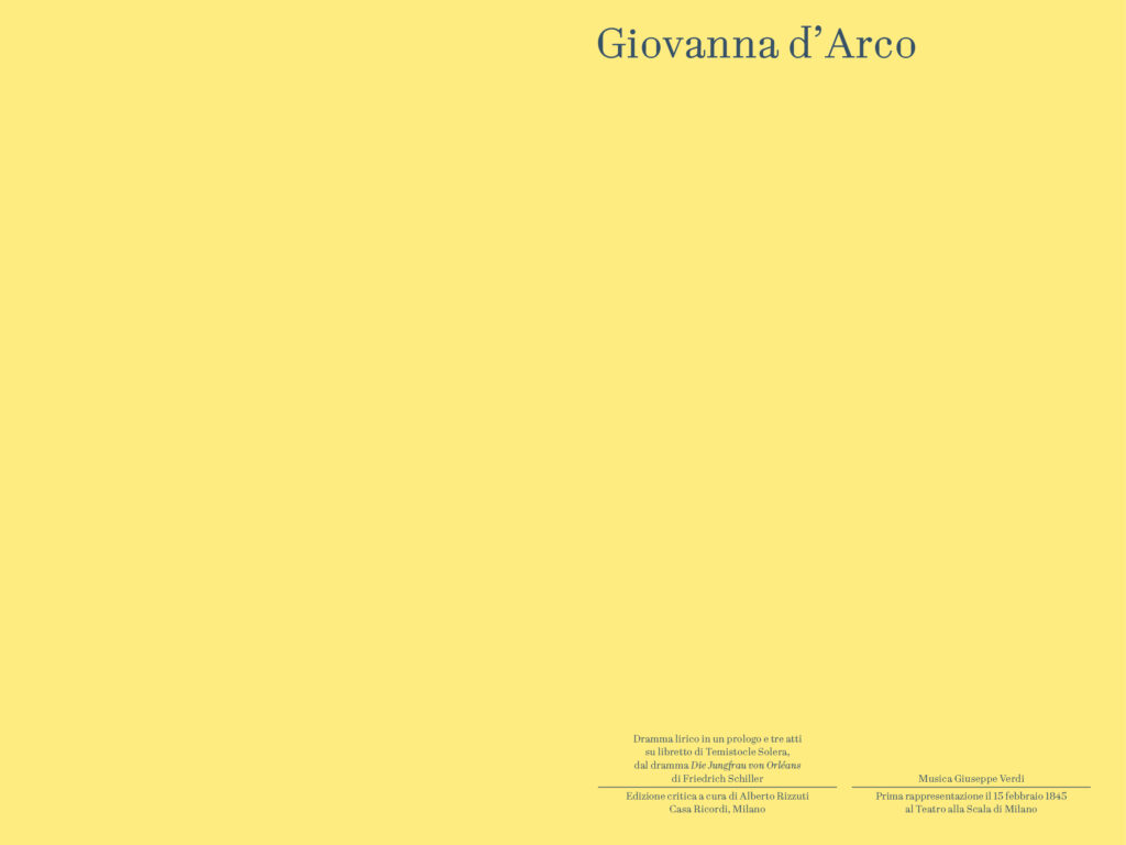 “Prima delle cinque opere di Verdi dedicate nel titolo ad un personaggio femminile e primo contatto di Verdi con Schiller – scrive Alessio Vlad, Direttore artistico del Teatro Regio. Opera affascinante e molto particolare per la capacità di far convivere elementi tra loro contrastanti: mondo terreno e mondo ultraterreno, sacro e demoniaco, serenità bucolica e violenza della guerra, rivalse patriottiche e vicende affettive; tutto dominato, poi, dal quel contrasto tra padre e figlia presente in tutta la produzione verdiana e che nel Lear di Shakespeare troverà sempre un ideale punto di riferimento. È un’opera, quindi, che si caratterizza innanzitutto nell’esistenza di contrasti, dove la protagonista è una donna che diventa simbolo, quando, con forza, affronta un conflitto in cui si scindono valori diversi e contrastanti a partire da quello tra il corpo e lo spirito. Conflitto teatralmente rappresentato dalla presenza di quel mondo sovrannaturale abitato da angeli e demoni e dal confronto che questi hanno con le vicende terrene, e viceversa. Sotto questo punto di vista è un’opera sorprendente, non convenzionale, che cerca una sua dimensione, tutta a sé nella produzione verdiana, dove la musica riesce a combinare tanti elementi diversi definendoli in una sintesi compiuta. Musica trascinante, fin dalla celebre ouverture, e coinvolgente nel dare raffigurazione ai rapporti umani pervasi e circondati da un sentito afflato patriottico”.