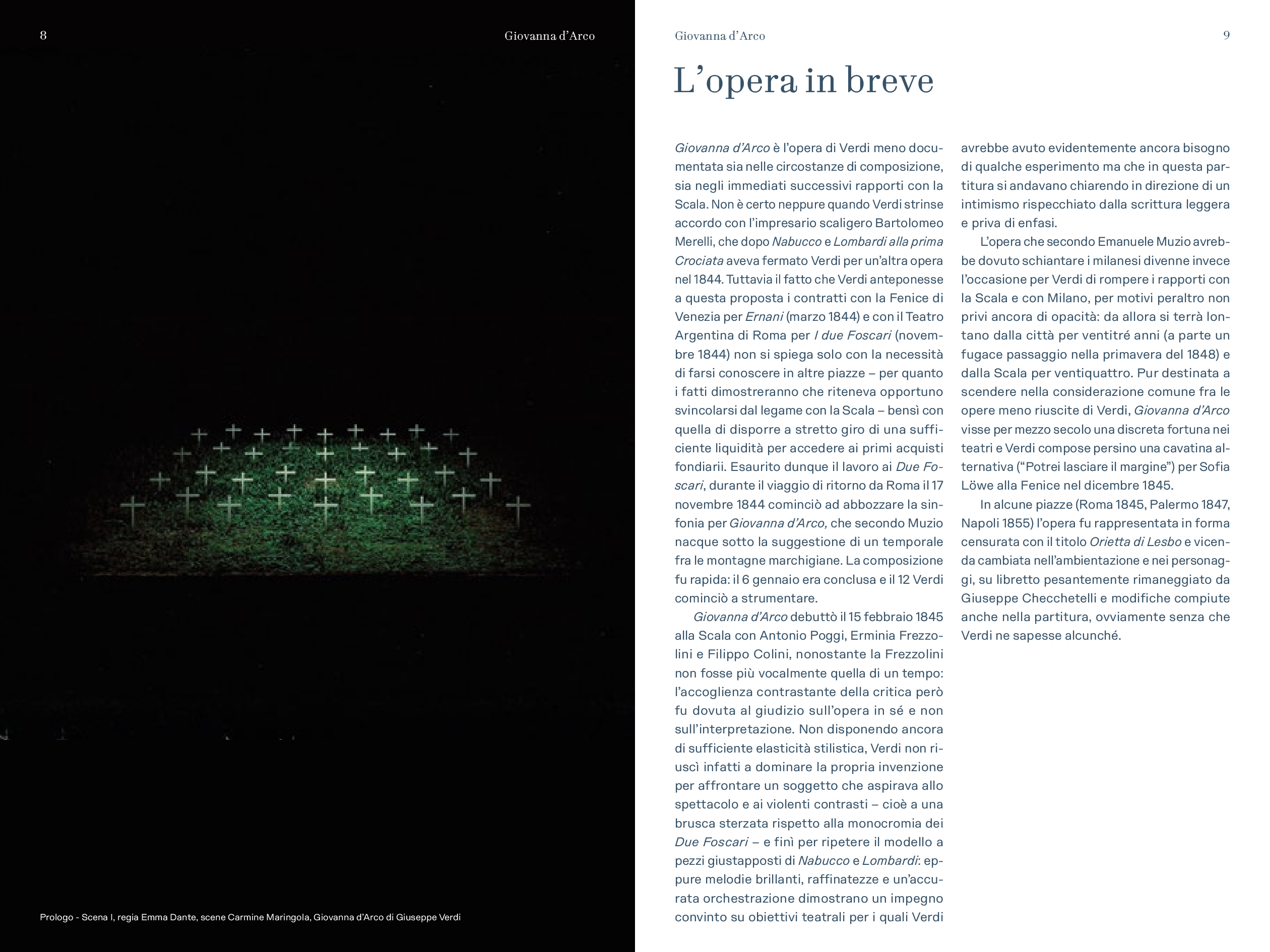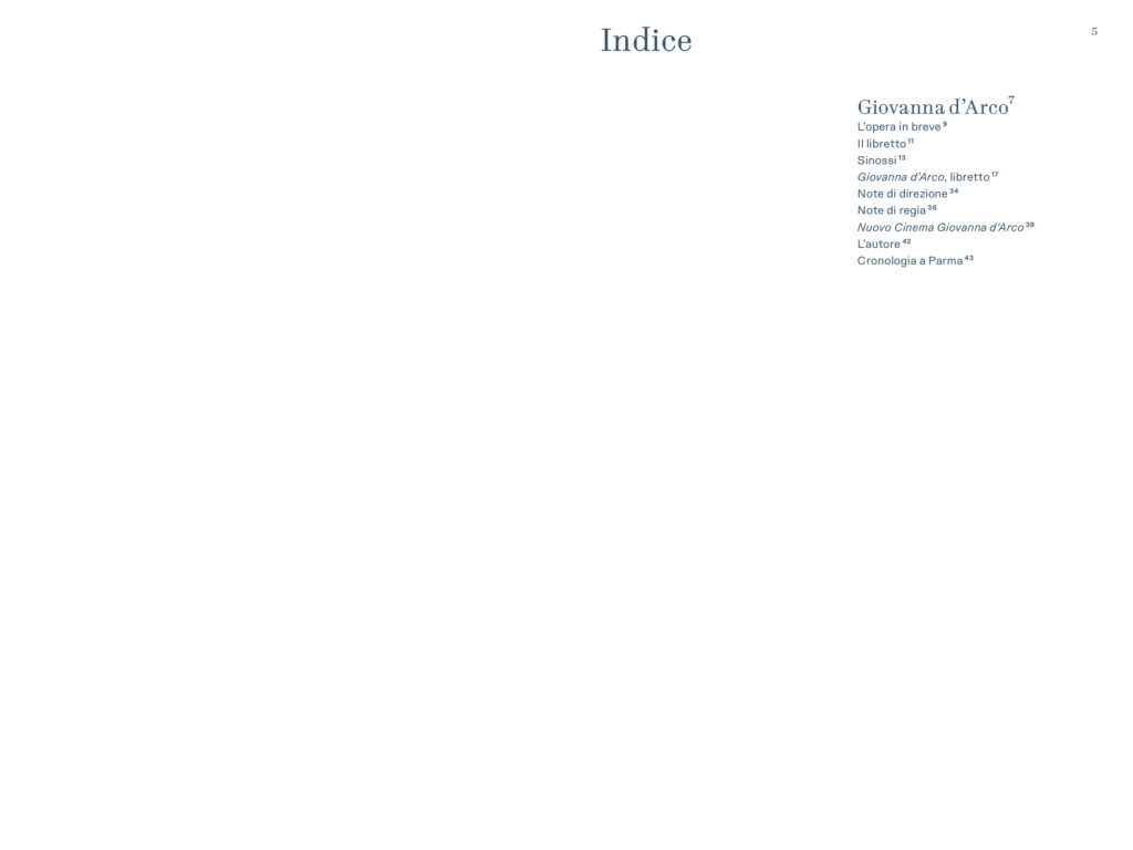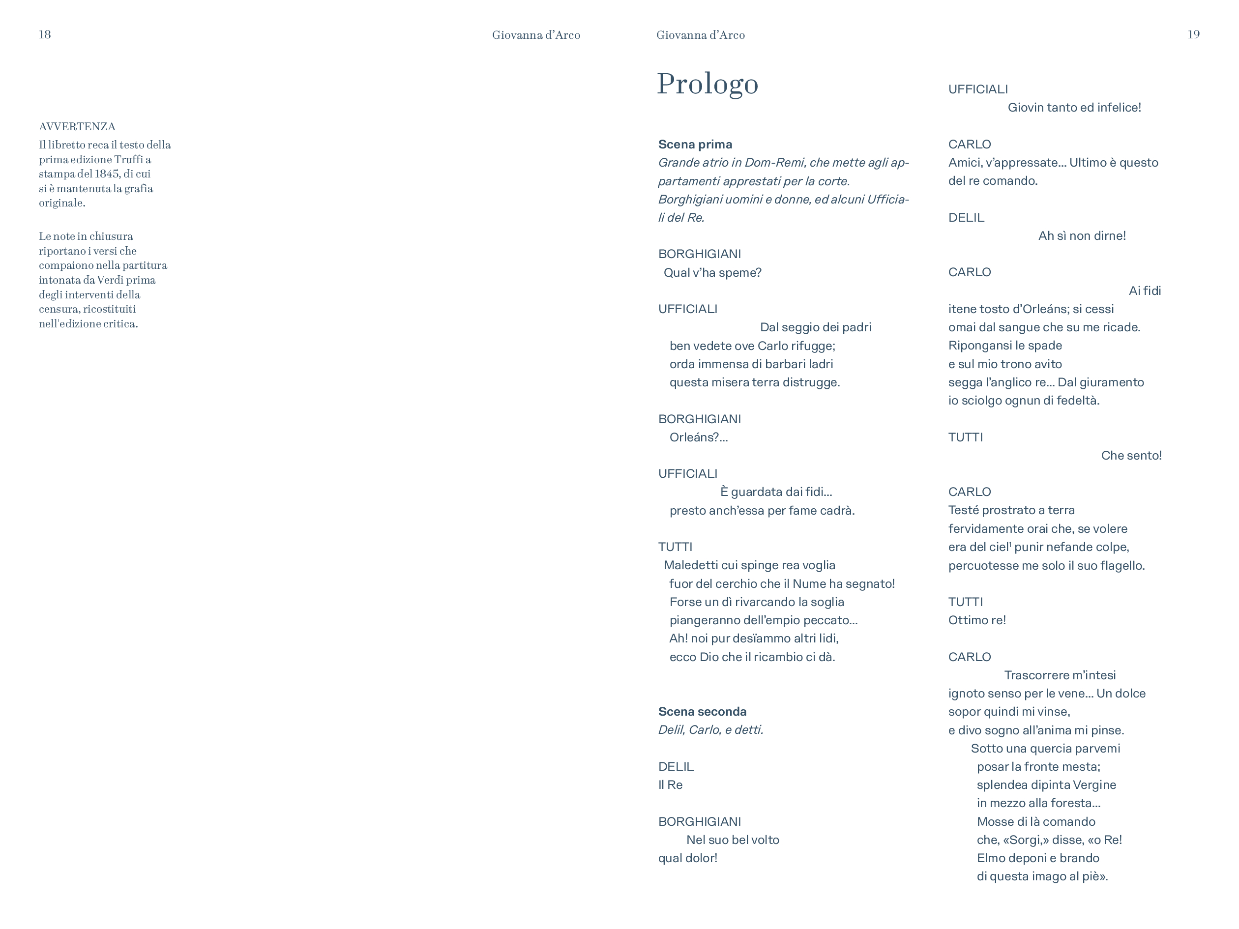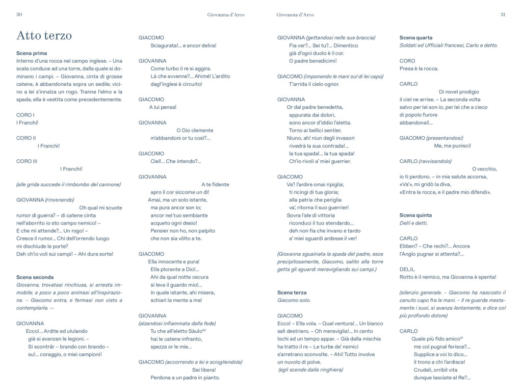 “Prima delle cinque opere di Verdi dedicate nel titolo ad un personaggio femminile e primo contatto di Verdi con Schiller – scrive Alessio Vlad, Direttore artistico del Teatro Regio. Opera affascinante e molto particolare per la capacità di far convivere elementi tra loro contrastanti: mondo terreno e mondo ultraterreno, sacro e demoniaco, serenità bucolica e violenza della guerra, rivalse patriottiche e vicende affettive; tutto dominato, poi, dal quel contrasto tra padre e figlia presente in tutta la produzione verdiana e che nel Lear di Shakespeare troverà sempre un ideale punto di riferimento. È un’opera, quindi, che si caratterizza innanzitutto nell’esistenza di contrasti, dove la protagonista è una donna che diventa simbolo, quando, con forza, affronta un conflitto in cui si scindono valori diversi e contrastanti a partire da quello tra il corpo e lo spirito. Conflitto teatralmente rappresentato dalla presenza di quel mondo sovrannaturale abitato da angeli e demoni e dal confronto che questi hanno con le vicende terrene, e viceversa. Sotto questo punto di vista è un’opera sorprendente, non convenzionale, che cerca una sua dimensione, tutta a sé nella produzione verdiana, dove la musica riesce a combinare tanti elementi diversi definendoli in una sintesi compiuta. Musica trascinante, fin dalla celebre ouverture, e coinvolgente nel dare raffigurazione ai rapporti umani pervasi e circondati da un sentito afflato patriottico”.