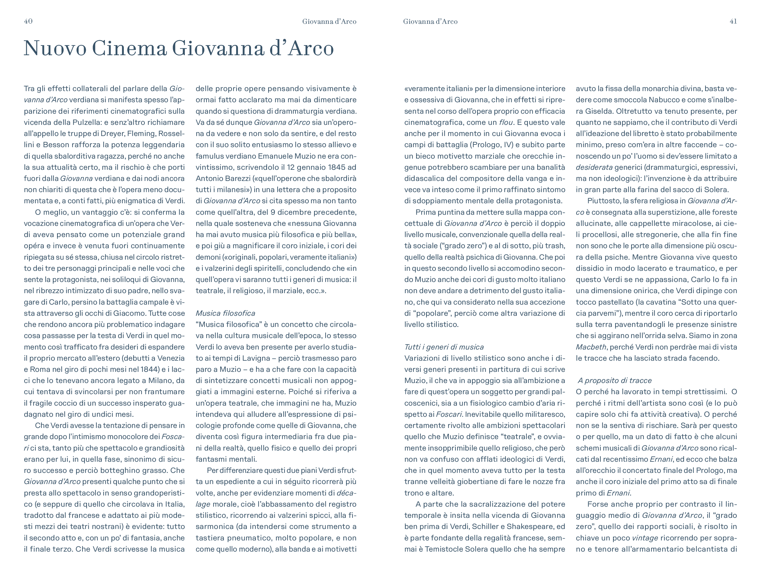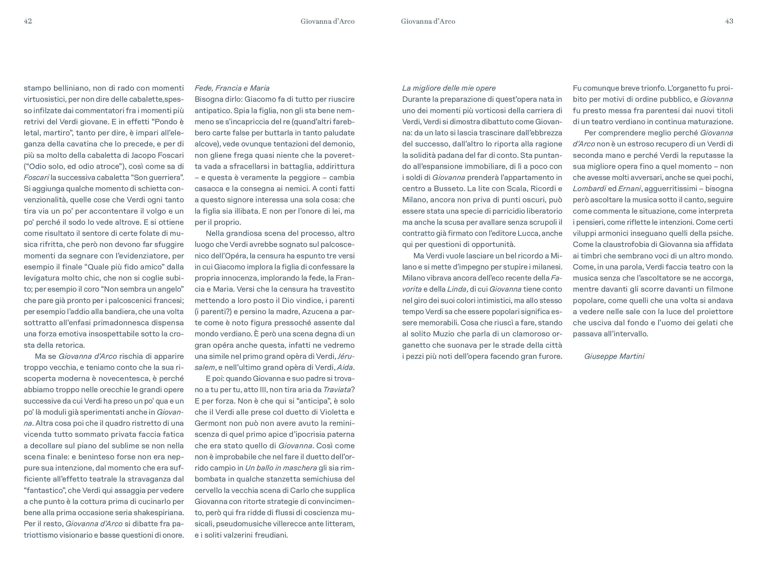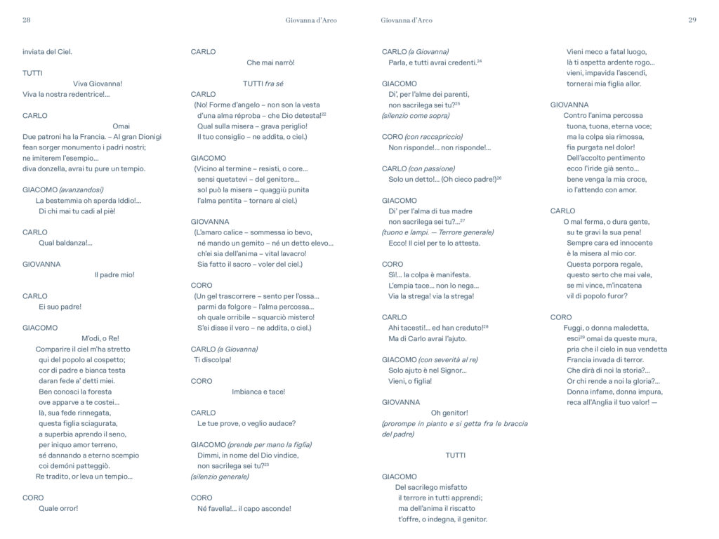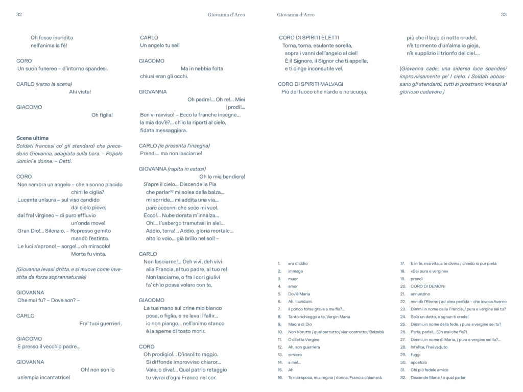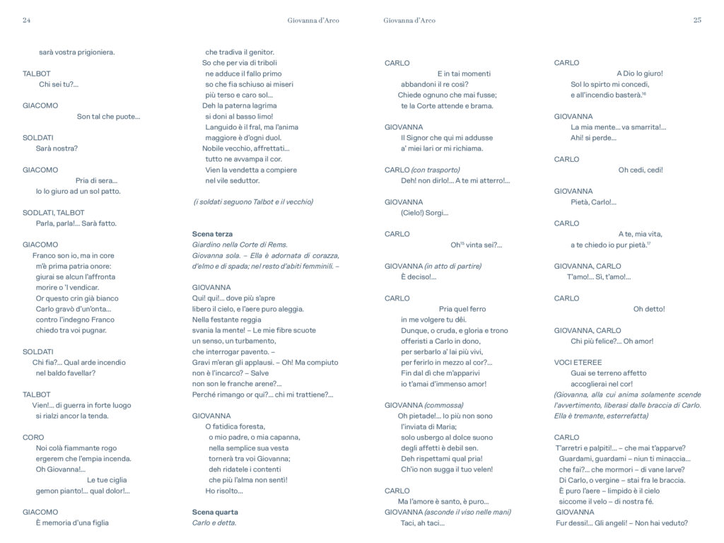 “Prima delle cinque opere di Verdi dedicate nel titolo ad un personaggio femminile e primo contatto di Verdi con Schiller – scrive Alessio Vlad, Direttore artistico del Teatro Regio. Opera affascinante e molto particolare per la capacità di far convivere elementi tra loro contrastanti: mondo terreno e mondo ultraterreno, sacro e demoniaco, serenità bucolica e violenza della guerra, rivalse patriottiche e vicende affettive; tutto dominato, poi, dal quel contrasto tra padre e figlia presente in tutta la produzione verdiana e che nel Lear di Shakespeare troverà sempre un ideale punto di riferimento. È un’opera, quindi, che si caratterizza innanzitutto nell’esistenza di contrasti, dove la protagonista è una donna che diventa simbolo, quando, con forza, affronta un conflitto in cui si scindono valori diversi e contrastanti a partire da quello tra il corpo e lo spirito. Conflitto teatralmente rappresentato dalla presenza di quel mondo sovrannaturale abitato da angeli e demoni e dal confronto che questi hanno con le vicende terrene, e viceversa. Sotto questo punto di vista è un’opera sorprendente, non convenzionale, che cerca una sua dimensione, tutta a sé nella produzione verdiana, dove la musica riesce a combinare tanti elementi diversi definendoli in una sintesi compiuta. Musica trascinante, fin dalla celebre ouverture, e coinvolgente nel dare raffigurazione ai rapporti umani pervasi e circondati da un sentito afflato patriottico”.