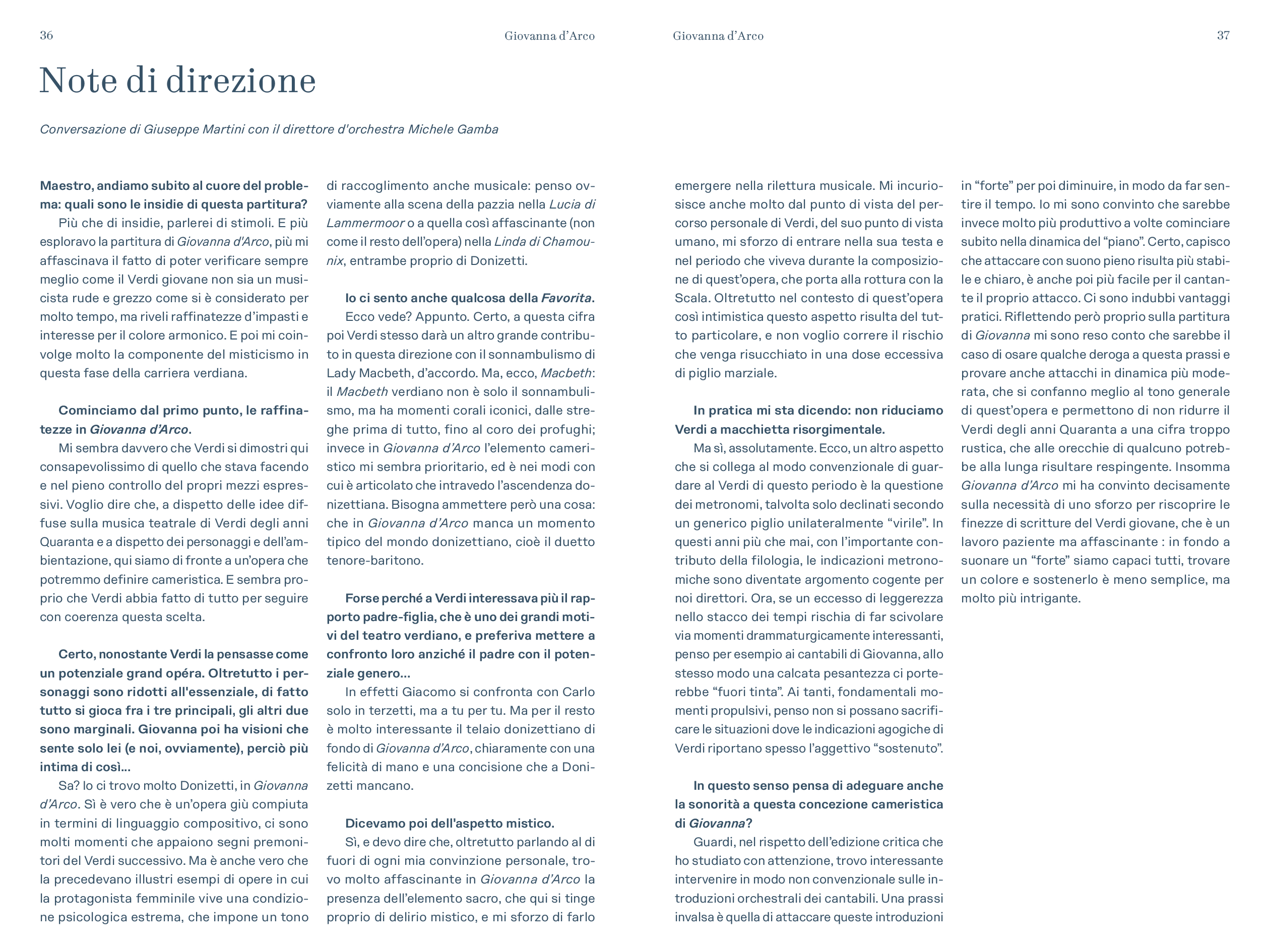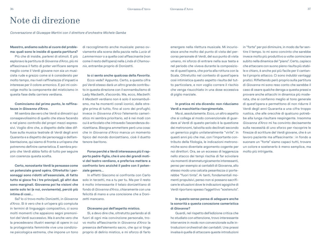“Più esploravo la partitura di Giovanna d’Arco, – scrive Michele Gamba – più mi affascinava il fatto di poter verificare sempre meglio come il Verdi giovane non sia un musicista rude e grezzo come si è considerato per molto tempo, ma riveli raffinatezze d’impasti e interesse per il colore armonico. E poi mi coinvolge molto la componente del misticismo in questa fase della carriera verdiana. Mi sembra davvero che Verdi si dimostri qui consapevolissimo di quello che stava facendo e nel pieno controllo dei propri mezzi espressivi. Voglio dire che, a dispetto delle idee diffuse sulla musica teatrale di Verdi degli anni Quaranta e a dispetto dei personaggi e dell’ambientazione, qui siamo di fronte a un’opera che potremmo definire cameristica. E sembra proprio che Verdi abbia fatto di tutto per seguire con coerenza questa scelta. […] Devo dire che, oltretutto parlando al di fuori di ogni mia convinzione personale, trovo molto affascinante in Giovanna d’Arco la presenza dell’elemento sacro, che qui si tinge proprio di delirio mistico, e mi sforzo di farlo emergere nella rilettura musicale. Mi incuriosisce anche molto dal punto di vista del percorso personale di Verdi, del suo punto di vista umano, mi sforzo di entrare nella sua testa e nel periodo che viveva durante la composizione di quest’opera, che porta alla rottura con la Scala. Oltretutto nel contesto di quest’opera così intimistica questo aspetto risulta del tutto particolare, e non voglio correre il rischio che venga risucchiato in una dose eccessiva di piglio marziale. […] Insomma Giovanna d’Arco mi ha convinto decisamente sulla necessità di uno sforzo per riscoprire le finezze di scritture del Verdi giovane, che è un lavoro paziente e affascinante: in fondo a suonare un “forte” siamo capaci tutti, trovare un colore e sostenerlo è meno semplice, ma molto più intrigante”.