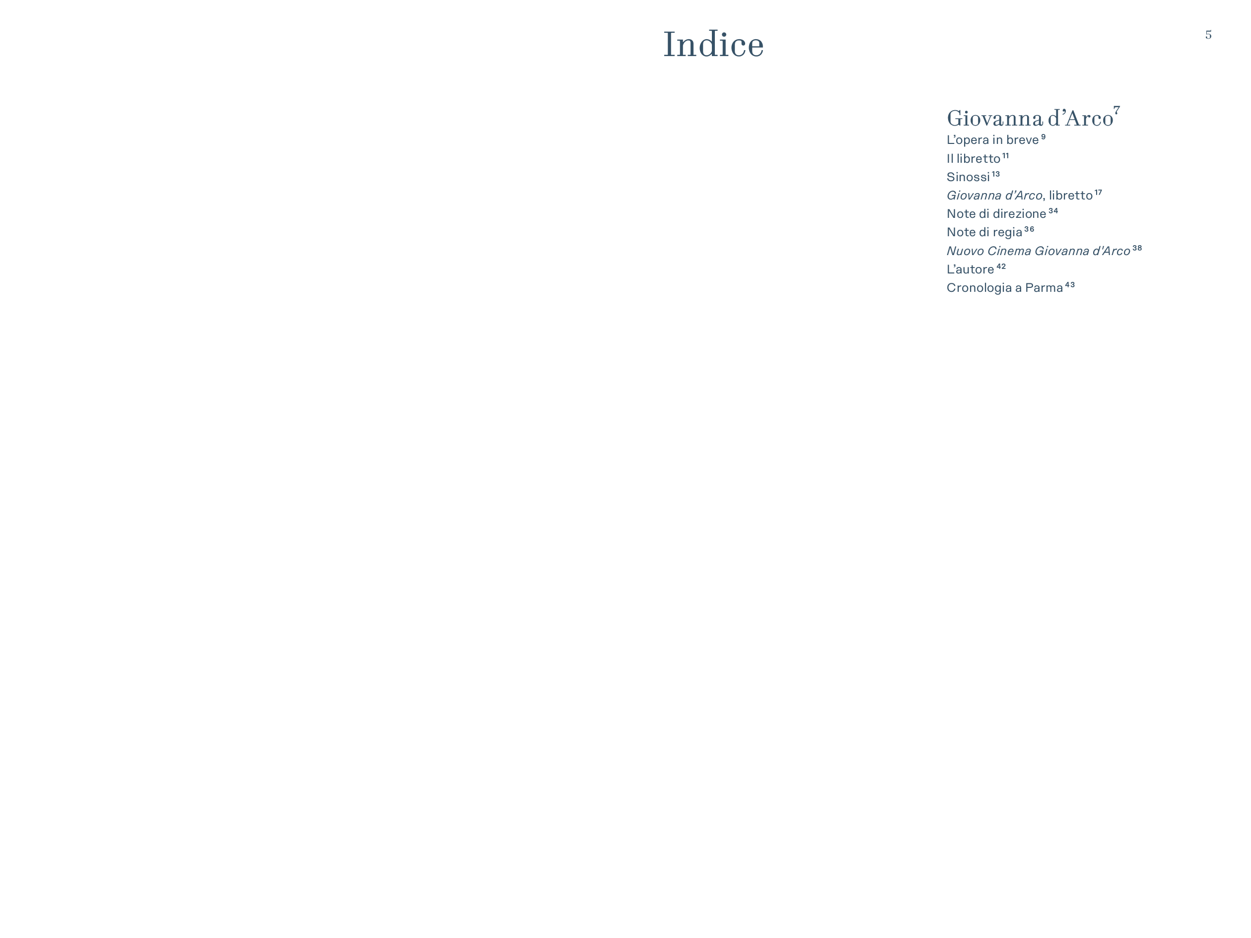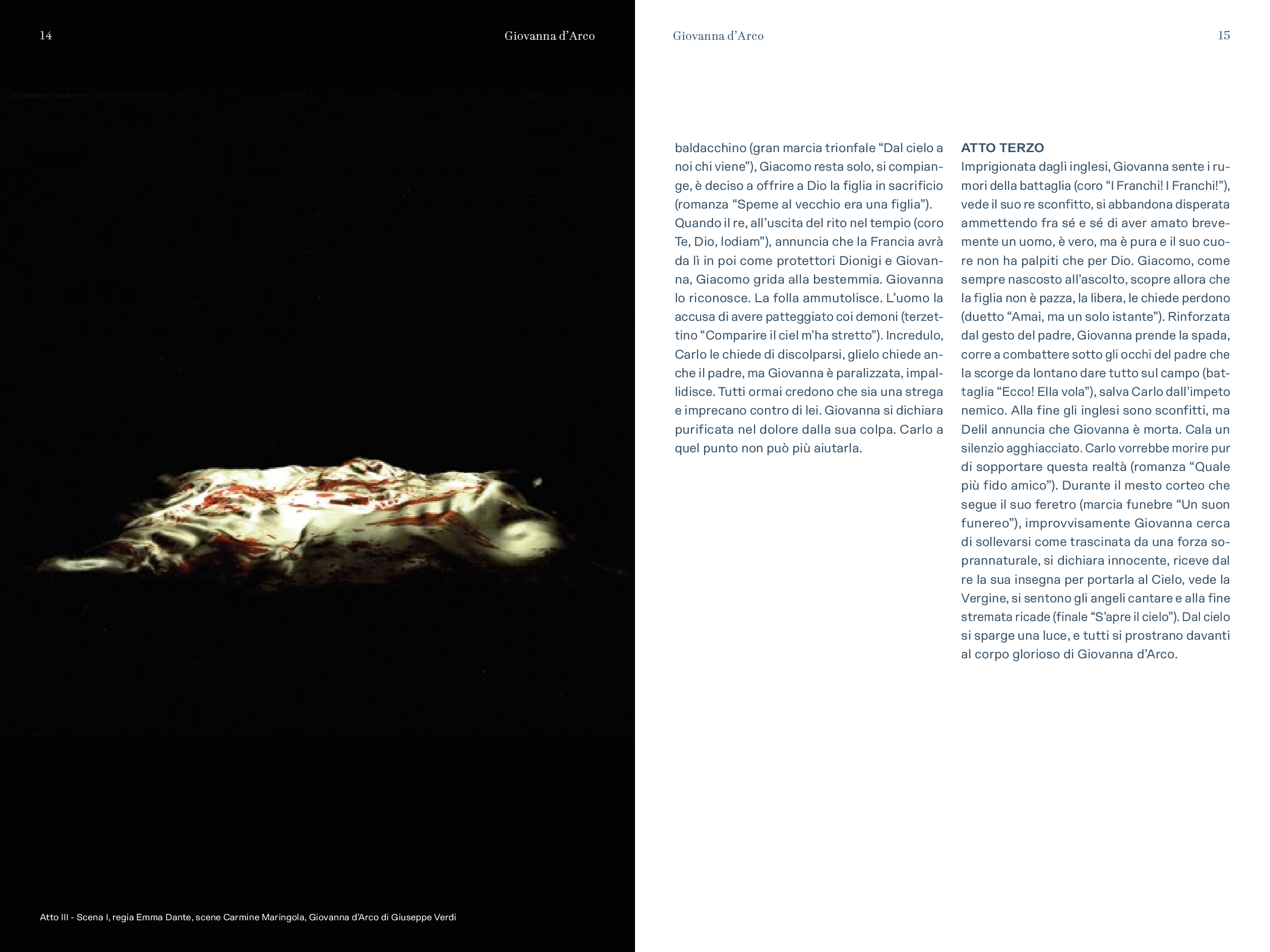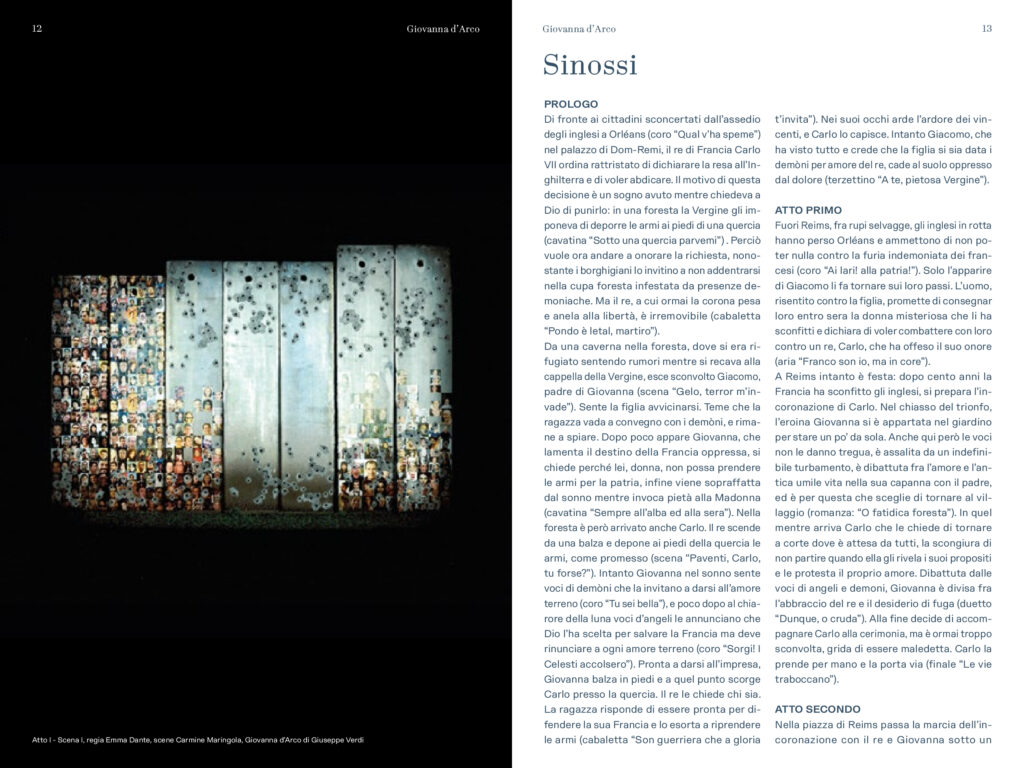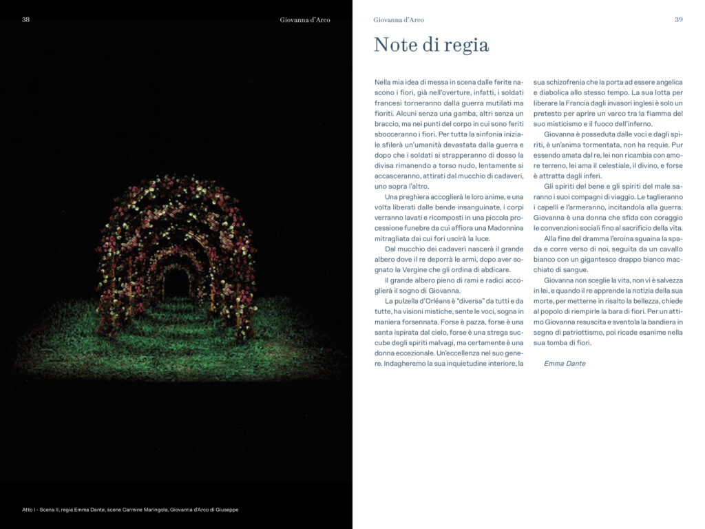 “Nuovo allestimento del Teatro Regio affidato ad una delle più interessanti e famose protagoniste del teatro di oggi: Emma Dante. Regista di teatro, di opera e di cinema, pluripremiata, amata, discussa, con un notevole senso visivo e grande personalità, punto di riferimento di un teatro che nello studio e nello scavo della tradizione trova tutti gli elementi e gli spunti per dire sempre qualcosa di nuovo, riuscendo sempre a proiettarli nella contemporaneità. Ogni volta in cui si è accostata al teatro musicale ha voluto sempre essere fedele e rispettosa della volontà drammaturgica dell’autore, senza mai però perdere di vista l’analisi e l’approfondimento dei temi a lei più cari come le relazioni familiari, il rapporto tra la vita e la morte, i contrasti sociali, la dissacrazione del potere: tutti temi che Verdi ha affrontato in tutte le sue opere a cominciare proprio da Giovanna d’Arco”.