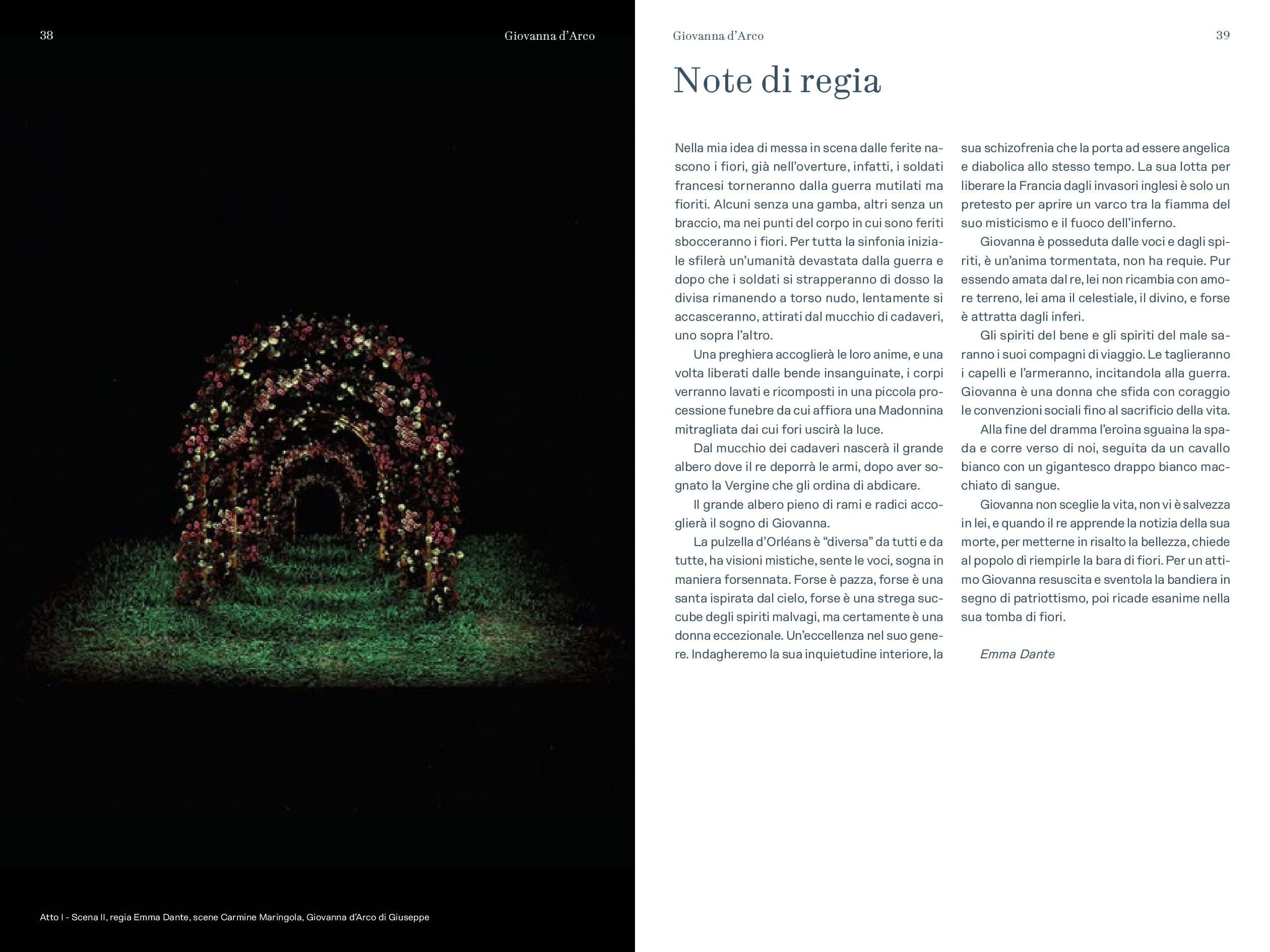 “Nella mia idea di messa in scena dalle ferite nascono i fiori, – scrive Emma Dante – già nell’overture, infatti, i soldati francesi torneranno dalla guerra mutilati ma fioriti. Alcuni senza una gamba, altri senza un braccio, ma nei punti del corpo in cui sono feriti sbocceranno i fiori. Per tutta la sinfonia iniziale sfilerà un’umanità devastata dalla guerra e dopo che i soldati si strapperanno di dosso la divisa rimanendo a torso nudo, lentamente si accasceranno, attirati dal mucchio di cadaveri, uno sopra l’altro. Una preghiera accoglierà le loro anime, e una volta liberati dalle bende insanguinate, i corpi verranno lavati e ricomposti in una piccola processione funebre da cui affiora una Madonnina mitragliata, dai cui fori uscirà la luce. Dal mucchio dei cadaveri nascerà il grande albero dove il re deporrà le armi, dopo aver sognato la Vergine che gli ordina di abdicare. Il grande albero pieno di rami e radici accoglierà il sogno di Giovanna”.