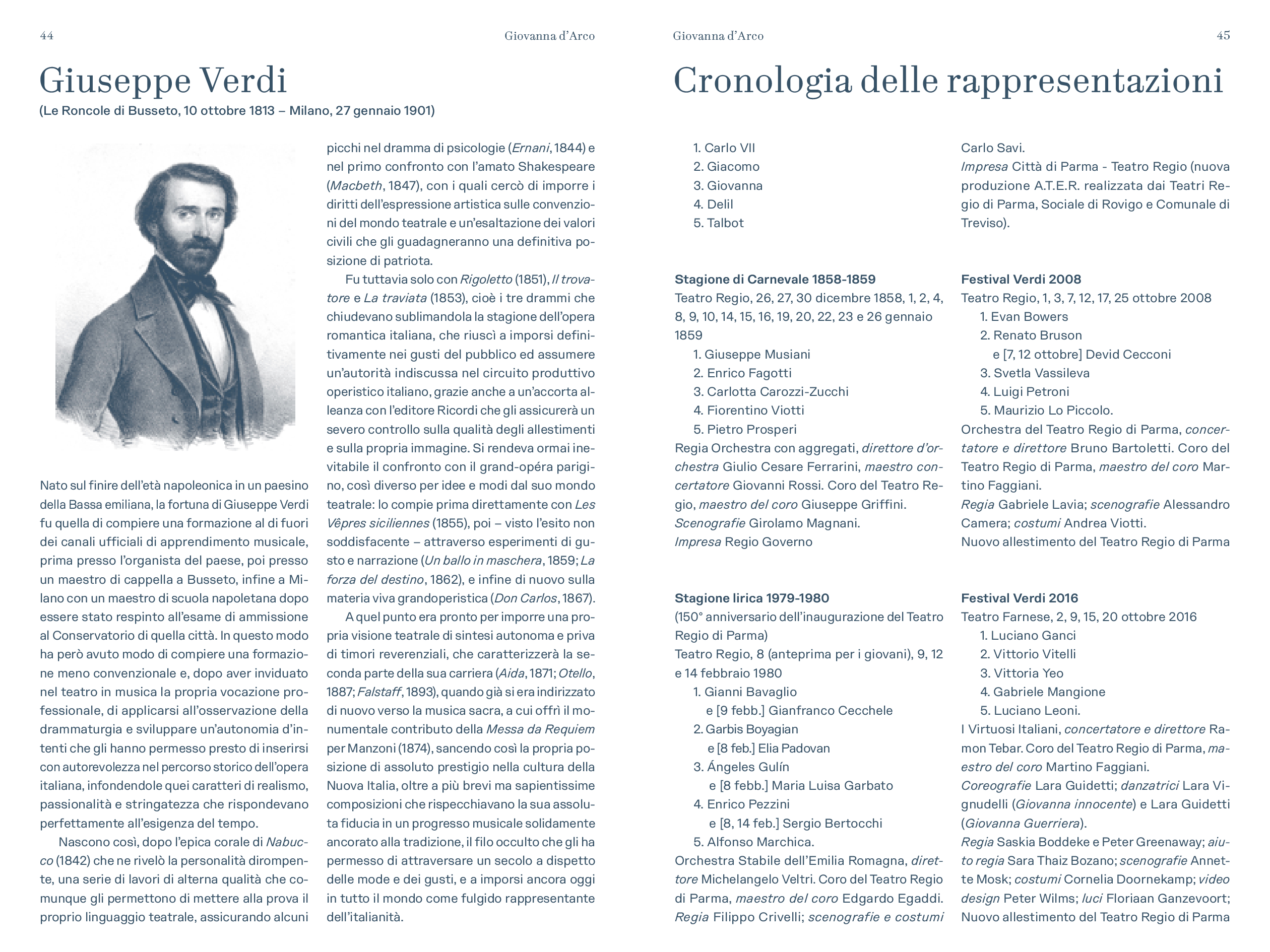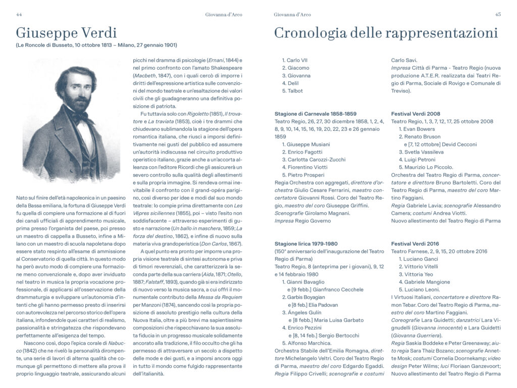 Michele Gamba, al suo debutto al Teatro Regio, dirige l’opera per la prima volta, che è eseguita nell’edizione critica a cura di Alberto Rizzuti, sul podio della Filarmonica Arturo Toscanini e del Coro del Teatro Regio di Parma preparato da Martino Faggiani.Protagonisti Luciano Ganci (Carlo VII), Nino Machaidze (Giovanna), Ariunbaatar Ganbaatar (Giacomo), Francesco Congiu (Delil, già Allievo dell’Accademia Verdiana), Krzysztof Bączyk (Talbot, al debutto nel ruolo).