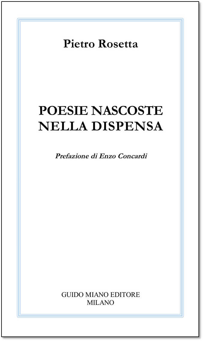Pietro Rosetta, Poesie nascoste nella dispensa, prefazione di Enzo Concardi, Guido Miano Editore, Milano 2024, pp. 88, isbn 979-12-81351-21-9, mianoposta@gmail.com.