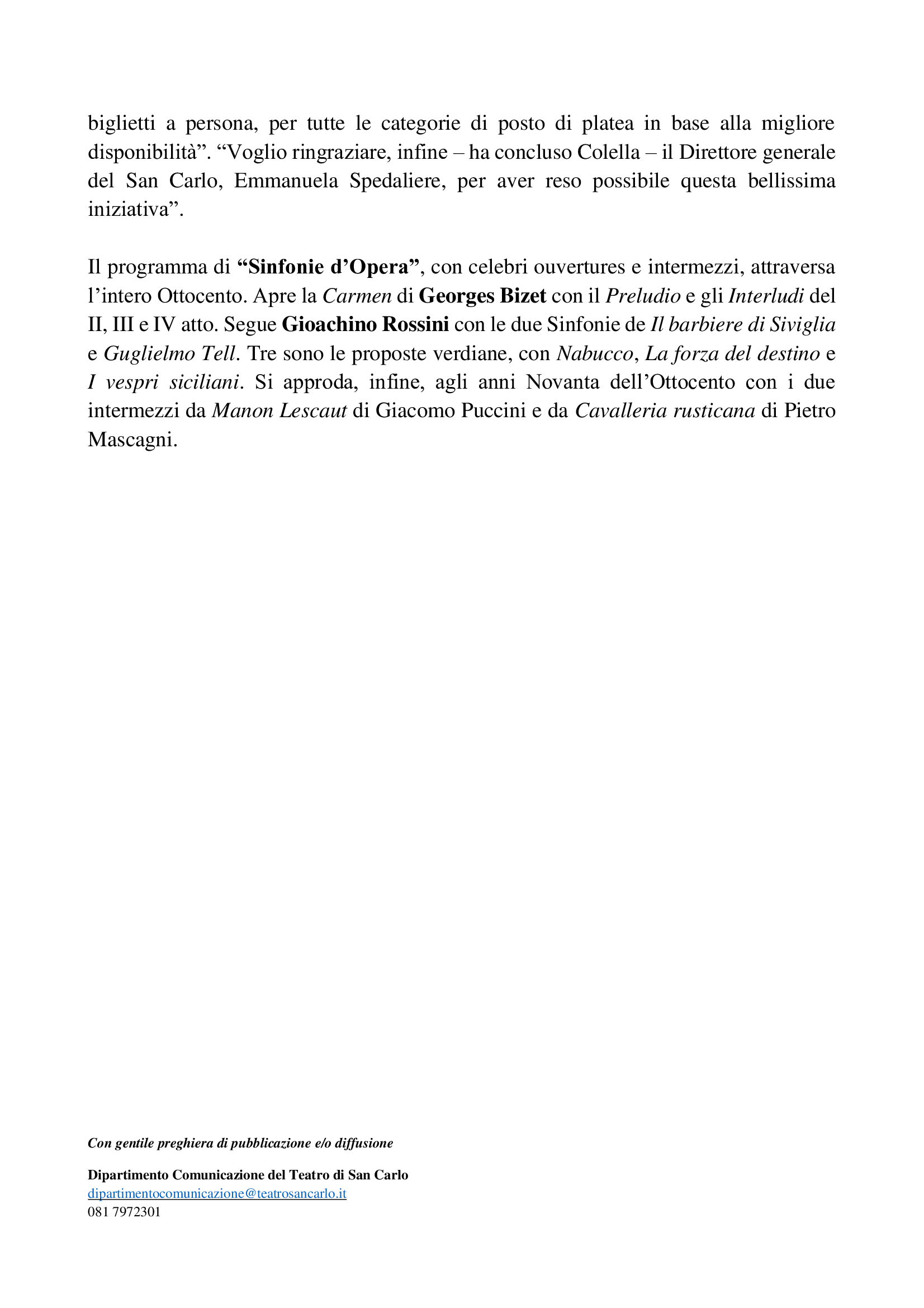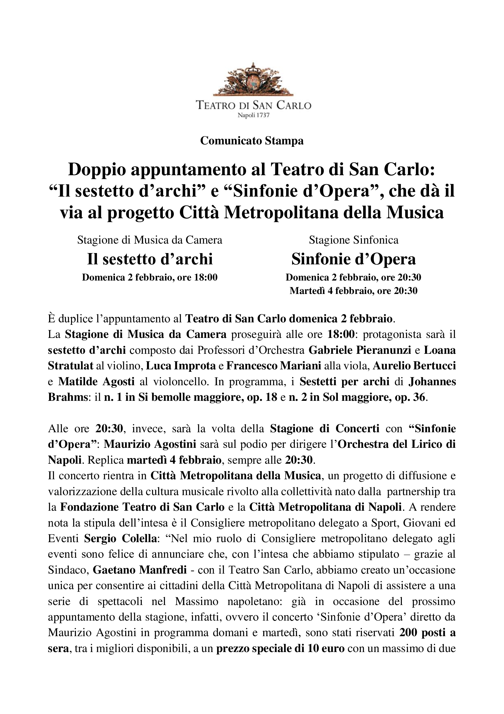 Il concerto rientra in Città Metropolitana della Musica, un progetto di diffusione e valorizzazione della cultura musicale rivolto alla collettività nato dalla partnership tra la Fondazione Teatro di San Carlo e la Città Metropolitana di Napoli. A rendere nota la stipula dell’intesa è il Consigliere metropolitano delegato a Sport, Giovani ed EventiSergio Colella: “Nel mio ruolo di Consigliere metropolitano delegato agli eventi sono felice di annunciare che, con l’intesa che abbiamo stipulato – grazie al Sindaco, Gaetano Manfredi – con il Teatro San Carlo, abbiamo creato un’occasione unica per consentire ai cittadini della Città Metropolitana di Napoli di assistere a una serie di spettacoli nel Massimo napoletano: già in occasione del prossimo appuntamento della stagione, infatti, ovvero il concerto ‘Sinfonie d’Opera’ diretto da Maurizio Agostini in programma domani e martedì, sono stati riservati 200 posti a sera, tra i migliori disponibili, a un prezzo speciale di 10 euro con un massimo di due biglietti a persona, per tutte le categorie di posto di platea in base alla migliore disponibilità”. “Voglio ringraziare, infine – ha concluso Colella – il Direttore generale del San Carlo, Emmanuela Spedaliere, per aver reso possibile questa bellissima iniziativa”.