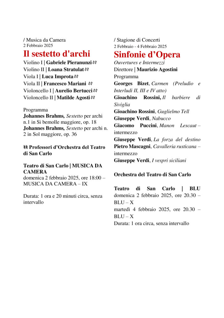 | Stagione di Musica da Camera Il sestetto d’archi Domenica 2 febbraio, ore 18:00 | Stagione Sinfonica Sinfonie d’Opera Domenica 2 febbraio, ore 20:30 Martedì 4 febbraio, ore 20:30 |