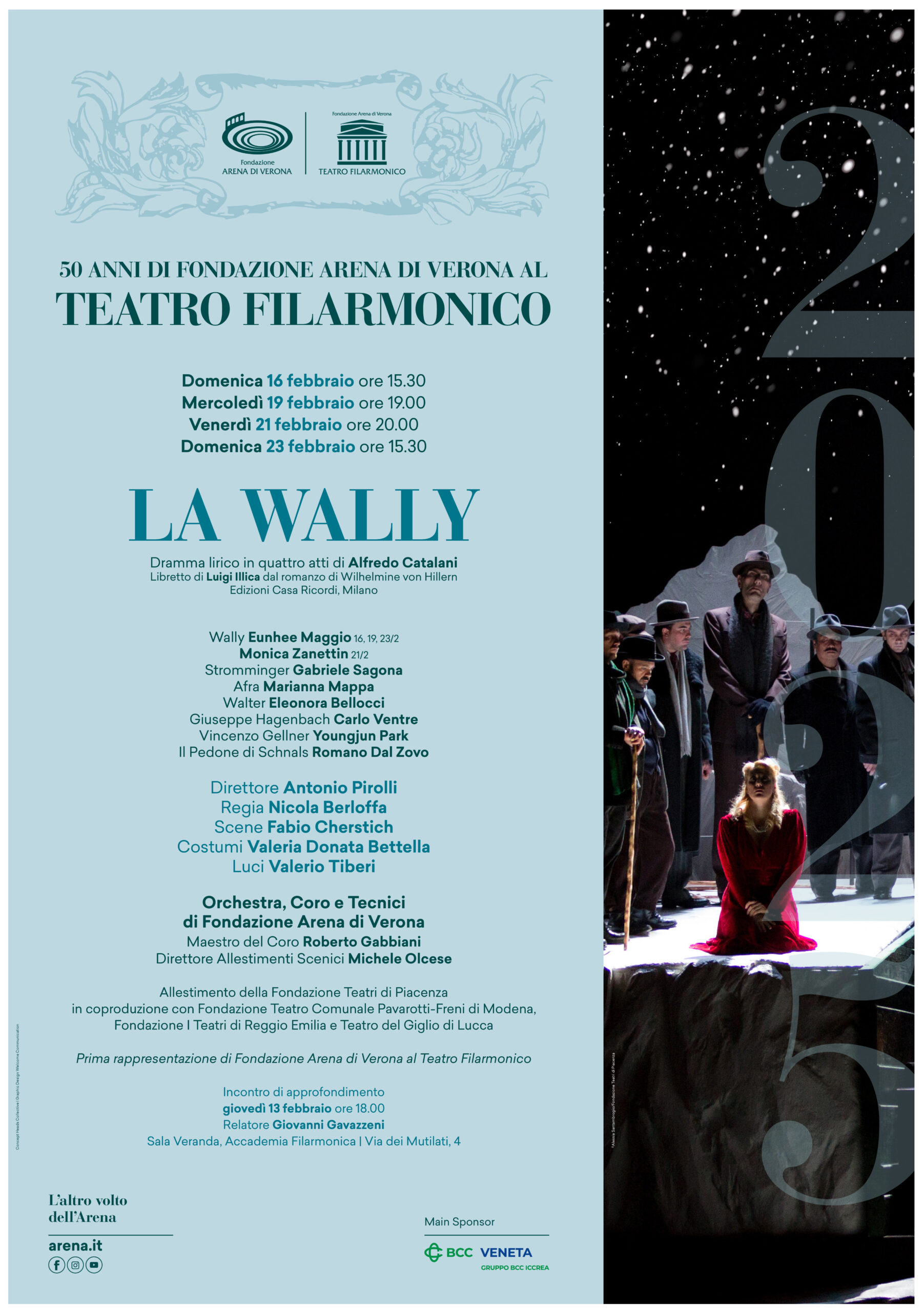Dopo il successo del primo appuntamento nella nuova sede, torna l’incontro gratuito di approfondimento, che precede la messa in scena di ogni opera in cartellone, con i grandi nomi della critica musicale nazionale. In collaborazione con l’Accademia Filarmonica di Verona, giovedì 13 febbraio alle 18 nella prestigiosa Sala Veranda (via Mutilati 4), il giornalista e critico musicale Giovanni Gavazzeni, anche autore del programma di sala, presenterà La Wally, offrendo al pubblico una lettura e una introduzione all’opera. Ingresso libero fino ad esaurimento posti.