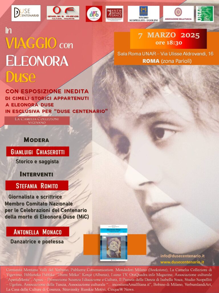 Un evento esclusivo dedicato alla leggendaria Eleonora Duse si terrà il 7 marzo a Roma presso la Sala Roma UNAR, in via Aldrovandi n. 16, zona Parioli, nell’ambito delle celebrazioni per il centenario della sua scomparsa. L’incontro, intitolato Duse Centenario – In viaggio con Eleonora Duse, offrirà un’occasione straordinaria per approfondire la vita e l’arte della grande attrice italiana attraverso testimonianze, studi e, soprattutto, la presentazione in anteprima mondiale di cimeli mai mostrati al pubblico.