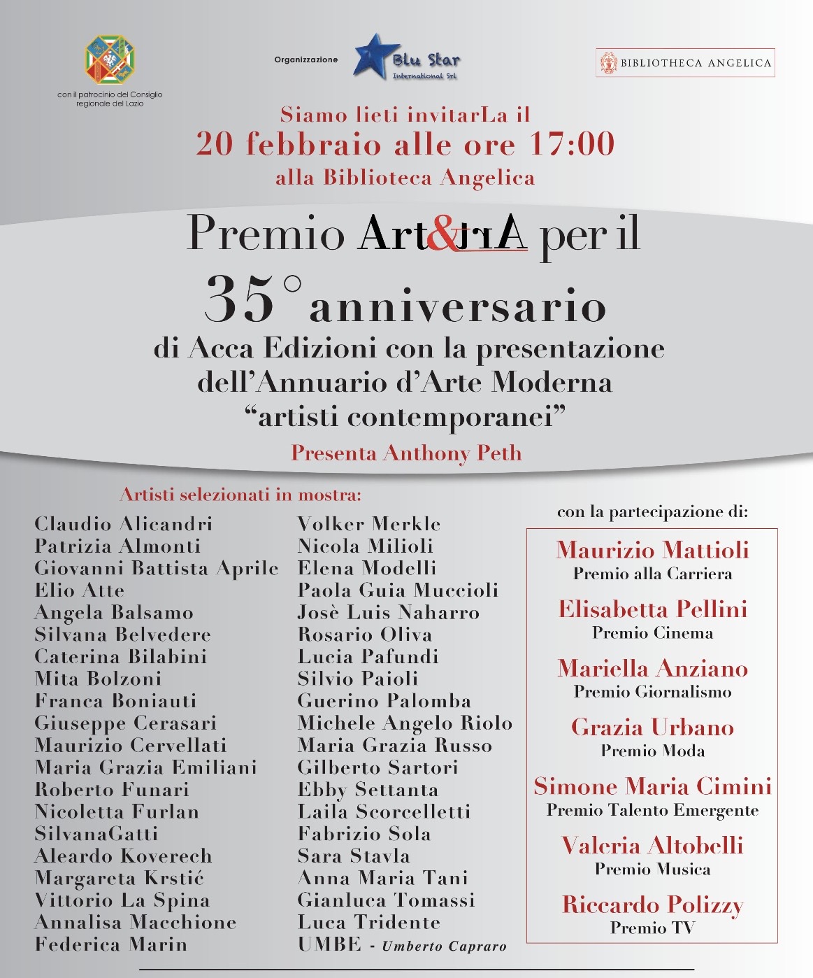 “Premio Art&Art targato Blu Star International” è il titolo della mostra collettiva che verrà inaugurata giovedì 20 febbraio 2025 alle ore 17:00 con presentazione presso la prestigiosa Biblioteca Angelica – via Piazza di S. Agostino 8 a Roma.