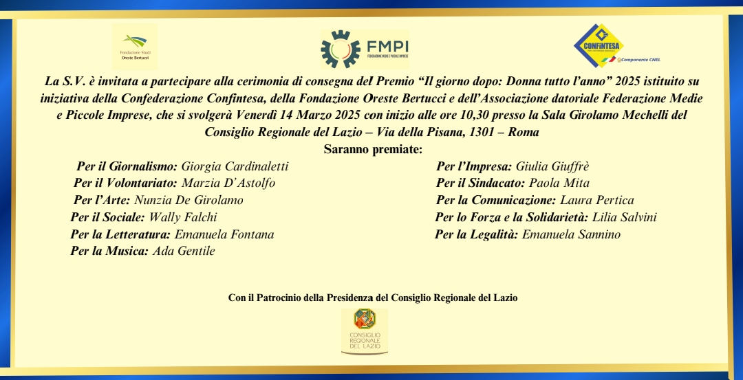 Infine, la compositrice Ada Gentile sarà tra le insignite del Premio “Il giorno dopo: Donna tutto l’anno” 2025 per la Musica, che si terrà a Roma il 14 marzo alle 10:30 presso il Consiglio Regionale del Lazio, Sala G. Mechelli. Nel corso dell’evento saranno premiate donne che con il loro talento si sono distinte nei diversi campi di attività.